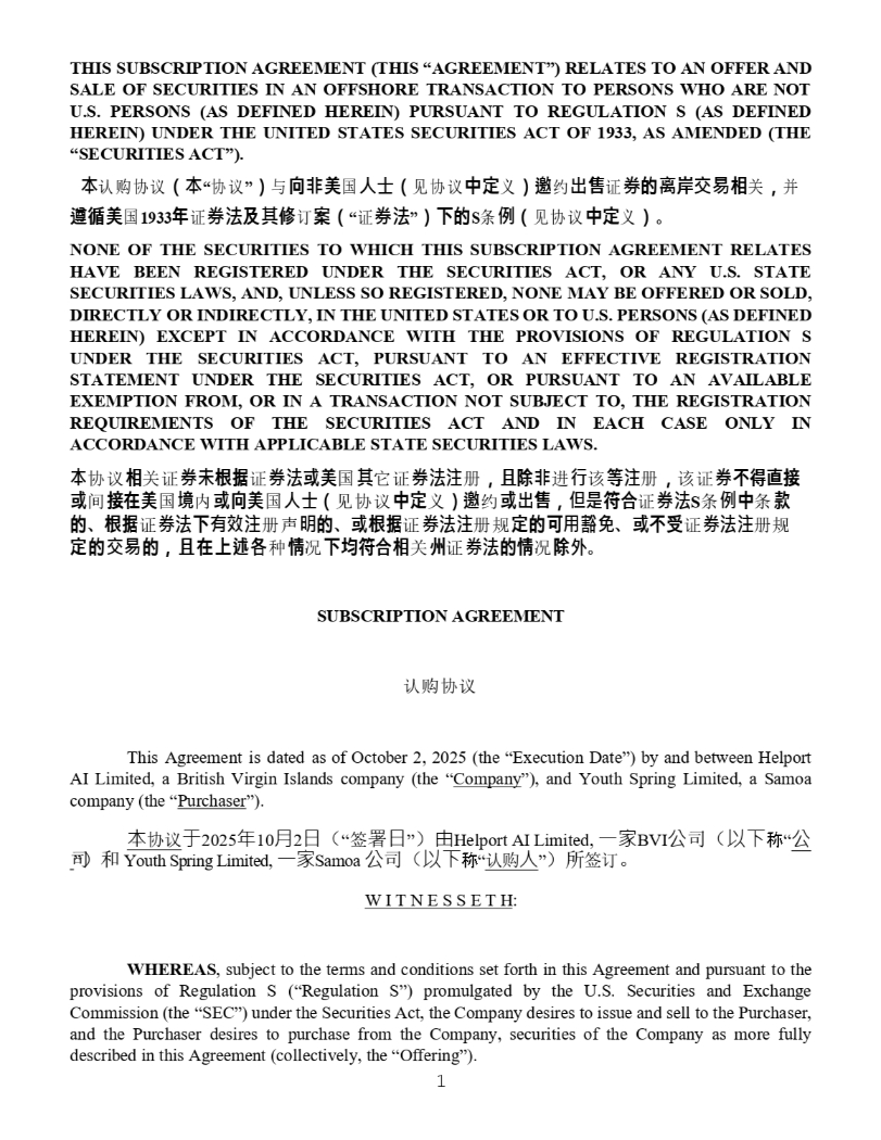 THIS SUBSCRIPTION AGREEMENT (THIS “AGREEMENT”) RELATES TO AN OFFER AND SALE OF SECURITIES IN AN OFFSHORE TRANSACTION TO PERSONS WHO ARE NOT U . S . PERSONS (AS DEFINED HEREIN) PURSUANT TO REGULATION S (AS DEFINED HEREIN) UNDER THE UNITED STATES SECURITIES ACT OF 1933 , AS AMENDED (THE “SECURITIES ACT”) . 㗪 䇔䍝ॿ䇞 ポ 㗪 “ ॿ䇞 ” マ о 㔤 燝 䖤 ഭ ᵸ➩ ポ 㿱ॿ䇞 ㊄㟍 ѹ マ 䭘 㓖 ₸ 㖅 䇱 䉵 䡹 㡏 ᵢ㓑 䊤 ޣ メ ᒦ 䭐㥭䖤 ഭ 1933 㣞 䇱 㮓 㓺 ‴ ㍈ 䇒 㴓 ポ “ 䇱 㮓 ” マ ㉸䉵 S ᶑ ṉ ポ 㿱ॿ䇞 ㊄㟍 ѹ マ ೲ NONE OF THE SECURITIES TO WHICH THIS SUBSCRIPTION AGREEMENT RELATES HAVE BEEN REGISTERED UNDER THE SECURITIES ACT, OR ANY U . S . STATE SECURITIES LAWS, AND, UNLESS SO REGISTERED, NONE MAY BE OFFERED OR SOLD, DIRECTLY OR INDIRECTLY, IN THE UNITED STATES OR TO U . S . PERSONS (AS DEFINED HEREIN) EXCEPT IN ACCORDANCE WITH THE PROVISIONS OF UNDER THE SECURITIES ACT, PURSUANT TO AN EFFECTIVE STATEMENT UNDER THE SECURITIES ACT, OR PURSUANT TO REGULATION S REGISTRATION AN AVAILABLE EXEMPTION FROM, OR IN A TRANSACTION NOT SUBJECT TO, THE REGISTRATION REQUIREMENTS OF THE SECURITIES ACT AND IN EACH CASE ONLY IN ACCORDANCE WITH APPLICABLE STATE SECURITIES LAWS . 㗪 ॿ䇞 䊤 ޣ䇱 㗨 㴉㬋 䇱 㮓 㪂䖤 ഭ ‴ ᆳ䇱 㮓㮦 メ ㉻䳙 燝 䘋 圊 䈕 䐦 㮦 メ 䈕䇱 ㉹㥢䊣㬦 㪂 䰤 㬦㘪䖤 ഭ ❁ 㪂㔤䖤 ഭ ᵸ➩ ポ 㿱ॿ䇞 ㊄㟍 ѹ マ 䭘 㓖 㪂 ₸ 㖅 メ Ḅ㓭 䐚㔛 䇱 㮓 S ᶑ ṉ ㊄ ᶑ 㸌 䉵 ೱ 㴉㬋 䇱 㮓 ㉸ 㗇㐆㮦 ༠ 㓌 䉵 ೱ 㪂㴉㬋 䇱 㮓㮦 㿴 㟍䉵㔏 䏦 䧢 ೱ 㪂㉹㓿 䇱 㮓㮦 㿴 㟍䉵 ᵢ㓑 䉵 メ ㉻㘪㉷䬆㔚 㧨 ߥ ㉸㘳䐚㔛䊤 ޣ 㢟 䇱 㮓 䉵㧨 ߥ 䳙 ⟔ ೲ SUBSCRIPTION AGREEMENT 䇔䍝ॿ䇞 This Agreement is dated as of October 2 , 2025 (the “Execution Date”) by and between Helport AI Limited, a British Virgin Islands company (the “ Company ”), and Youth Spring Limited, a Samoa company (the “ Purchaser ”) . 㜓 ॿ䇞 ṵ 2025 ⹛ 10 㛯 2 㗌 ˄ “ ㆮ 㖢 㗌 ” ˅ 䔘 Helport AI Limited, ᷧ⮝ BVI ⅓ ਨ ˄ Ọᷲ ⛠ “ ⅓ ਨ ” ˅ ઼ Youth Spring Limited , ᷧ⮝ Samoa ⅓ ਨ ˄ Ọᷲ ⛠ “ 䇔䍝 ạ ” ˅ ᡰ ㆮ䇒 DŽ W I T N E S S E T H : WHEREAS , subject to the terms and conditions set forth in this Agreement and pursuant to the provisions of Regulation S (“Regulation S”) promulgated by the U . S . Securities and Exchange Commission (the “SEC”) under the Securities Act, the Company desires to issue and sell to the Purchaser, and the Purchaser desires to purchase from the Company, securities of the Company as more fully described in this Agreement (collectively, the “Offering”) . 1