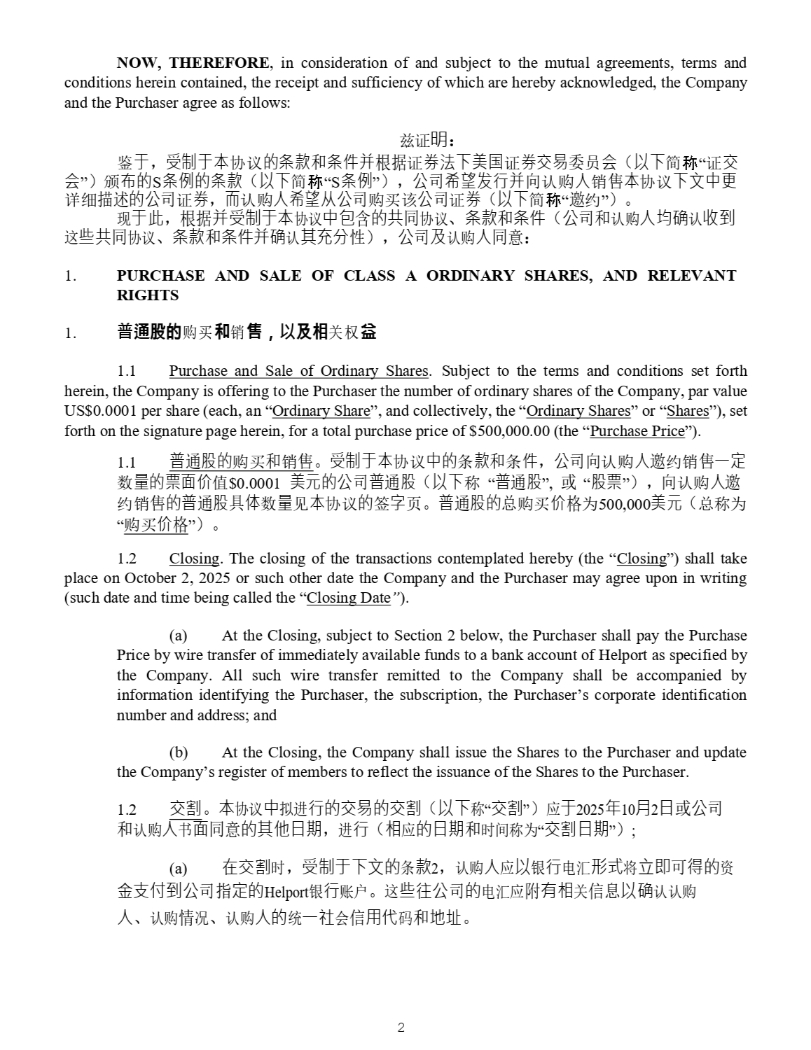 2 NOW, THEREFORE , in consideration of and subject to the mutual agreements, terms and conditions herein contained, the receipt and sufficiency of which are hereby acknowledged, the Company and the Purchaser agree as follows : ީ䇱 㗵 ˖ 䢤 ṵ ˈ ⎾∝ṵ㜓 ॿ䇞 䙫㝈㬥 ઼ 㝈ờ⹝ ṩᦞ 䇱 ∟㲼ᷲ併⛤ 䇱 ∟ẋ㗺 င ઈ ἁ ˄ Ọᷲ ㆰ ⛠ “ 䇱 ẋ ἁ ” ˅ 亱 ⷪ䙫 S 㝈ὲ䙫㝈㬥 ˄ Ọᷲ ㆰ ⛠ “S 㝈ὲ ” ˅ ˈ ⅓ ਨ ⷳ㜂⎸堳⹝ ੁ 䇔䍝 ạ 䬰 㜓 ॿ䇞 ᷲ狄Ḕ㛛 䈖㓶 ᧿䘠 䙫⅓ ਨ 䇱 ∟ ˈ 俳 䇔䍝 ạⷳ㜂ẵ⅓ ਨ 䍝Ҡ䈕 ⅓ ਨ 䇱 ∟ ˄ Ọᷲ ㆰ ⛠ “ 䚰 㓖 ” ˅ DŽ ⧠ ṵ㭋 ˈ ṩᦞ ⹝⎾∝ṵ㜓 ॿ䇞 Ḕ⋬ ਜ਼ 䙫⅘ ਼ ॿ䇞 ǃ 㝈㬥 ઼ 㝈ờ ˄ ⅓ ਨ઼ 䇔䍝 ạ✮䡕 䇔 㔝∗ 䘉 Ẃ⅘ ਼ ॿ䇞 ǃ 㝈㬥 ઼ 㝈ờ⹝䡕 䇔 ⅝ℬ⇭ ᙗ ˅ˈ ⅓ ਨ ⎱ 䇔䍝 ạ ਼ ˖ 1. PURCHASE AND SALE OF CLASS A ORDINARY SHARES, AND RELEVANT RIGHTS 㔬 䬠䘎䉵 䍝Ҡ 㕒 䬰 㖅 メ ᶣ 㓺䊤 ޣᵳ 䊍 1.1 Purchase and Sale of Ordinary Shares . Subject to the terms and conditions set forth 1. herein, the Company is offering to the Purchaser the number of ordinary shares of the Company, par value US $ 0 . 0001 per share (each, an “ Ordinary Share ”, and collectively, the “ Ordinary Shares ” or “ Shares ”), set forth on the signature page herein, for a total purchase price of $ 500 , 000 . 00 (the “ Purchase Price ”) . 1. 㙕 䙊 傈䙫 䍝Ҡ ઼ 䬰 DŽ ⎾∝ṵ㜓 ॿ䇞 Ḕ䙫 ᶑ 㬥 ઼ ᶑ ờ ˈ ⅓ ਨੁ 䇔䍝 ạ 䚰 㓖䬰 ᷧ⮁ ᮠ 憶䙫䥏杉Ở ٬ $0.0001 併K䙫⅓ ਨ 㙕 䙊 傈 ˄ Ọᷲ 〠 “ 㙕 䙊 傈 ”, ᡆ “ 傈䥏 ” ˅ˈ ੁ 䇔䍝 ạ 䚰 㓖䬰 䙫㙕 䙊 傈 ާ Ἲ ᮠ 憶 㿱 㜓 ॿ䇞 䙫 ㆮ ⬾ 亥 DŽ 㙕 䙊 傈䙫 ᙫ 䍝Ҡ Ở Ṭ Ѫ 500,000 併K ˄ ᙫ〠Ѫ “ 䍝Ҡ Ở Ṭ ” ˅ DŽ 2. Closing . The closing of the transactions contemplated hereby (the “ Closing ”) shall take place on October 2 , 2025 or such other date the Company and the Purchaser may agree upon in writing (such date and time being called the “ Closing Date ” ) . (a) At the Closing, subject to Section 2 below, the Purchaser shall pay the Purchase Price by wire transfer of immediately available funds to a bank account of Helport as specified by the Company . All such wire transfer remitted to the Company shall be accompanied by information identifying the Purchaser, the subscription, the Purchaser’s corporate identification number and address ; and (b) At the Closing, the Company shall issue the Shares to the Purchaser and update the Company’s register of members to reflect the issuance of the Shares to the Purchaser. 2. ẋ≙ DŽ 㜓 ॿ䇞 Ḕ ᤏ䘋 堳䙫ẋ㗺䙫ẋ≙ ˄ Ọᷲ 〠 “ ẋ≙ ” ˅ ᓄ ṵ 2025 ⹛ 10 㛯 2 㗌 ᡆ ⅓ ਨ ઼ 䇔䍝 ạ Җ 杉 ਼ 䙫⅝ẽ㗌㜆 ˈ 䘋 堳 ˄ 䛟 ᓄ 䙫㗌㜆 ઼ ᰦ䰤〠Ѫ “ ẋ≙㗌㜆 ” ˅ ; (a) ✏ẋ≙ ᰦ ˈ ⎾∝ṵᷲ狄䙫 ᶑ 㬥 2 ˈ 䇔䍝 ạ ᓄ Ọ 䬦 堳 ⭥≷ ⽉ ሶ 狏⍚ ਟ ⽾䙫 䍴 憸㔖ế∗⅓ ਨᤷ ⮁䙫 Helport 䬦 堳 䍖ᡧ DŽ 䘉 Ẃ⽧⅓ ਨ 䙫 ⭥≷ᓄ 䱴 㛰䛟 ޣ ؑ Ọ䡕 䇔䇔䍝 ạ ǃ 䇔䍝 ᛵ ߥ ǃ 䇔䍝 ạ䙫 㔏 ᷧ䤥 Պ ؑ 䔏Ị ⸱ ઼ ✗✧ DŽ