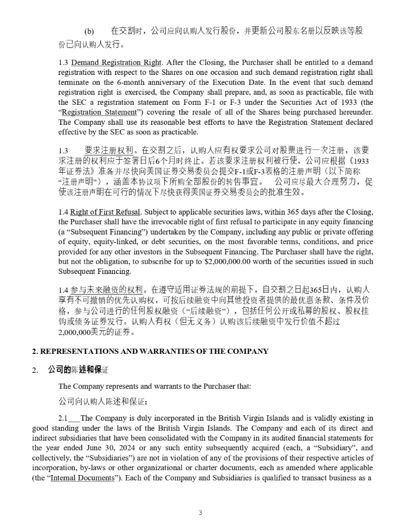 3 (b) ✏ẋ≙ ᰦ ˈ ⅓ ਨ ᓄ ੁ 䇔䍝 ạ ਁ 堳傈 ԭ ˈ ᒦ 㛛㖗⅓ ਨ 傈 ь Ọ⎴㘇 䈕 ㅹ 傈 ԭ ⷙ ੁ 䇔䍝 ạ ਁ 堳 DŽ 1 . 3 Demand Registration Right . After the Closing, the Purchaser shall be entitled to a demand registration with respect to the Shares on one occasion and such demand registration right shall terminate on the 6 - month anniversary of the Execution Date . In the event that such demand registration right is exercised, the Company shall prepare, and, as soon as practicable, file with the SEC a registration statement on Form F - 1 or F - 3 under the Securities Act of 1933 (the “ Registration Statement ”) covering the resale of all of the Shares being purchased hereunder . The Company shall use its reasonable best efforts to have the Registration Statement declared effective by the SEC as soon as practicable . 3. 奨㰩㳏 ᵳ ∐ DŽ ✏ẋ≙Ḳ ਾ ˈ 䇔䍝 ạ ᓄ 㛰 ᵳ 奨㰩⅓ ਨ ሩ 傈䥏 䘋 堳ᷧ㬈㳏 ˈ 䈕 奨 㰩㳏 䙫 ᵳ ∐ ᓄ ṵ ㆮ 㖢 㗌 ਾ 6 њ 㛯 ᰦ㓸 㭉 DŽ 㤕 䈕 奨㰩㳏 ᵳ ∐墒堳ὦ ˈ ⅓ ਨ ᓄ ṩᦞ lj 1933 ⹛ 䇱 ∟㲼 NJ ↭ ༷ᒦቭ ᘛੁ 併 ഭ䇱 ∟ẋ㗺 င ઈՊ ᨀ ẋ F - 1 ᡆ F - 3 塏 Ṭ 䙫㳏 ༠ 㗵 ˄ Ọᷲ ㆰ〠 “ 㳏 ༠ 㗵 ” ˅ ˈ ⏥ 䚽㜓 ॿ䇞亩 ᷲ ᡰ 䍝 ޘ 惏傈 ԭ 䙫 䖜 Ṳ⮃ DŽ ⅓ ਨ ᓄቭ ᴰ ⤎ ਸ⨶ ⊑⊂ ˈ ׳ ὦ 䈕 㳏 ༠ 㗵✏ ਟ 堳䙫 ᛵ ߥ ᷲ ቭ ᘛ 㧧 ⽾併 ഭ䇱 ∟ẋ㗺 င ઈՊ 䙫 ᢩ ↭䔆㔯 DŽ 4. Right of First Refusal . Subject to applicable securities laws, within 365 days after the Closing, the Purchaser shall have the irrevocable right of first refusal to participate in any equity financing (a “Subsequent Financing”) undertaken by the Company, including any public or private offering of equity, equity - linked, or debt securities, on the most favorable terms, conditions, and price provided for any other investors in the Subsequent Financing . The Purchaser shall have the right, but not the obligation, to subscribe for up to $ 2 , 000 , 000 . 00 worth of the securities issued in such Subsequent Financing . 1.4 ৲о 㜑 ᶕ 㶽 䍴 䙫 ᵳ ∐ DŽ ✏ 䚥 ⭯ 䘲 䔏 䇱 ∟㲼 㿴 䙫∴ ᨀ ᷲ ˈ 凑ẋ≙Ḳ㗌 䎧 36 5 㗌 ˈ 䇔䍝 ạ Ẓ㛰ᷴ ਟ 䬰 䙫 Ո ℯ 䇔䍝ᵳ ˈ ਟ᤹ਾ 㔝 㶽 䍴 Ḕ ੁ ⅝ẽ ᣅ 䍴 俬 ᨀ ᾂ䙫 ᴰ Ո ᜐ ᶑ 㬥 ǃ ᶑ ờ⎱Ở Ṭ ˈ ৲о ⅓ ਨ 䘋 堳䙫ỢἼ傈 ᵳ 㶽 䍴 ˄ “ ਾ 㔝 㶽 䍴 ” ˅ˈ ⋬ ᤜ ỢἼ⅓ ᔰ ᡆ 䦨⋆䙫傈 ᵳ ǃ 傈 ᵳ ᤲ 䫙 ᡆ ٪࣑䇱 ∟ ਁ 堳 DŽ 䇔䍝 ạ㛰 ᵳ ˄ Ἥ㗇 ѹ࣑ ˅ 䇔䍝䈕 ਾ 㔝 㶽 䍴 Ḕ ਁ 堳Ở ٬ ᷴ嵬 䗷 2,000,000 併K䙫 䇱 ∟ DŽ 2. REPRESENTATIONS AND WARRANTIES OF THE COMPANY 2. 㔗䉵 䱸 䬆㕒㍃ 䇱 The Company represents and warrants to the Purchaser that : ⅓ ਨੁ 䇔䍝 ạ 䱸 䘠઼؍ 䇱 ˖ 1. The Company is duly incorporated in the British Virgin Islands and is validly existing in good standing under the laws of the British Virgin Islands . The Company and each of its direct and indirect subsidiaries that have been consolidated with the Company in its audited financial statements for the year ended June 30 , 2024 or any such entity subsequently acquired (each, a “Subsidiary”, and collectively, the “Subsidiaries”) are not in violation of any of the provisions of their respective articles of incorporation, by - laws or other organizational or charter documents, each as amended where applicable (the “ Internal Documents ”) . Each of the Company and Subsidiaries is qualified to transact business as a