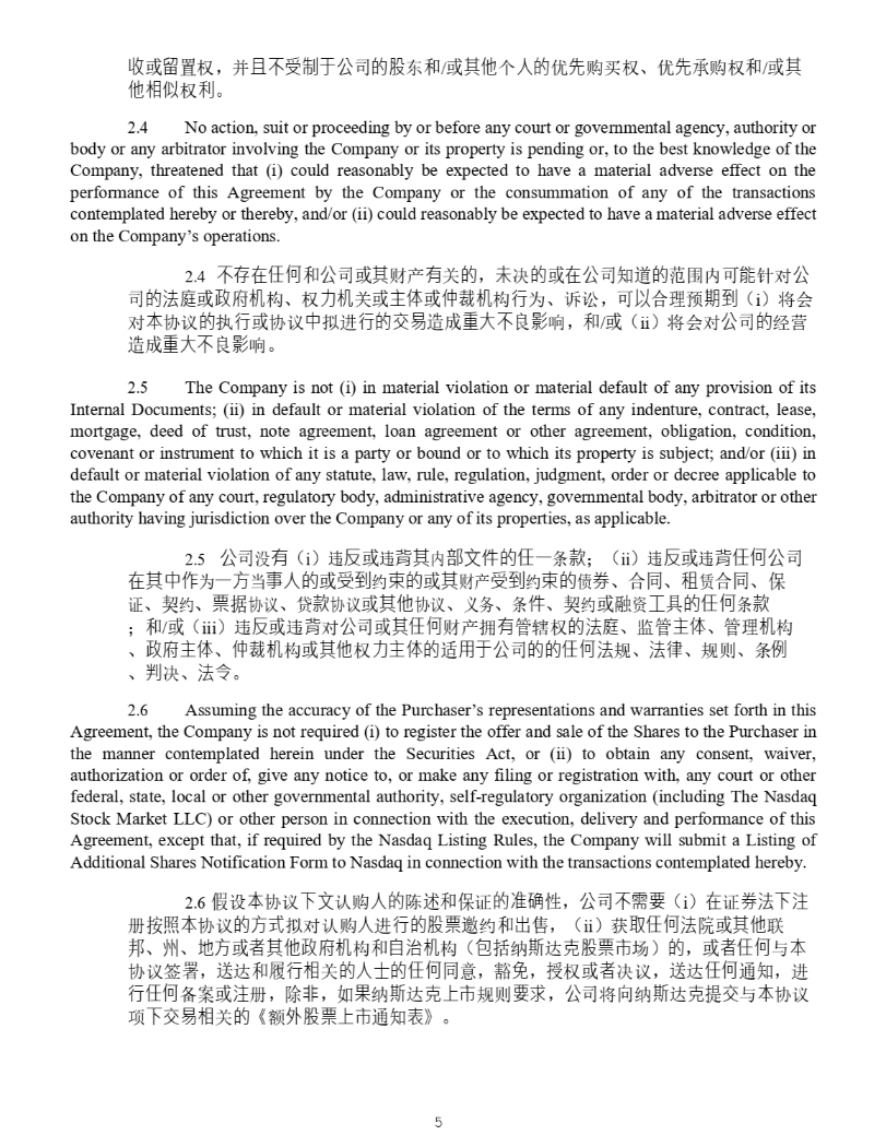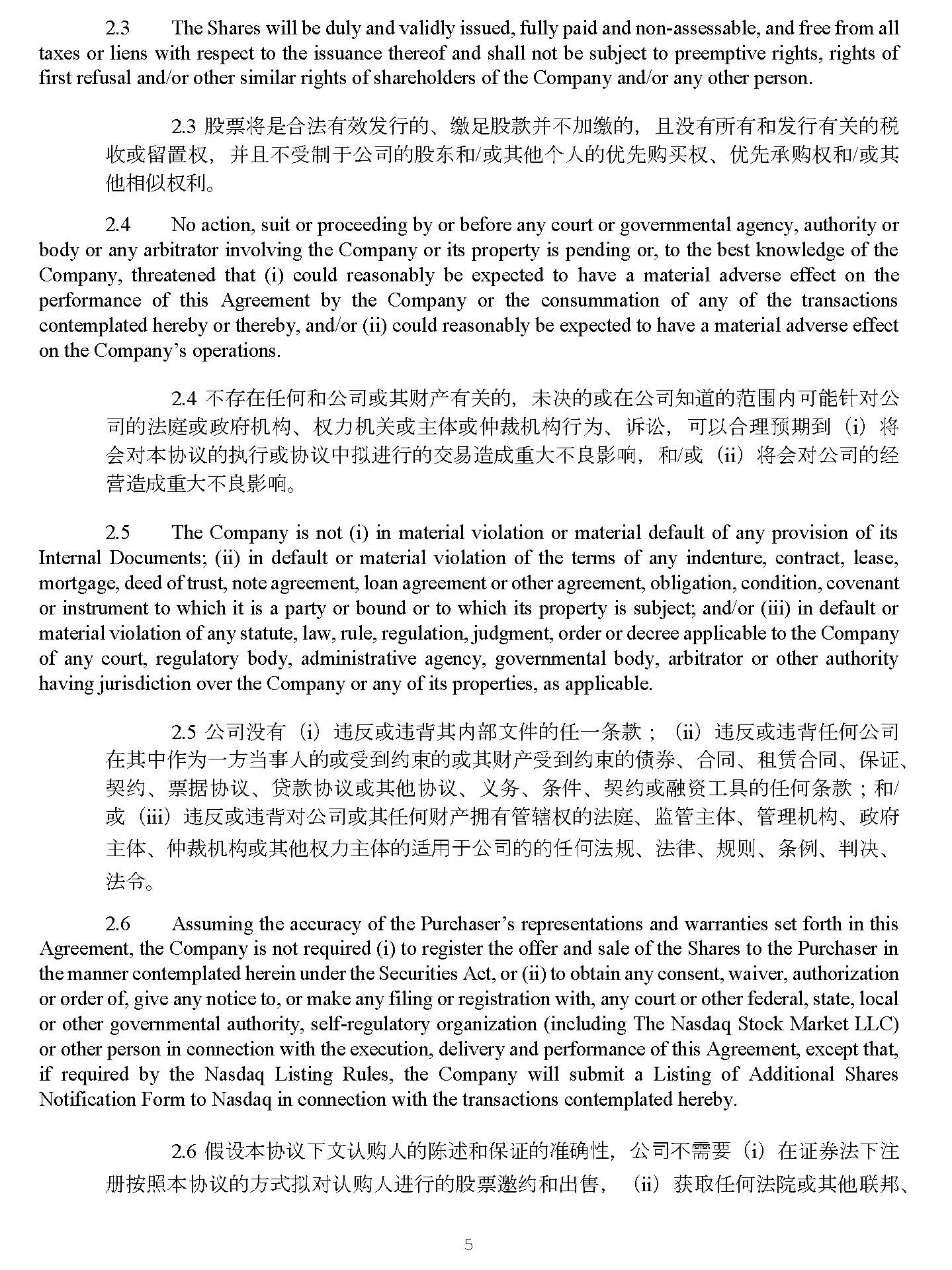 5 4928 - 2523 - 4026, v. 8 Ԇլᵳ࡙ DŽ 2 . 4 No action, suit or proceeding by or before any court or governmental agency, authority or body or any arbitrator involving the Company or its property is pending or, to the best knowledge of the Company, threatened that (i) could reasonably be expected to have a material adverse effect on the performance of this Agreement by the Company or the consummation of any of the transactions contemplated hereby or thereby, and/or (ii) could reasonably be expected to have a material adverse effect on the Company’s operations . 4. нᆈ൘ԫօ઼ޜਨᡆަ䍒ӗᴹޣⲴ ˈ ᵚߣⲴᡆ൘ޜਨ⸕䚃Ⲵ㤳തਟ㜭䪸ሩޜ ਨⲴ⌅ᓝᡆ᭯ᓌᵪᶴ ǃ ᵳ࣋ᵪޣᡆѫփᡆԢ㻱ᵪᶴ㹼Ѫ ǃ 䇹䇬 ˈ ਟԕਸ⨶亴ᵏࡠ ˄ i ˅ ሶ Պሩᵜॿ䇞Ⲵᢗ㹼ᡆॿ䇞ѝᤏ䘋㹼ⲴӔ᱃䙐ᡀ䟽བྷн㢟ᖡ૽ ˈ ઼ / ᡆ ˄ ii ˅ ሶՊሩޜਨⲴ㓿 㩕䙐ᡀ䟽བྷн㢟ᖡ૽ DŽ 5. The Company is not (i) in material violation or material default of any provision of its Internal Documents ; (ii) in default or material violation of the terms of any indenture, contract, lease, mortgage, deed of trust, note agreement, loan agreement or other agreement, obligation, condition, covenant or instrument to which it is a party or bound or to which its property is subject ; and/or (iii) in default or material violation of any statute, law, rule, regulation, judgment, order or decree applicable to the Company of any court, regulatory body, administrative agency, governmental body, arbitrator or other authority having jurisdiction over the Company or any of its properties, as applicable . 5. ޜਨ⋑ᴹ ˄ i ˅ 䘍৽ᡆ䘍㛼ަ䜘᮷ԦⲴԫаᶑⅮ ˗˄ ii ˅ 䘍৽ᡆ䘍㛼ԫօޜਨ ൘ަѝѪаᯩᖃһӪⲴᡆਇࡠ㓖ᶏⲴᡆަ䍒ӗਇࡠ㓖ᶏⲴ٪ࡨ ǃ ਸ਼ ǃ 』䍱ਸ਼ ǃ ؍䇱 ǃ ཱྀ㓖 ǃ ⾘ᦞॿ䇞 ǃ 䍧Ⅾॿ䇞ᡆަԆॿ䇞 ǃ ѹ࣑ ǃ ᶑԦ ǃ ཱྀ㓖ᡆ㶽䍴ᐕާⲴԫօᶑⅮ ˗ ઼ / ᡆ ˄ iii ˅ 䘍৽ᡆ䘍㛼ሩޜਨᡆަԫօ䍒ӗᤕᴹ㇑䗆ᵳⲴ⌅ᓝ ǃ ⴁ㇑ѫփ ǃ ㇑⨶ᵪᶴ ǃ ᭯ᓌѫփ ǃ Ԣ㻱ᵪᶴᡆަԆᵳ࣋ѫփⲴ䘲⭘ҾޜਨⲴⲴԫօ⌅㿴 ǃ ⌅ᖻ ǃ 㿴ࡉ ǃ ᶑֻ ǃ ࡔߣ ǃ ⌅Ԕ DŽ 6. Assuming the accuracy of the Purchaser’s representations and warranties set forth in this Agreement, the Company is not required (i) to register the offer and sale of the Shares to the Purchaser in the manner contemplated herein under the Securities Act, or (ii) to obtain any consent, waiver, authorization or order of, give any notice to, or make any filing or registration with, any court or other federal, state, local or other governmental authority, self - regulatory organization (including The Nasdaq Stock Market LLC) or other person in connection with the execution, delivery and performance of this Agreement, except that, if required by the Nasdaq Listing Rules, the Company will submit a Listing of Additional Shares Notification Form to Nasdaq in connection with the transactions contemplated hereby . 6. ٷ䇮ᵜॿ䇞л᮷䇔䍝ӪⲴ䱸䘠઼؍䇱Ⲵ߶⺞ᙗ ˈ ޜਨн䴰㾱 ˄ i ˅ ൘䇱ࡨ⌅л⌘ ᤹➗ᵜॿ䇞Ⲵᯩᔿᤏሩ䇔䍝Ӫ䘋㹼Ⲵ㛑⾘䚰㓖઼ࠪ ˈ˄ ii ˅ 㧧ਆԫօ⌅䲒ᡆަԆ㚄䛖 ǃ ᐎ ǃ ൠᯩᡆ㘵ަԆ᭯ᓌᵪᶴ઼㠚⋫ᵪᶴ ˄ वᤜ㓣ᯟ䗮ݻ㛑⾘ᐲ൪ ˅ Ⲵ ˈ ᡆ㘵ԫօоᵜॿ䇞ㆮ㖢 ˈ 䘱䗮઼ን㹼ޣⲴӪ༛Ⲵԫօ਼ ˈ 䉱ݽ ˈ ᦸᵳᡆ㘵ߣ䇞 ˈ 䘱䗮ԫօ䙊⸕ ˈ 䘋㹼ԫօ༷Ṹ ᡆ⌘ ˈ 䲔䶎 ˈ ྲ᷌㓣ᯟ䗮ݻкᐲ㿴ࡉ㾱≲ ˈ ޜਨሶੁ㓣ᯟ䗮ݻᨀӔоᵜॿ䇞亩лӔ᱃ ޣ Ⲵ lj 仍ཆ㛑⾘кᐲ䙊⸕㺘 NJDŽ 7. The execution and delivery of this Agreement does not, and the consummation of the transactions contemplated hereby will not, conflict with, or result in any violation of, or default under (with