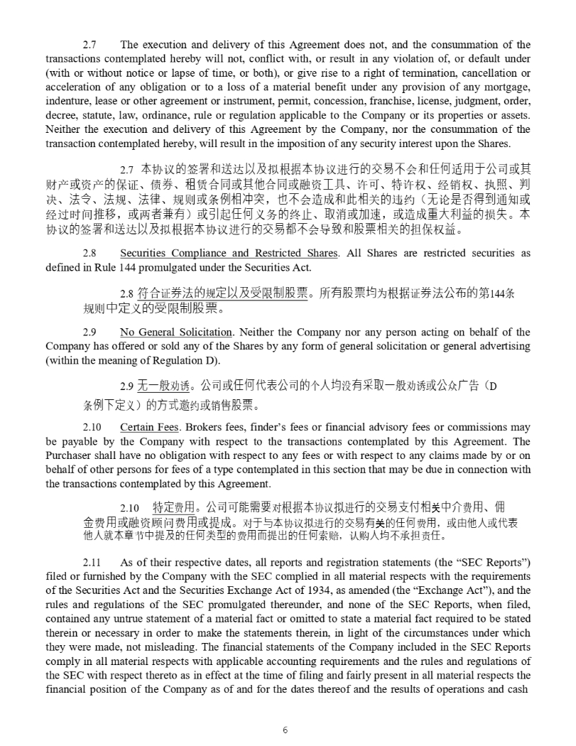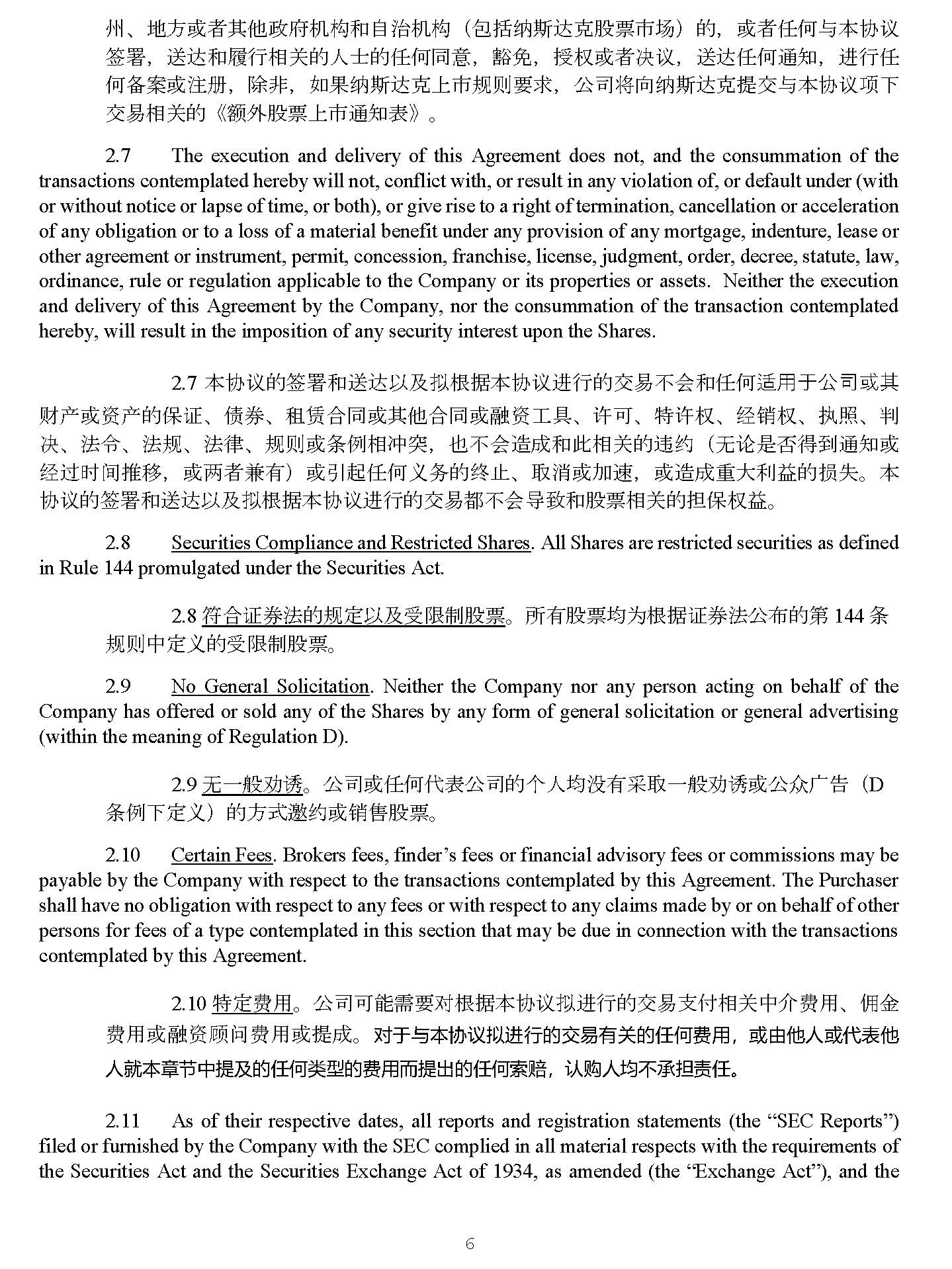 6 2 . 7 The execution and delivery of this Agreement does not, and the consummation of the transactions contemplated hereby will not, conflict with, or result in any violation of, or default under (with or without notice or lapse of time, or both), or give rise to a right of termination, cancellation or acceleration of any obligation or to a loss of a material benefit under any provision of any mortgage, indenture, lease or other agreement or instrument, permit, concession, franchise, license, judgment, order, decree, statute, law, ordinance, rule or regulation applicable to the Company or its properties or assets . Neither the execution and delivery of this Agreement by the Company, nor the consummation of the transaction contemplated hereby, will result in the imposition of any security interest upon the Shares . 7. 㜓 ॿ䇞 䙫 ㆮ 㖢઼䘱 䗮 Ọ⎱ ᤏ ṩᦞ 㜓 ॿ䇞䘋 堳䙫ẋ㗺ᷴ Պ ઼ ỢἼ 䘲 䔏ṵ⅓ ਨᡆ ⅝ 䍒ӗ ᡆ 䍴ӗ 䙫 ؍ 䇱 ǃ ٪ ∟ ǃ 䧆 䍱 ਸ਼ᡆ ⅝ẽ ਸ਼ᡆ㶽 䍴 ⷌ ާ ǃ 䇨 ਟ ǃ ⢩ 䇨ᵳ ǃ 㓿䬰ᵳ ǃ ᢗ ➗ ǃ ∋ ߣ ǃ 㲼ị ǃ 㲼 㿴 ǃ 㲼⽲ ǃ 㿴ࡉ ᡆ ᶑ ὲ䛟↙䩨 ˈ Ṇᷴ Պ 䙐ᡀ઼ 㭋䛟 ޣ 䙫 䘍㓖 ˄ 㗇 䇪 㘖 ⽾∗ 䙊⸕ᡆ 㓿䗷ᰦ䰤 ᧘ 䧢 ˈ ᡆ є 俬 ᳗ 㛰 ˅ ᡆ 䎧 ỢἼ ѹ࣑ 䙫 㓸 㭉 ǃ ⎽ ⎸ᡆ ⊇ 䙏 ˈ ᡆ䙐ᡀ 憴⤎∐䚱䙫 ᦏ ⤘ DŽ 㜓 ॿ䇞 䙫 ㆮ 㖢઼䘱 䗮 Ọ⎱ ᤏ ṩᦞ 㜓 ॿ䇞䘋 堳䙫ẋ㗺惤ᷴ Պሬ 凛 ઼ 傈䥏䛟 ޣ 䙫 ᣵ؍ ᵳ 䚱 DŽ 8. Securities Compliance and Restricted Shares . All Shares are restricted securities as defined in Rule 144 promulgated under the Securities Act . 8. ㅖਸ 䇱 ∟㲼䙫 㿴 ⮁Ọ⎱⎾ 䲀 ∝傈䥏 DŽ ᡰ 㛰傈䥏✮ Ѫ ṩᦞ 䇱 ∟㲼⅓ⷪ䙫 ㅜ 144 ᶑ 㿴ࡉ Ḕ⮁ ѹ 䙫⎾ 䲀 ∝傈䥏 DŽ 9. No General Solicitation . Neither the Company nor any person acting on behalf of the Company has offered or sold any of the Shares by any form of general solicitation or general advertising (within the meaning of Regulation D) . 9. 㗇ᷧ 㡜 ࣍䈡 DŽ ⅓ ਨᡆ ỢἼỊ塏⅓ ਨ 䙫 њ ạ✮ ⋑ 㛰憮⎽ᷧ 㡜 ࣍䈡 ᡆ ⅓ Շ ˄ D ᶑ ὲᷲ⮁ ѹ ˅ 䙫㖠 䚰 㓖 ᡆ 䬰 傈䥏 DŽ 10. Certain Fees . Brokers fees, finder’s fees or financial advisory fees or commissions may be payable by the Company with respect to the transactions contemplated by this Agreement . The Purchaser shall have no obligation with respect to any fees or with respect to any claims made by or on behalf of other persons for fees of a type contemplated in this section that may be due in connection with the transactions contemplated by this Agreement . 11. ⢩ ⮁ 䍩 䔏 DŽ ⅓ ਨਟ 僤曧奨 ሩ ṩᦞ 㜓 ॿ䇞 ᤏ 䘋 堳䙫ẋ㗺㔖ế䛟 ය ḔẲ 䍩 䔏 ǃ Ὂ 憸 䍩 䔏 ᡆ㶽 䍴亮䰞䍩 䔏 ᡆᨀᡀ DŽ ሩ ṵ᷵㜓 ॿ䇞 ᤏ 䘋 堳䙫ẋ㗺㛰 ය 䙫ỢἼ 䍩 䔏 ˈ ᡆ 䔘ẽạ ᡆ Ị塏 ẽạ ቡ 㜓䫇 㢲 Ḕ ᨀ ⎱䙫ỢἼ ㊫ ❲䙫 䍩 䔏俳 ᨀ ⇡䙫ỢἼ ㍒ 䎄 ˈ 䇔䍝 ạ✮ᷴ ᣵ 䍓 Ợ DŽ 11. As of their respective dates, all reports and registration statements (the “SEC Reports”) filed or furnished by the Company with the SEC complied in all material respects with the requirements of the Securities Act and the Securities Exchange Act of 1934 , as amended (the “Exchange Act”), and the rules and regulations of the SEC promulgated thereunder, and none of the SEC Reports, when filed, contained any untrue statement of a material fact or omitted to state a material fact required to be stated therein or necessary in order to make the statements therein, in light of the circumstances under which they were made, not misleading . The financial statements of the Company included in the SEC Reports comply in all material respects with applicable accounting requirements and the rules and regulations of the SEC with respect thereto as in effect at the time of filing and fairly present in all material respects the financial position of the Company as of and for the dates thereof and the results of operations and cash
