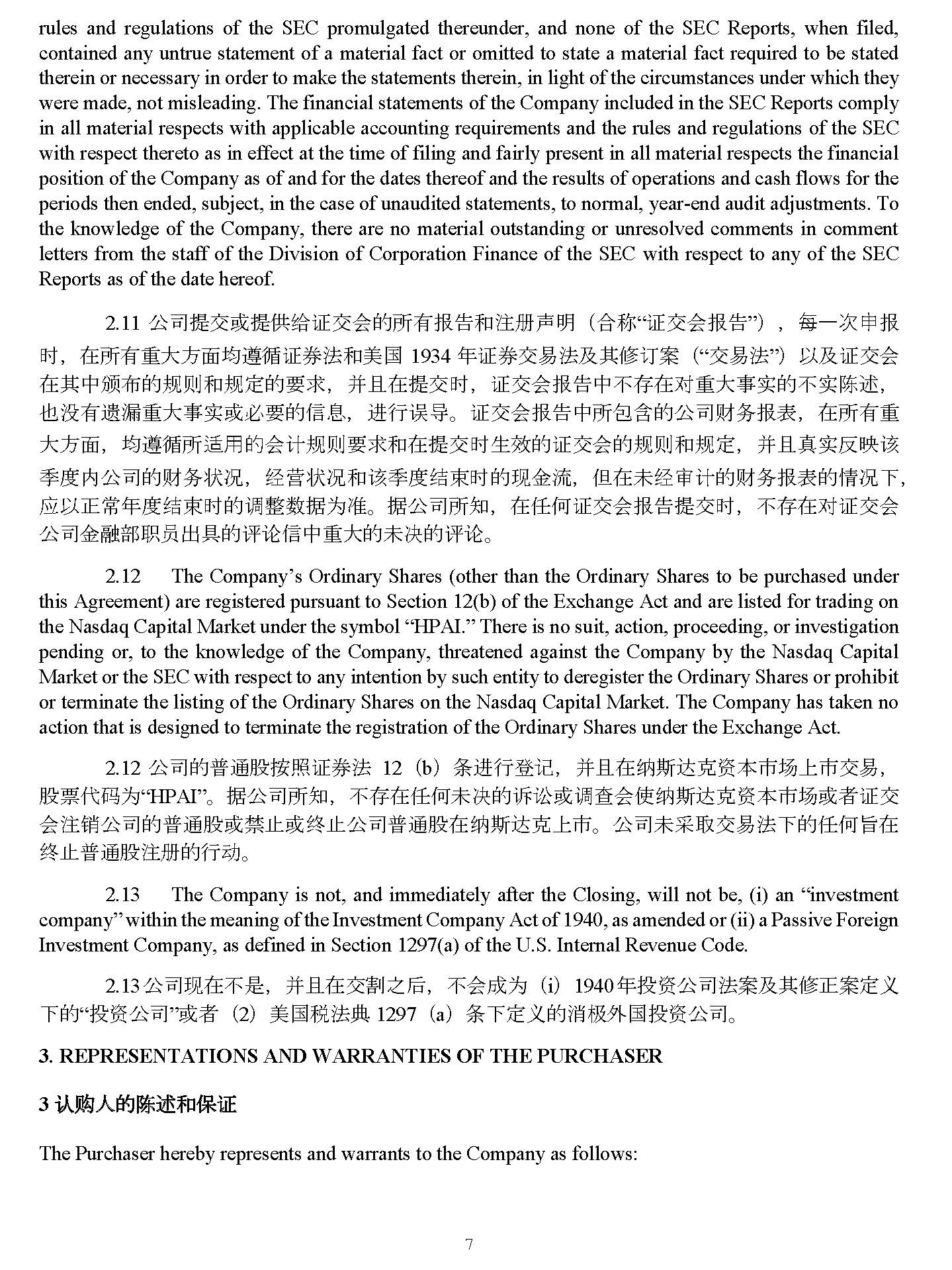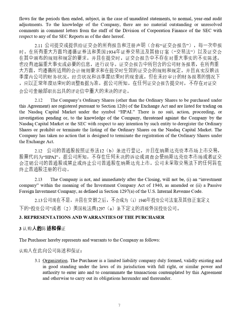 7 4928 - 2523 - 4026, v. 8 the knowledge of the Company, there are no material outstanding or unresolved comments in comment letters from the staff of the Division of Corporation Finance of the SEC with respect to any of the SEC Reports as of the date hereof . 11. ޜਨᨀӔᡆᨀ㔉䇱ӔՊⲴᡰᴹᣕ઼⌘༠᰾ ˄ ਸ〠 “ 䇱ӔՊᣕ ” ˅ ˈ ⇿а⅑⭣ᣕ ᰦ ˈ ൘ᡰᴹ䟽བྷᯩ䶒൷䚥ᗚ䇱ࡨ⌅઼㖾ഭ 1934 ᒤ䇱ࡨӔ᱃⌅৺ަ؞䇒Ṹ ˄ “ Ӕ᱃⌅ ” ˅ ԕ৺䇱ӔՊ ൘ ަѝ亱ᐳⲴ㿴ࡉ઼㿴ᇊⲴ㾱≲ ˈ ᒦф൘ᨀӔᰦ ˈ 䇱ӔՊᣕѝнᆈ൘ሩ䟽བྷһᇎⲴнᇎ䱸䘠 ˈ ҏ⋑ ᴹ䚇┿䟽བྷһᇎᡆᗵ㾱Ⲵؑ ˈ 䘋㹼䈟ሬ DŽ 䇱ӔՊᣕѝᡰवਜ਼Ⲵޜਨ䍒࣑ᣕ㺘 ˈ ൘ᡰᴹ䟽བྷᯩ䶒 ˈ ൷䚥ᗚᡰ䘲⭘ⲴՊ䇑㿴ࡉ㾱≲઼൘ᨀӔᰦ⭏᭸Ⲵ䇱ӔՊⲴ㿴ࡉ઼㿴ᇊ ˈ ᒦфⵏᇎ৽᱐䈕ᆓᓖ ޜ ਨⲴ䍒࣑⣦ߥ ˈ 㓿㩕⣦ߥ઼䈕ᆓᓖ㔃ᶏᰦⲴ⧠䠁⍱ ˈ ն൘ᵚ㓿ᇑ䇑Ⲵ䍒࣑ᣕ㺘Ⲵᛵߥл ˈ ᓄԕ↓ ᑨᒤ ᓖ㔃ᶏᰦⲴ䈳ᮤᮠᦞѪ߶ DŽ ᦞޜਨᡰ⸕ ˈ ൘ԫօ䇱ӔՊᣕᨀӔᰦ ˈ нᆈ൘ሩ䇱ӔՊޜਨ䠁㶽 䜘㙼 ઈࠪާⲴ䇴䇪ؑѝ䟽བྷⲴᵚߣⲴ䇴䇪 DŽ 12. The Company’s Ordinary Shares (other than the Ordinary Shares to be purchased under this Agreement) are registered pursuant to Section 12 (b) of the Exchange Act and are listed for trading on the Nasdaq Capital Market under the symbol “HPAI . ” There is no suit, action, proceeding, or investigation pending or, to the knowledge of the Company, threatened against the Company by the Nasdaq Capital Market or the SEC with respect to any intention by such entity to deregister the Ordinary Shares or prohibit or terminate the listing of the Ordinary Shares on the Nasdaq Capital Market . The Company has taken no action that is designed to terminate the registration of the Ordinary Shares under the Exchange Act . 13. ޜਨⲴᲞ䙊㛑᤹➗䇱ࡨ⌅ 12 ˄ b ˅ ᶑ䘋㹼ⲫ䇠 ˈ ᒦф൘㓣ᯟ䗮ݻ䍴ᵜᐲ൪кᐲӔ᱃ ˈ 㛑⾘ԓ⸱Ѫ “HPAI” DŽ ᦞޜਨᡰ⸕ ˈ нᆈ൘ԫօᵚߣⲴ䇹䇬ᡆ䈳ḕՊ֯㓣ᯟ䗮ݻ䍴ᵜᐲ൪ᡆ㘵䇱Ӕ Պ⌘䬰ޜਨⲴᲞ䙊㛑ᡆ⾱→ᡆ㓸→ޜਨᲞ䙊㛑൘㓣ᯟ䗮ݻкᐲ DŽ ޜਨᵚ䟷ਆӔ᱃⌅лⲴԫօᰘ൘ 㓸 →Პ䙊㛑⌘Ⲵ㹼ࣘ DŽ 14. The Company is not, and immediately after the Closing, will not be, (i) an “investment company” within the meaning of the Investment Company Act of 1940 , as amended or (ii) a Passive Foreign Investment Company, as defined in Section 1297 (a) of the U . S . Internal Revenue Code . 2 . 13 ޜਨ⧠൘нᱟ ˈ ᒦф൘Ӕࢢѻਾ ˈ нՊᡀѪ ˄ i ˅ 1940 ᒤᣅ䍴ޜਨ⌅Ṹ৺ަ؞↓Ṹᇊѹ лⲴ “ ᣅ䍴ޜਨ ” ᡆ㘵 ˄ 2 ˅ 㖾ഭ〾⌅ި 1297 ˄ a ˅ ᶑлᇊѹⲴ⎸ᶱཆഭᣅ䍴ޜਨ DŽ 3. REPRESENTATIONS AND WARRANTIES OF THE PURCHASER 3 䇔䍝 ㋀䉵 䱸 䬆㕒㍃ 䇱 The Purchaser hereby represents and warrants to the Company as follows : 䇔䍝Ӫ൘↔ੁޜਨ䱸䘠઼؍䇱 ˖ 1. Organization . The Purchaser is a limited liability company duly formed, validly existing and in good standing under the laws of its jurisdiction with full right, or similar power and authority to enter into and to consummate the transactions contemplated by this Agreement and otherwise to carry out its obligations hereunder and thereunder . 3.1 㓴㓷 DŽ 䇔䍝ӪѪ൘ަ㇑䗆४⌅䇮・Ⲵᴹ䲀䍓ԫޜਨ ˈ ᒦᤕᴹᆼᮤⲴᵳ࡙ᡆ ㊫լᵳ઼࣋ᦸᵳԕㆮ㖢઼ን㹼ᵜॿ䇞ѝᤏ䘋㹼ⲴӔ᱃ᡆን㹼ަ൘ᵜॿ䇞ᡆަԆॿ䇞ѝⲴѹ