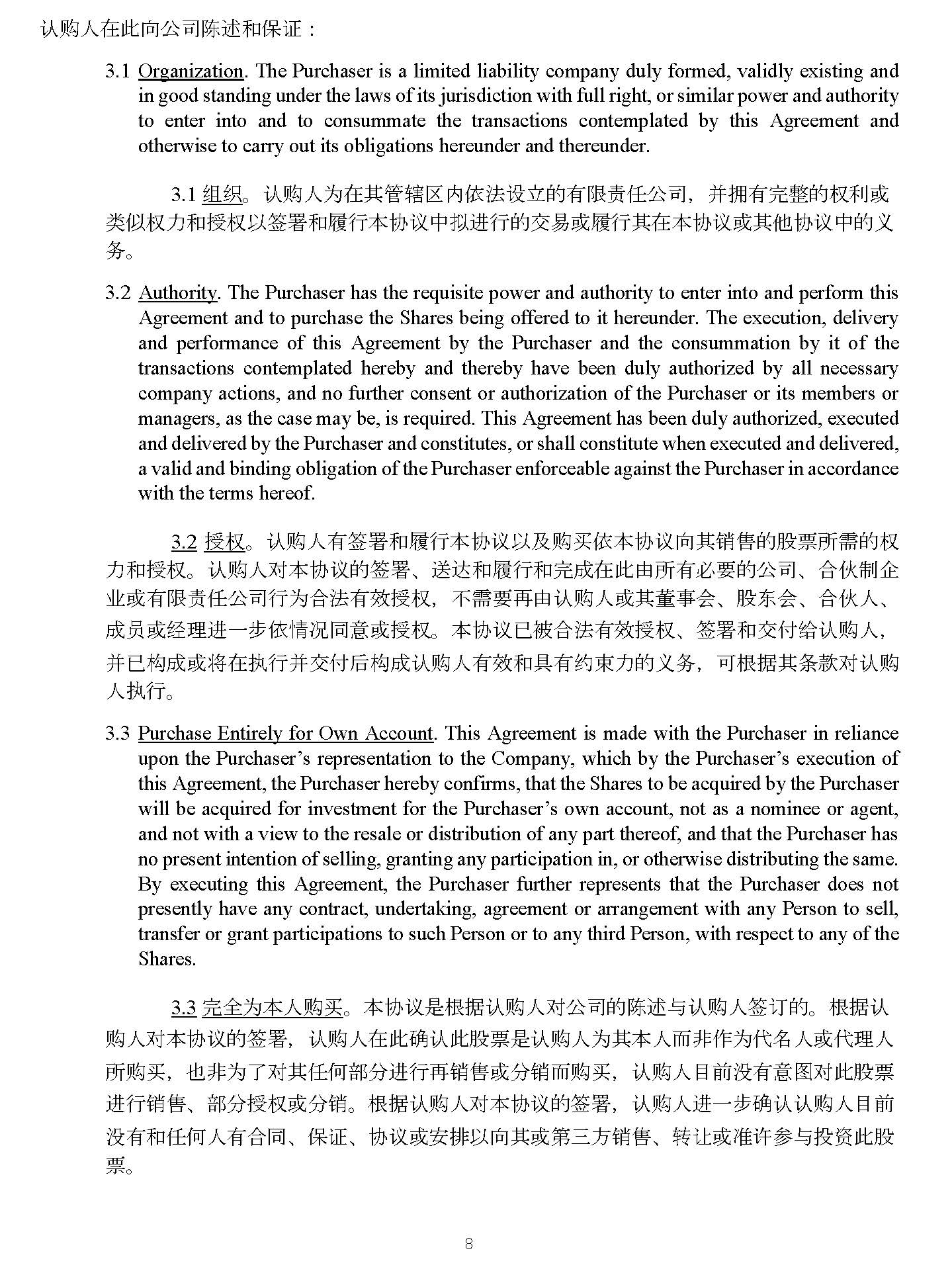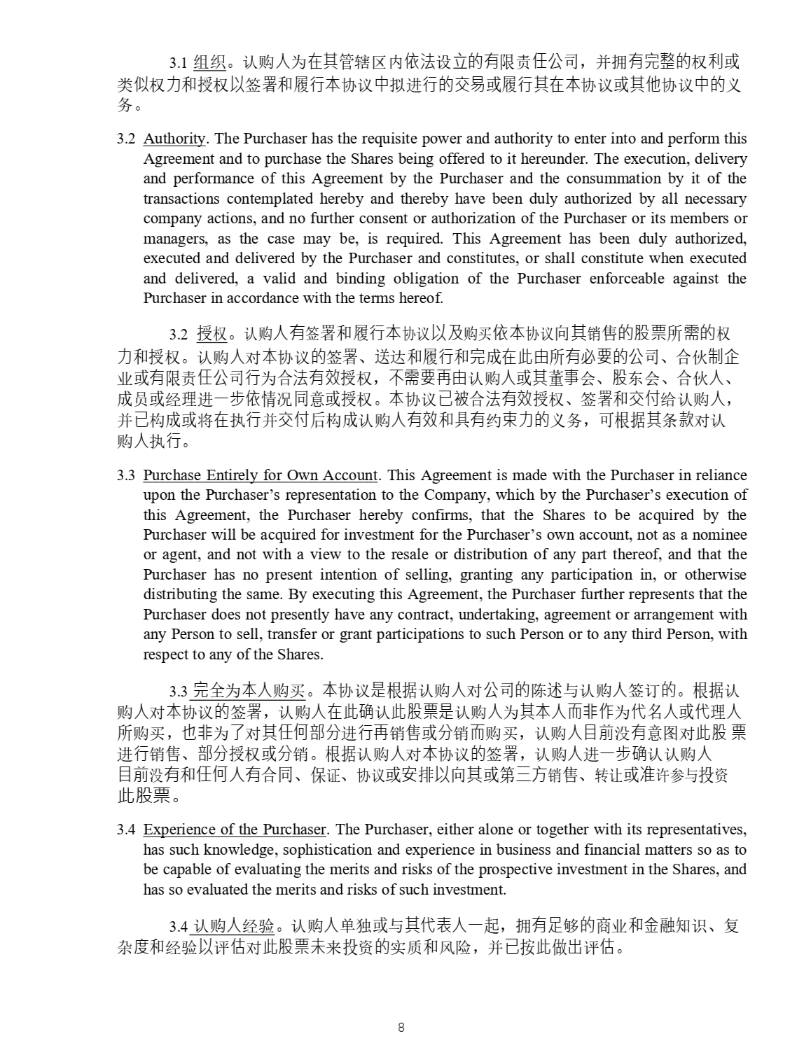 8 4928 - 2523 - 4026, v. 8 ࣑ DŽ 3 . 2 Authority . The Purchaser has the requisite power and authority to enter into and perform this Agreement and to purchase the Shares being offered to it hereunder . The execution, delivery and performance of this Agreement by the Purchaser and the consummation by it of the transactions contemplated hereby and thereby have been duly authorized by all necessary company actions, and no further consent or authorization of the Purchaser or its members or managers, as the case may be, is required . This Agreement has been duly authorized, executed and delivered by the Purchaser and constitutes, or shall constitute when executed and delivered, a valid and binding obligation of the Purchaser enforceable against the Purchaser in accordance with the terms hereof . 2. ᦸᵳ DŽ 䇔䍝Ӫᴹㆮ㖢઼ን㹼ᵜॿ䇞ԕ৺䍝Ҡᵜॿ䇞ੁަ䬰Ⲵ㛑⾘ᡰ䴰Ⲵᵳ ઼࣋ᦸᵳ DŽ 䇔䍝Ӫሩᵜॿ䇞Ⲵㆮ㖢 ǃ 䘱䗮઼ን㹼઼ᆼᡀ൘↔⭡ᡰᴹᗵ㾱Ⲵޜਨ ǃ ਸՉࡦԱ ъᡆᴹ䲀䍓ԫޜਨ㹼Ѫਸ⌅ᴹ᭸ᦸᵳ ˈ н䴰㾱⭡䇔䍝Ӫᡆަ㪓һՊ ǃ 㛑ьՊ ǃ ਸՉӪ ǃ ᡀઈᡆ㓿⨶䘋а↕ᛵߥ਼ᡆᦸᵳ DŽ ᵜॿ䇞ᐢ㻛ਸ⌅ᴹ᭸ᦸᵳ ǃ ㆮ㖢઼ӔԈ㔉䇔䍝Ӫ ˈ ᒦᐢᶴᡀᡆሶ൘ᢗ㹼ᒦӔԈਾᶴᡀ䇔䍝Ӫᴹ᭸઼ާᴹ㓖ᶏ࣋Ⲵѹ࣑ ˈ ਟṩᦞަᶑⅮሩ䇔䍝 Ӫᢗ㹼 DŽ 3. Purchase Entirely for Own Account . This Agreement is made with the Purchaser in reliance upon the Purchaser’s representation to the Company, which by the Purchaser’s execution of this Agreement, the Purchaser hereby confirms, that the Shares to be acquired by the Purchaser will be acquired for investment for the Purchaser’s own account, not as a nominee or agent, and not with a view to the resale or distribution of any part thereof, and that the Purchaser has no present intention of selling, granting any participation in, or otherwise distributing the same . By executing this Agreement, the Purchaser further represents that the Purchaser does not presently have any contract, undertaking, agreement or arrangement with any Person to sell, transfer or grant participations to such Person or to any third Person, with respect to any of the Shares . 3. ᆼޘѪᵜӪ䍝Ҡ DŽ ᵜॿ䇞ᱟṩᦞ䇔䍝ӪሩޜਨⲴ䱸䘠о䇔䍝Ӫㆮ䇒Ⲵ DŽ ṩᦞ䇔 䍝Ӫሩᵜॿ䇞Ⲵㆮ㖢 ˈ 䇔䍝Ӫ൘↔⺞䇔↔㛑⾘ᱟ䇔䍝ӪѪަᵜӪ㘼䶎ѪԓӪᡆԓ⨶Ӫ ᡰ䍝Ҡ ˈ ҏ䶎ѪҶሩަԫօ䜘࠶䘋㹼䬰ᡆ࠶䬰㘼䍝Ҡ ˈ 䇔䍝Ӫⴞࡽ⋑ᴹമሩ↔㛑⾘ 䘋㹼䬰 ǃ 䜘࠶ᦸᵳᡆ࠶䬰 DŽ ṩᦞ䇔䍝Ӫሩᵜॿ䇞Ⲵㆮ㖢 ˈ 䇔䍝Ӫ䘋а↕⺞䇔䇔䍝Ӫⴞࡽ ⋑ᴹ઼ԫօӪᴹਸ਼ ǃ ؍䇱 ǃ ॿ䇞ᡆᆹᧂԕੁަᡆㅜйᯩ䬰 ǃ 䖜䇙ᡆ߶䇨৲оᣅ䍴↔㛑 ⾘ DŽ 4. Experience of the Purchaser . The Purchaser, either alone or together with its representatives, has such knowledge, sophistication and experience in business and financial matters so as to be capable of evaluating the merits and risks of the prospective investment in the Shares, and has so evaluated the merits and risks of such investment . 4. 䇔䍝Ӫ㓿傼 DŽ 䇔䍝Ӫঅ⤜ᡆоަԓ㺘Ӫа䎧 ˈ ᤕᴹ䏣ཏⲴ୶ъ઼䠁㶽⸕䇶 ǃ ༽ ᵲᓖ઼㓿傼ԕ䇴ՠሩ↔㛑⾘ᵚᶕᣅ䍴Ⲵᇎ䍘઼仾䲙 ˈ ᒦᐢ᤹↔ڊࠪ䇴ՠ DŽ 5. Ability to Bear Risk . The Purchaser understands and agrees that purchase of the Shares is a high - risk investment and the Purchaser is able to afford and bear an investment in a speculative