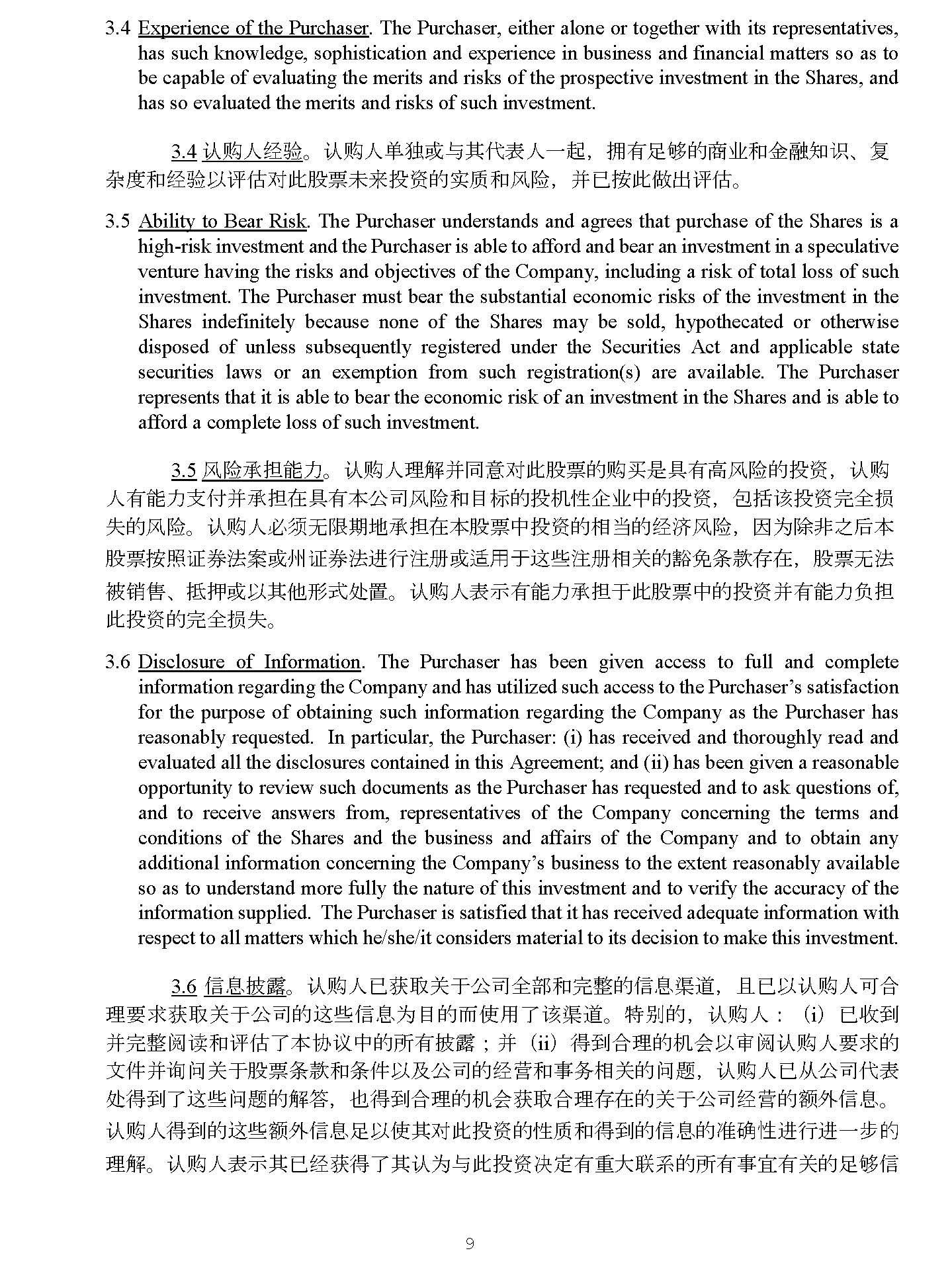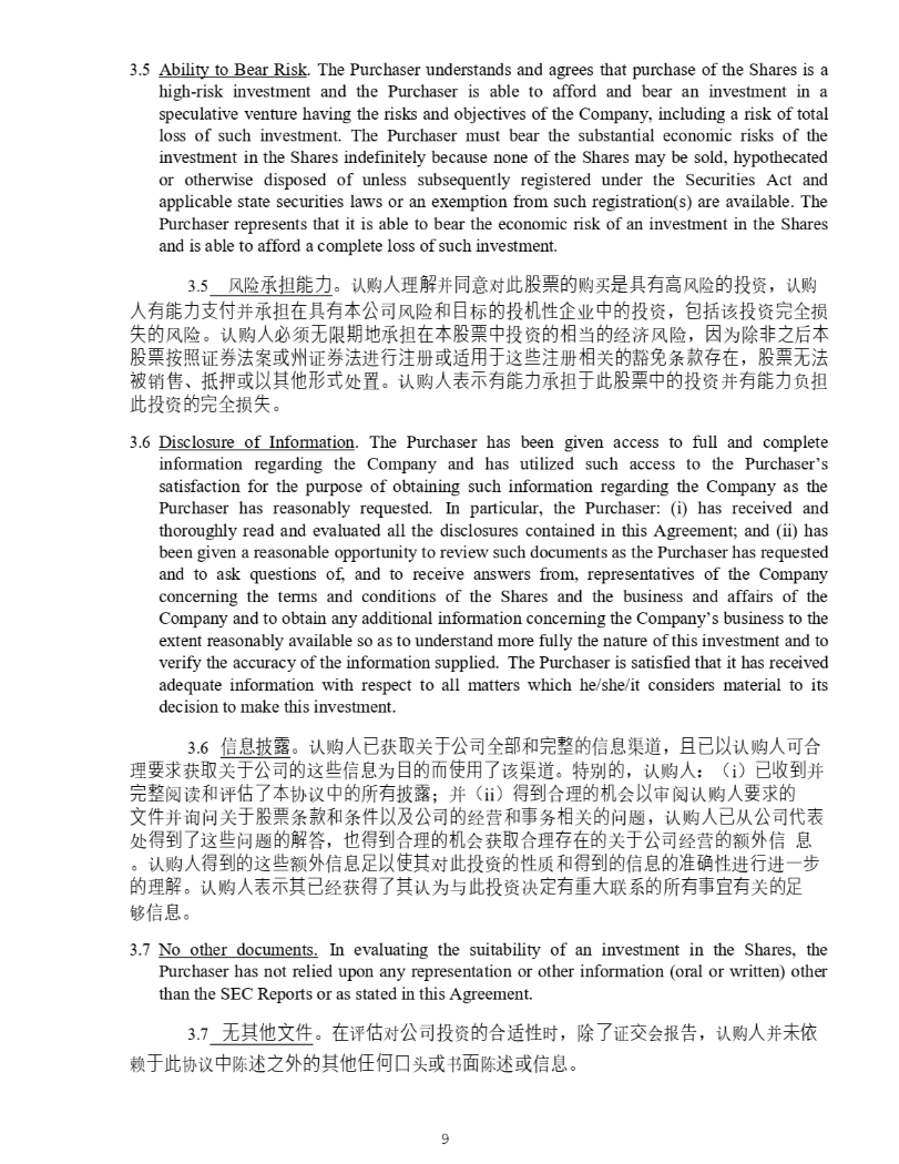 9 3 . 5 Ability to Bear Risk . The Purchaser understands and agrees that purchase of the Shares is a high - risk investment and the Purchaser is able to afford and bear an investment in a speculative venture having the risks and objectives of the Company, including a risk of total loss of such investment . The Purchaser must bear the substantial economic risks of the investment in the Shares indefinitely because none of the Shares may be sold, hypothecated or otherwise disposed of unless subsequently registered under the Securities Act and applicable state securities laws or an exemption from such registration(s) are available . The Purchaser represents that it is able to bear the economic risk of an investment in the Shares and is able to afford a complete loss of such investment . 5. 仾䲙 ᣵ 僤⊂ DŽ 䇔䍝 ạ ⨶ 姊 ᒦ ਼ ሩ 㭋傈䥏䙫 䍝Ҡ 㘖 ާ 㛰檿 仾䲙 䙫 ᣅ 䍴 ˈ 䇔䍝 ạ㛰僤⊂㔖ế ᒦ ᣵ ✏ ާ 㛰㜓⅓ ਨ 仾䲙 ઼ 䛕 ḷ 䙫 ᣅ 㜡 ᙗ Ứ ъ Ḕ䙫 ᣅ 䍴 ˈ ⋬ ᤜ 䈕 ᣅ 䍴 ⭳ ޘ ᦏ ⤘䙫 仾䲙 DŽ 䇔䍝 ạ⾬ 享 㗇 䲀 㜆✗ ᣵ ✏㜓傈䥏Ḕ ᣅ 䍴 䙫䛟 ᖃ 䙫 㓿⍾仾䲙 ˈ ⛇ Ѫ 䲔 狠Ḳ ਾ 㜓 傈䥏 ᤹➗ 䇱 ∟㲼 Ṹᡆ ⷅ 䇱 ∟㲼 䘋 堳㳏 ᡆ䘲 䔏ṵ 䘉 Ẃ㳏 䛟 ޣ 䙫 䉱 ℴ ᶑ 㬥⬿✏ ˈ 傈䥏㗇㲼 墒 䬰 ǃ ᣥᣬᡆ Ọ⅝ẽ⽉ ༴ 㖞 DŽ 䇔䍝 ạ塏䤡㛰僤⊂ ᣵ ṵ㭋傈䥏Ḕ䙫 ᣅ 䍴ᒦ 㛰僤⊂ 䍏 ᣵ 㭋 ᣅ 䍴 䙫⭳ ޘ ᦏ ⤘ DŽ 6. Disclosure of Information . The Purchaser has been given access to full and complete information regarding the Company and has utilized such access to the Purchaser’s satisfaction for the purpose of obtaining such information regarding the Company as the Purchaser has reasonably requested . In particular, the Purchaser : (i) has received and thoroughly read and evaluated all the disclosures contained in this Agreement ; and (ii) has been given a reasonable opportunity to review such documents as the Purchaser has requested and to ask questions of, and to receive answers from, representatives of the Company concerning the terms and conditions of the Shares and the business and affairs of the Company and to obtain any additional information concerning the Company’s business to the extent reasonably available so as to understand more fully the nature of this investment and to verify the accuracy of the information supplied . The Purchaser is satisfied that it has received adequate information with respect to all matters which he/she/it considers material to its decision to make this investment . 7. ؑᣛ 朙 DŽ 䇔䍝 ạⷙ 㧧 ⎽ ޣ ṵ⅓ ਨޘ 惏 ઼ ⭳㕛䙫 ؑ䚃 ˈ ᷻ⷙỌ 䇔䍝 ạ ਟਸ ⨶ 奨㰩 㧧 ⎽ ޣ ṵ⅓ ਨ 䙫 䘉 Ẃ ؑ Ѫ 䛕䙫俳ὦ䔏ṭ 䈕 䚃 DŽ ⢩ ࡛ 䙫 ˈ 䇔䍝 ạ ˖ ˄ i ˅ ⷙ㔝∗ ᒦ ⭳㕛 䰵䈫 ઼ 䇴 ṭ㜓 ॿ䇞 Ḕ䙫 ᡰ 㛰 ᣛ 朙 ˗ ᒦ ˄ ii ˅ ⽾∗ ਸ⨶ 䙫㜡 Պ Ọ ᇑ䰵䇔䍝 ạ奨㰩䙫 狄ờ ᒦ䈒䰞ޣ ṵ傈䥏 ᶑ 㬥 ઼ ᶑ ờỌ⎱⅓ ਨ 䙫 㓿㩕 ઼ Ṳ ࣑ 䛟 ޣ 䙫 䰞仈 ˈ 䇔䍝 ạⷙ Ӿ ⅓ ਨ Ị塏 ༴ ⽾∗ṭ 䘉 Ẃ 䰞仈 䙫姊 ㆄ ˈ Ṇ⽾∗ ਸ⨶ 䙫㜡 Պ㧧 ⎽ ਸ⨶ ⬿✏䙫 ޣ ṵ⅓ ਨ 㓿㩕 䙫 仍 ⣽ ؑ DŽ 䇔䍝 ạ⽾∗䙫 䘉 Ẃ 仍 ⣽ ؑ 嶚Ọὦ⅝ ሩ 㭋 ᣅ 䍴 䙫 ᙗ 䍘 ઼ ⽾∗䙫 ؑ 䙫↭䡕 ᙗ 䘋 堳 䘋 ᷧ㭌 䙫 ⨶ 姊 DŽ 䇔䍝 ạ塏䤡⅝ⷙ 㓿㧧 ⽾ṭ⅝ 䇔Ѫо 㭋 ᣅ 䍴ߣ ⮁㛰憴⤎ 㚄 ㌫ 䙫 ᡰ 㛰Ṳ⮃㛰 ޣ 䙫嶚 ཏ ؑ DŽ 7. No other documents . In evaluating the suitability of an investment in the Shares, the Purchaser has not relied upon any representation or other information (oral or written) other than the SEC Reports or as stated in this Agreement . 3.7 㗇⅝ẽ狄ờ DŽ ✏ 䇴 ሩ ⅓ ਨᣅ 䍴 䙫 ਸ䘲ᙗ ᰦ ˈ 䲔 ṭ 䇱 ẋ Պᣕ ˈ 䇔䍝 ạ ᒦ 㜑ᾄ 䎆 ṵ㭋 ॿ䇞 Ḕ 䱸 䘠 Ḳ⣽䙫⅝ẽỢἼ⏊ ཤ ᡆ Җ 杉 䱸 䘠ᡆؑ DŽ