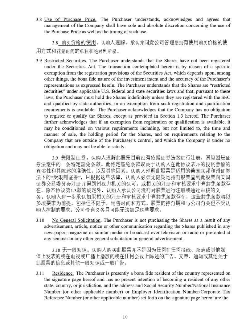 10 3 . 8 Use of Purchase Price . The Purchaser understands, acknowledges and agrees that management of the Company shall have sole and absolute discretion concerning the use of the Purchase Price as well as the timing of such use . 8. 䍝Ҡ Ở Ṭ 䙫ὦ䔏 DŽ 䇔䍝 ạ ⨶ 姊 ǃ 䇔ᒦ ਼ ⅓ ਨ㇑⨶ ቲᤕ 㛰ὦ䔏 䍝Ҡ Ở Ṭ 䙫ὦ 䔏㖠 ઼㣡 䬰ᰦ䰤 䙫 অ⤜ ઼ 㔍ሩ ∋ ᯝᵳ DŽ 9. Restricted Securities . The Purchaser understands that the Shares have not been registered under the Securities Act . The transaction contemplated herein is by reason of a specific exemption from the registration provisions of the Securities Act, which depends upon, among other things, the bona fide nature of the investment intent and the accuracy of the Purchaser’s representations as expressed herein . The Purchaser understands that the Shares are “restricted securities” under applicable U . S . federal and state securities laws and that, pursuant to these laws, the Purchaser must hold the Shares indefinitely unless they are registered with the SEC and qualified by state authorities, or an exemption from such registration and qualification requirements is available . The Purchaser acknowledges that the Company has no obligation to register or qualify the Shares, except as provided in Section 1 . 3 hereof . The Purchaser further acknowledges that if an exemption from registration or qualification is available, it may be conditioned on various requirements including, but not limited to, the time and manner of sale, the holding period for the Shares, and on requirements relating to the Company that are outside of the Purchaser’s control, and which the Company is under no obligation and may not be able to satisfy . 10. ⎾ 䲀 ∝ 䇱 ∟ DŽ 䇔䍝 ạ ⨶ 姊㭋傈䥏䛕∴ ⋑ 㛰ᾄ ᦞ 䇱 ∟㲼 Ṹ 䘋 堳㳏 ˈ ⅝⎆⛇㘖 䇱 ∟㲼 Ṹ Ḕ䙫ᷧ ᶑ ⢩ ⮁ 䉱 ℴ ᶑ 㬥 DŽ 㭋 ⢩ ⮁ 䉱 ℴ ᶑ 㬥⎽ ߣ ṵ 䇔䍝 ạ✏㭋 ॿ䇞 塏䤡䙫 ᣅ 䍴 ᝯ 䙫 ⵏᇎ ᙗ઼ ⅝ 䱸 䘠 䙫↭䡕 ᙗ ˈ Ọ⎱⅝ẽ⛇ ㍐ DŽ 䇔䍝 ạ ⨶ 姊㭋傈䥏㘖 䘲 䔏䙫併 ഭ㚄 䛖઼ ⷅ 䇱 ∟ 㲼ᷲ䙫 “ ⎾ 䲀 ∝ 䇱 ∟ ” ˈ ᷻ ṩᦞ 䘉 Ẃ㲼⽲ ˈ 䇔䍝 ạ⾬ 享 㗇 䲀 㜆✗ ᤱ 㛰傈䥏䛛∗㭋傈䥏 ੁ 併 ഭ 䇱 ∟ẋ㗺 င ઈՊ 㳏 ᒦ ⽾∗ⷅ ᵳ ⊂㜡 ޣ 䙫 䇔 ਟ ˈ ᡆ 䛟 ޣ 䙫㳏 ઼ ᇑ Ṩ 奨㰩Ḕ㛰 䉱 ℴ ᶑ 㬥⬿ ✏ DŽ 䲔 㜓 ॿ䇞 ㅜ 1 . 3 㬥䙫 㿴 ⮁⣽ ˈ 䇔䍝 ạ 䇔 ⅓ ਨ ⋑ 㛰 ሩ 傈䥏 䘋 堳㳏 ᡆ䙊 䗷ᇑ Ṩ 䙫 ѹ ࣑ DŽ 䇔䍝 ạ 䘋 ᷧ㭌 䇔 ྲ 㞃䛟 ޣ 䙫㳏 ઼ ᇑ Ṩ 奨㰩Ḕ㛰 䉱 ℴ ᶑ 㬥⬿✏ ˈ 䘉 Ẃ 䉱 ℴ ᶑ 㬥 ሶ Ọ ⤁ 亩 奨㰩 Ѫ ∴ ᨀ ˈ ⋬ ᤜ Ἥᷴ 䲀 ṵ ˈ 䬰 ᰦ䰤 ઼ 㖠 ǃ 傈䥏䙫 ᤱ 㛰㜆 ઼ о ⅓ ਨ 㛰 ޣ Ἥᷴ⎾ 䇔 䍝 ạ ᧗ ∝䙫奨㰩 ˈ ⅓ ਨ ⋑ 㛰 ѹ࣑ ᷻ ਟ 僤㗇㲼 ┑ 嶚 䘉 Ẃ奨㰩 DŽ 10. No General Solicitation . The Purchaser is not purchasing the Shares as a result of any advertisement, article, notice or other communication regarding the Shares published in any newspaper, magazine or similar media or broadcast over television or radio or presented at any seminar or any other general solicitation or general advertisement . 11. 㗇ᷧ 㡜 ࣍䈡 DŽ 䇔䍝 ạ 䍝Ҡ 㭋傈䥏 ᒦ ᷴ㘖⛇ Ѫ ỢἼ✏ỢἼ ᣕ㓨 ǃ ᵲ ⾾ ᡆ ⅝ẽ⩹ Ἲᷱ ਁ 塏䙫 ᡆ ✏ ⭥㿶 ᡆ ᷱ 㔥䙫 ᡆ ✏ỢἼ Պ䇞 ᷱ 䱸 䘠 䙫 ǃ 狄䫇 ǃ 䙊⸕ᡆ ⅝ẽ ޣ ṵ 㭋傈䥏䙫 ؑᡆ ⅝ẽᷧ 㡜 ࣍䈡 ᡆ ᷧ 㡜 DŽ 12. Residence . The Purchaser is presently a bona fide resident of the country represented on the signature page hereof and has no present intention of becoming a resident of any other state, country, or jurisdiction, and the address and Social Security Number/National Insurance Number (or other applicable number) or Employer Identification Number/Corporate Tax Reference Number (or other applicable number) set forth on the signature page hereof are the