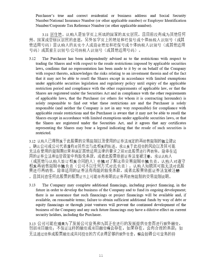 11 Purchaser’s true and correct residential or business address and Social Security Number/National Insurance Number (or other applicable number) or Employer Identification Number/Corporate Tax Reference Number (or other applicable number) . 11. ት ἶ✗ DŽ 䇔䍝 ạ㘖 ㆮ ⬾ 亥 ᷱ ᡰ ປ 䙫 ഭ ⮝䙫 ⵏᇎ ት 㯸 ˈ ᷻䛕∴ ⋑ 㛰 ᡀ Ѫ ⅝ẽỢἼ ⷅ ǃ ഭ ⮝ ᡆ㇑ 䗆४ ት 㯸䙫 ᝯ ˈ ⏍⣽ ㆮ ⬾ 亥 ᷱ䙫✗✧ ઼ 䤥 ؍ ਧ ᡆ њ Ἲ 㓣〾 ạ 䇶࡛ਧ ˄ ᡆ ⅝ ẽ 䘲 䔏 ਧ⸱ ˅ 㘖 䇔䍝 ạ䙫 ⵏᇎњ ạ ᡆ୶ ъ ✗✧ ઼ 䤥 ؍ ਧ ᡆ њ Ἲ 㓣〾 ạ 䇶࡛ਧ ˄ ᡆ ⅝ẽ 䘲 䔏 ਧ⸱ ˅ ᡆ ⅝ 䳷 Ḣ 䇶࡛ਧ / ⅓ ਨ 㓣〾 ạ 䇶࡛ਧ ˄ ᡆ ⅝ẽ 䘲 䔏 ਧ⸱ ˅ DŽ 12. The Purchaser has been independently advised as to the restrictions with respect to trading the Shares and with respect to the resale restrictions imposed by applicable securities laws, confirms that no representation has been made to it by or on behalf of the Company with respect thereto, acknowledges the risks relating to an investment therein and of the fact that it may not be able to resell the Shares except in accordance with limited exemptions under applicable securities legislation and regulatory policy until expiry of the applicable restriction period and compliance with the other requirements of applicable law, or that the Shares are registered under the Securities Act and in compliance with the other requirements of applicable laws, that the Purchaser (or others for whom it is contracting hereunder) is solely responsible to find out what these restrictions are and the Purchaser is solely responsible (and neither the Company is not in any way responsible) for compliance with applicable resale restrictions and the Purchaser is aware that it may not be able to resell the Shares except in accordance with limited exemptions under applicable securities laws, or that the Shares are registered under the Securities Act, and it agrees that any certificates representing the Shares may bear a legend indicating that the resale of such securities is restricted . 12. 䇔䍝 ạⷙ⽾∗ ය ṵ㭋傈䥏䙫ẋ㗺 䲀 ∝Ọ⎱ὦ䔏䙫 䇱 ∟㲼 㿴 ⮁䙫ⅴ 䬰 䲀 ∝䙫 ⊂ 狏⻡ 䇞 ˈ 䡕 䇔 ⅓ ਨᡆ ⅓ ਨ Ị塏 ἐ 㛰 ሩ ⅝ὃ⇡᷵㭋䛟 ය 䙫 䱸 䘠 ˈ 䇔 ය ṵ㭋 ᣅ 䍴 䙫梵 䲙 Ọ⎱⅝ ਟ 僤 㗇㲼✏ὦ䔏䙫 䲀 ∝㜆 㔃 㝆 ઼ ┑ 嶚⅝ẽ 䘲 䔏㲼⽲䙫奨㰩Ḳ∴ ሩ 㭋傈䥏 䘋 堳ⅴ 䬰 ˈ 䲔 狠✏ 䘲 䔏䙫 䇱 ∟狏㲼 ઼ ⴁ ㇑ 㔦 ㆆ Ḕ㛰 䉱 ℴ㝈㬥 ˈ ᡆ 俬㭋傈䥏ᾄ ᦞ 䇱 ∟㲼 Ṹ 墒㳏 ˈ 䇔䇔䍝 ạ ˄ ᡆ ⅝ẽ᷵ 䇔䍝 ạ ㆮ䇒 䛟 ය ਸ਼ 䙫ạ ˅ অ ⊂ ሩ ṭ姊 䘉 Ẃẋ㗺 䲀 ∝ অ ⊂ 䍏䍓 ˈ 䇔䍝 ạ ሩ 䚥 ⭯ 䛟 ය ⅴ 䬰 䲀 ∝ অ ⊂ 䍏䍓 ˄ ⅓ ਨ ᷴỌỢἼ㖠 ሩ 㭋 䍏䍓 ˅ ˈ 䇔䍝 ạ ⸕ 㘺⅝ ਟ 僤㗇㲼 ሩ 㭋傈 䥏 䘋 堳ⅴ 䬰 ˈ 䲔 狠 䘲 䔏䙫 䇱 ∟㲼㛰㛰 䲀 䙫 䉱 ℴ㝈㬥 ˈ ᡆ 俬㭋傈䥏ᾄ ᦞ 䇱 ∟㲼 Ṹ 墒㳏 ˈ ᷻⅝ ਼ ỢἼ㭋傈䥏䙫傈䥏 䇱Җ ᷱ ਟ 僤 ᑖ 㛰塏㗵㭋 䇱 ∟ⅴ 䬰 䲀 ∝䙫ẋ㗺 䲀 ∝ 䈤 㗵 DŽ 13. The Company may complete additional financings, including project financing, in the future in order to develop the business of the Company and to fund its ongoing development ; there is no assurance that such financings or project financings will be available and, if available, on reasonable terms ; failure to obtain sufficient additional funds by way of debt or equity financings or through joint ventures will prevent the continued development of the business of the Company and any such future financings may have a dilutive effect on current security holders, including the Purchaser . 3.13 ⅓ ਨਟ 僤✏ ᑗ᮶ Ѫ ṭ⎸ ኅ ⅓ ਨ ḁ⊈ ઼ Ѫ ⅝㭊✏ 䘋 堳䙫⎸ ኅᨀ ᾂ 䍴 憸俳 䘋 堳 仍 ⣽ 㶽 䍴 ˈ ⋬ ᤜ 亩 䛕 㶽 䍴 ˗ ᷴ ؍ 䇱䘉 ṧ 䙫 㶽 䍴 ᡆ 亩 䛕 㶽 䍴 ᑗ ἁ⬿✏ ˈ ྲ 㞃⬿✏ ˈ ἁ㛰 ਸ⨶ 䙫㝈㬥 ˗ ྲ 㗇㲼 䙊 䗷٪ ∟ ᡆ 傈䥏 㶽 䍴 ᡆ ⅘ ਼ᣅ 䍴 䙫㖠 㧧 ⽾嶚⤆䙫 仍 ⣽ 䍴 憸 ˈ ᑗ ἁ ࿘ 䡴⅓ ਨ ḁ⊈䙫 ᤱ
