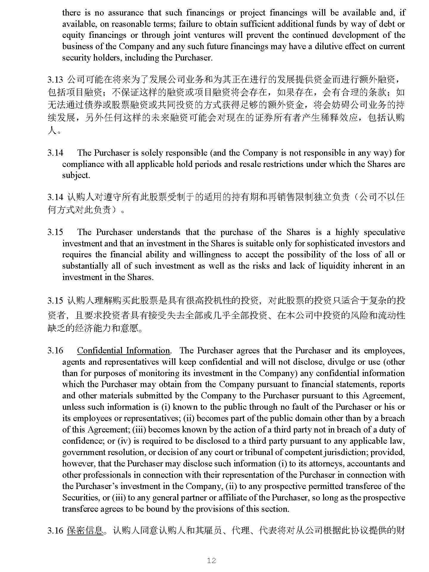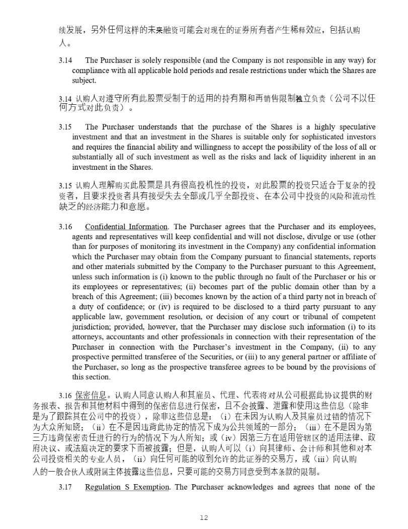 12 4928 - 2523 - 4026, v. 8 14. 䇔䍝Ӫሩ䚥ᆸᡰᴹ↔㛑⾘ਇࡦҾⲴ䘲⭘Ⲵᤱᴹᵏ઼䬰䲀ࡦ⤜・䍏䍓 ˄ ޜਨнԕԫ օᯩᔿሩ↔䍏䍓 ˅ DŽ 15. The Purchaser understands that the purchase of the Shares is a highly speculative investment and that an investment in the Shares is suitable only for sophisticated investors and requires the financial ability and willingness to accept the possibility of the loss of all or substantially all of such investment as well as the risks and lack of liquidity inherent in an investment in the Shares . 15. 䇔䍝Ӫ⨶䀓䍝Ҡ↔㛑⾘ᱟާᴹᖸ儈ᣅᵪᙗⲴᣅ䍴 ˈ ሩ↔㛑⾘Ⲵᣅ䍴ਚ䘲ਸҾ༽ᵲⲴᣅ 䍴㘵 ˈ ф㾱≲ᣅ䍴㘵ާᴹ᧕ਇཡ৫ޘ䜘ᡆࠐѾޘ䜘ᣅ䍴 ǃ ൘ᵜޜਨѝᣅ䍴Ⲵ仾䲙઼⍱ࣘᙗ 㕪ѿⲴ㓿⍾㜭઼࣋ᝯ DŽ 16. Confidential Information . The Purchaser agrees that the Purchaser and its employees, agents and representatives will keep confidential and will not disclose, divulge or use (other than for purposes of monitoring its investment in the Company) any confidential information which the Purchaser may obtain from the Company pursuant to financial statements, reports and other materials submitted by the Company to the Purchaser pursuant to this Agreement, unless such information is (i) known to the public through no fault of the Purchaser or his or its employees or representatives ; (ii) becomes part of the public domain other than by a breach of this Agreement ; (iii) becomes known by the action of a third party not in breach of a duty of confidence ; or (iv) is required to be disclosed to a third party pursuant to any applicable law, government resolution, or decision of any court or tribunal of competent jurisdiction ; provided, however, that the Purchaser may disclose such information (i) to its attorneys, accountants and other professionals in connection with their representation of the Purchaser in connection with the Purchaser’s investment in the Company, (ii) to any prospective permitted transferee of the Securities, or (iii) to any general partner or affiliate of the Purchaser, so long as the prospective transferee agrees to be bound by the provisions of this section . 16. ؍ᇶؑ DŽ 䇔䍝Ӫ਼䇔䍝Ӫ઼ަ䳷ઈ ǃ ԓ⨶ ǃ ԓ㺘ሶሩӾޜਨṩᦞ↔ॿ䇞ᨀⲴ䍒 ࣑ᣕ㺘 ǃ ᣕ઼ަԆᶀᯉѝᗇࡠⲴ؍ᇶؑ䘋㹼؍ᇶ ˈ фнՊᣛ䵢 ǃ ⋴䵢઼֯⭘䘉Ӌؑ ˄ 䲔䶎 ᱟѪҶ䐏䑚ަ൘ޜਨѝⲴᣅ䍴 ˅ ˈ 䲔䶎䘉Ӌؑᱟ ˖ ˄ i ˅ ൘ᵚഐѪ䇔䍝Ӫ৺ަ䳷ઈ䗷䭉Ⲵᛵߥл ѪབྷՇᡰ⸕ᲃ ˗ ˄ ii ˅ ൘нᱟഐ䘍㛼↔ॿᇊⲴᛵߥлᡀѪޜޡ亶ฏⲴа䜘࠶ ˗ ˄ iii ˅ ൘нᱟഐѪㅜ йᯩ䘍㛼؍ᇶ䍓ԫ䘋㹼Ⲵ㹼ѪⲴᛵߥлѪӪᡰ⸕ ˗ ᡆ ˄ iv ˅ ഐㅜйᯩ൘䘲⭘㇑䗆४Ⲵ䘲⭘⌅ᖻ ǃ ᭯ᓌߣ䇞 ǃ ᡆ⌅ᓝߣᇊⲴ㾱≲л㘼㻛ᣛ䵢 ˗ նᱟ ˈ 䇔䍝Ӫਟԕ ˄ i ˅ ੁަᖻᐸ ǃ Պ䇑ᐸ઼ަԆ઼ሩ ᵜޜਨᣅ䍴ޣⲴуъӪઈ ˈ ˄ ii ˅ ੁԫօਟ㜭Ⲵ᭦ࡠݱ䇨Ⲵ↔䇱ࡨⲴӔ᱃ᯩ ˈ ᡆ ˄ iii ˅ ੁ䇔䍝Ӫ Ⲵа㡜ਸՉӪᡆ䱴ѫփᣛ䵢䘉Ӌؑ ˈ ਚ㾱ਟ㜭ⲴӔ᱃ᯩ਼ਇࡠᵜᶑⅮⲴ䲀ࡦ DŽ 17. Regulation S Exemption . The Purchaser acknowledges and agrees that none of the Shares have been registered under the Securities Act, or under any state securities or "blue sky" laws of any state of the United States, and are being offered only in a transaction not involving any public offering within the meaning of the Securities Act, and, unless so registered, may not be offered or sold in the United States or to U . S . Persons (as defined herein), except pursuant to an effective registration statement under the Securities Act, or pursuant to an exemption from, or in a transaction not subject to, the registration requirements of the Securities Act, and in each case only in accordance with applicable state and federal securities laws . The Purchaser