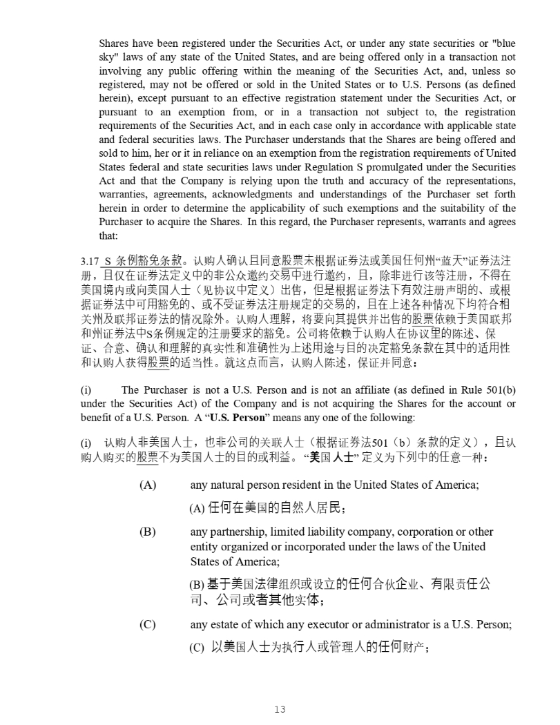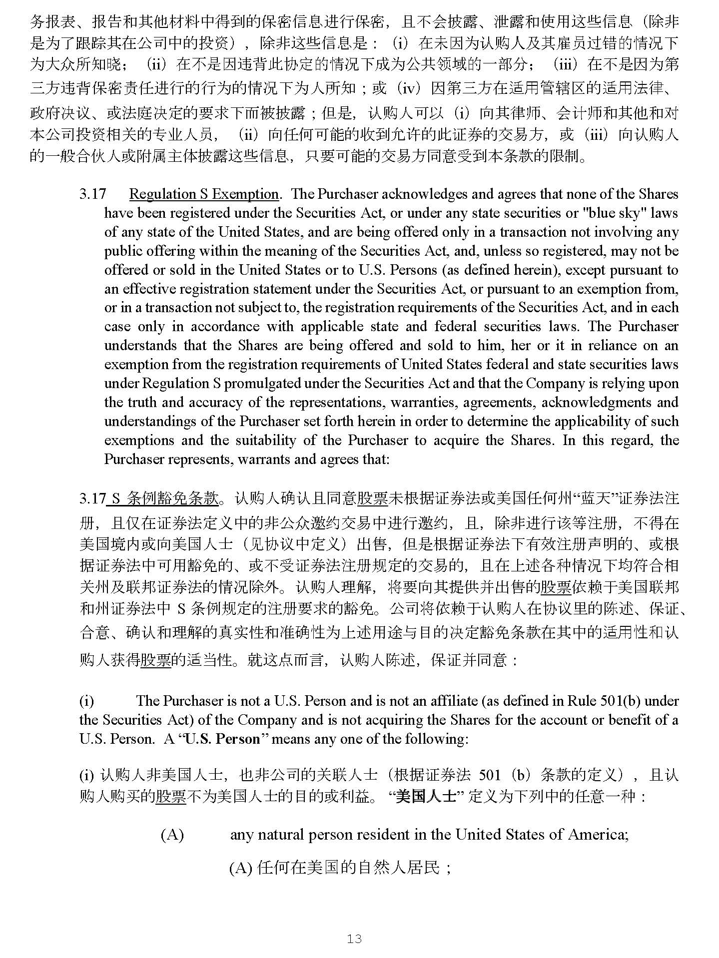 13 Shares have been registered under the Securities Act, or under any state securities or "blue sky" laws of any state of the United States, and are being offered only in a transaction not involving any public offering within the meaning of the Securities Act, and, unless so registered, may not be offered or sold in the United States or to U . S . Persons (as defined herein), except pursuant to an effective registration statement under the Securities Act, or pursuant to an exemption from, or in a transaction not subject to, the registration requirements of the Securities Act, and in each case only in accordance with applicable state and federal securities laws . The Purchaser understands that the Shares are being offered and sold to him, her or it in reliance on an exemption from the registration requirements of United States federal and state securities laws under Regulation S promulgated under the Securities Act and that the Company is relying upon the truth and accuracy of the representations, warranties, agreements, acknowledgments and understandings of the Purchaser set forth herein in order to determine the applicability of such exemptions and the suitability of the Purchaser to acquire the Shares . In this regard, the Purchaser represents, warrants and agrees that : 3.17 S ᶑ ὲ 䉱 ℴ ᶑ 㬥 DŽ 䇔䍝 ạ䡕 䇔 ᷻ ਼ 傈䥏 㜑 ṩᦞ 䇱 ∟㲼 ᡆ 併 ഭ ỢἼⷅ “ 㬍 ⤐ ” 䇱 ∟㲼㳏 ˈ ᷻ ӵ ✏ 䇱 ∟㲼⮁ ѹ Ḕ䙫狠⅓ Շ 䚰 㓖 ẋ㗺Ḕ 䘋 堳 䚰 㓖 ˈ ᷻ ˈ 䲔 狠 䘋 堳 䈕 ㅹ 㳏 ˈ ᷴ⽾✏ 併 ഭ ⡪ ᡆੁ 併 ഭ ạ⣒ ˄ 㿱ॿ䇞 Ḕ⮁ ѹ ˅ ⇡ ˈ Ἥ㘖 ṩᦞ 䇱 ∟㲼ᷲ㛰㔯㳏 ༠ 㗵䙫 ǃ ᡆṩ ᦞ 䇱 ∟㲼Ḕ ਟ 䔏 䉱 ℴ䙫 ǃ ᡆ ᷴ⎾ 䇱 ∟㲼㳏 㿴 ⮁䙫ẋ㗺䙫 ˈ ᷻✏ᷱ 䘠 ᛵ ߥ ᷲ✮ ㅖਸ 䛟 ޣ ⷅ⎱ 㚄 䛖 䇱 ∟㲼䙫 ᛵ ߥ 䲔 ⣽ DŽ 䇔䍝 ạ ⨶ 姊 ˈ ሶ 奨 ੁ ⅝ ᨀ ᾂ ᒦ ⇡ 䙫 傈䥏 ᾄ 䎆 ṵ併 ഭ㚄 䛖 ઼ ⷅ 䇱 ∟㲼Ḕ S ᶑ ὲ 㿴 ⮁䙫㳏 奨㰩䙫 䉱 ℴ DŽ ⅓ ਨ ሶ ᾄ 䎆 ṵ 䇔䍝 ạ✏ ॿ䇞 憳䙫 䱸 䘠 ǃ ؍ 䇱 ǃ ਸ ǃ 䡕 䇔 ઼⨶ 姊䙫 ⵏᇎ ᙗ઼ ↭䡕 ᙗ Ѫ ᷱ 䘠 䔏 䙄 о 䛕䙫 ߣ ⮁ 䉱 ℴ ᶑ 㬥✏⅝Ḕ䙫 䘲 䔏 ᙗ ઼ 䇔䍝 ạ 㧧 ⽾ 傈䥏 䙫 䘲 ᖃ ᙗ DŽ ቡ 䘉 ⛩ 俳姧 ˈ 䇔䍝 ạ 䱸 䘠 ˈ ؍ 䇱ᒦ ਼ ˖ (i) The Purchaser is not a U . S . Person and is not an affiliate (as defined in Rule 501 (b) under the Securities Act) of the Company and is not acquiring the Shares for the account or benefit of a U . S . Person . A “ U . S . Person ” means any one of the following : (i) 䇔䍝 ạ狠併 ഭ ạ⣒ ˈ Ṇ狠⅓ ਨ 䙫 ޣ㚄 ạ⣒ ˄ ṩᦞ 䇱 ∟㲼 501 ˄ b ˅ ᶑ 㬥䙫⮁ ѹ ˅ ˈ ᷻ 䇔 䍝 ạ 䍝Ҡ 䙫 傈䥏 ᷴ Ѫ 併 ഭ ạ⣒䙫䛕䙫 ᡆ ∐䚱 DŽ “ 䖤 ഭ ᵸ➩ ” ⮁ ѹѪ ᷲ⇾Ḕ䙫Ợ ᷧ ˖ (A) any natural person resident in the United States of America; (A) ỢἼ✏併 ഭ 䙫凑 ❦ ạ ት 㯸 ˗ any partnership, limited liability company, corporation or other entity organized or incorporated under the laws of the United States of America; (B) ⟡ṵ併 ഭ 㲼⽲ 㓴㓷 ᡆ 䇮 狏䙫ỢἼ ਸ Չ Ứ ъ ǃ 㛰 䲀 䍓 Ợ⅓ ਨ ǃ ⅓ ਨᡆ 俬⅝ẽ ᇎ Ἲ ˗ any estate of which any executor or administrator is a U.S. Person; (C) Ọ併 ഭ ạ⣒ Ѫᢗ 堳ạ ᡆ㇑⨶ ạ䙫ỢἼ 䍒ӗ ˗ (B) (C)