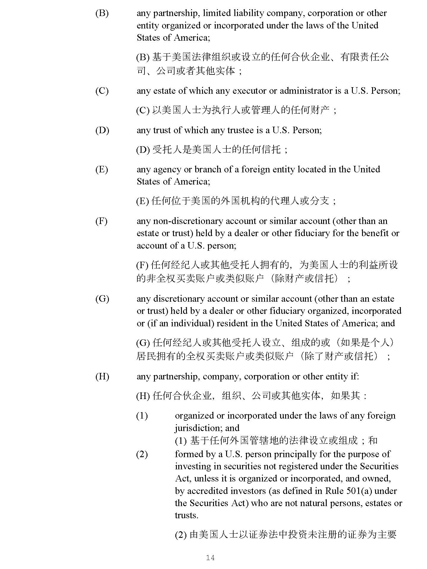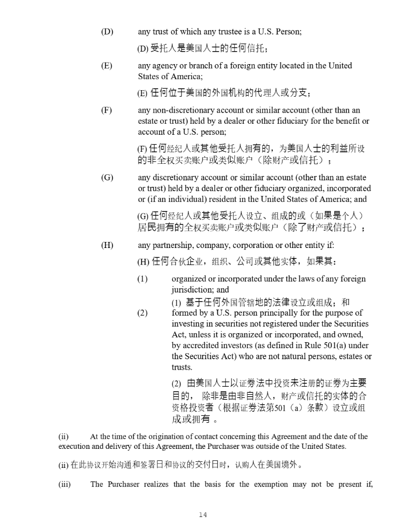 14 4928 - 2523 - 4026, v. 8 (F) any non - discretionary account or similar account (other than an estate or trust) held by a dealer or other fiduciary for the benefit or account of a U.S. person; (F ) ԫօ㓿㓚ӪᡆަԆਇᢈӪᤕᴹⲴ ˈ Ѫ㖾ഭӪ༛Ⲵ࡙⳺ᡰ䇮 Ⲵ䶎ޘᵳҠআ䍖ᡧᡆ㊫լ䍖ᡧ ˄ 䲔䍒ӗᡆؑᢈ ˅˗ (G) any discretionary account or similar account (other than an estate or trust) held by a dealer or other fiduciary organized, incorporated or (if an individual) resident in the United States of America; and (G ) ԫօ㓿㓚ӪᡆަԆਇᢈӪ䇮・ ǃ 㓴ᡀⲴᡆ ˄ ྲ᷌ᱟњӪ ˅ ት≁ᤕᴹⲴޘᵳҠআ䍖ᡧᡆ㊫լ䍖ᡧ ˄ 䲔Ҷ䍒ӗᡆؑᢈ ˅˗ (H) any partnership, company, corporation or other entity if: (H ) ԫօਸՉԱъ ˈ 㓴㓷 ǃ ޜਨᡆަԆᇎփ ˈ ྲ᷌ަ ˖ (1) organized or incorporated under the laws of any foreign jurisdiction; and (1) สҾԫօཆഭ㇑䗆ൠⲴ⌅ᖻ䇮・ᡆ㓴ᡀ ˗ ઼ formed by a U.S. person principally for the purpose of investing in securities not registered under the Securities Act, unless it is organized or incorporated, and owned, by accredited investors ( as defined in Rule 501(a ) under the Securities Act) who are not natural persons, estates or trusts. (2) ⭡㖾ഭӪ༛ԕ䇱ࡨ⌅ѝᣅ䍴ᵚ⌘Ⲵ䇱ࡨѪѫ 㾱 ⴞⲴ ˈ 䲔䶎ᱟ⭡䶎㠚❦Ӫ ˈ 䍒ӗᡆؑᢈⲴᇎփⲴ ਸ 䍴Ṭᣅ䍴㘵 ˄ ṩᦞ䇱ࡨ⌅ㅜ 501 ˄ a ˅ ᶑⅮ ˅ 䇮・ ᡆ 㓴ᡀᡆᤕᴹ DŽ (2) (ii) At the time of the origination of contact concerning this Agreement and the date of the execution and delivery of this Agreement, the Purchaser was outside of the United States . (ii) ൘↔ॿ䇞ᔰ⋏䙊઼ㆮ㖢ᰕ઼ॿ䇞ⲴӔԈᰕᰦ ˈ 䇔䍝Ӫ൘㖾ഭຳཆ DŽ (iii) The Purchaser realizes that the basis for the exemption may not be present if, notwithstanding such representations, the Purchaser has in mind merely acquiring the Shares for a fixed or determinable period in the future, or for a market rise, or for sale if the market does not rise . The Purchaser does not have any such intention . (iii) 䇔䍝ӪҶ䀓 ˈ ቭ㇑ࠪޣ䱸䘠 ˈ նྲ᷌䇔䍝Ӫ䇔䍝ӵമѪ൘ᵚᶕаᇊᵏ䰤ᤱᴹ 㛑⾘ ǃ ᡆѪᐲ൪к⏘ ǃ ᡆѪ൘ᐲ൪ᵚк⏘Ⲵᛵߥлࠪ ˈ ࡉ䉱ݽⲴᦞਟ㜭нᆈ൘ DŽ 䇔䍝 Ӫ⋑ᴹк䘠മ DŽ