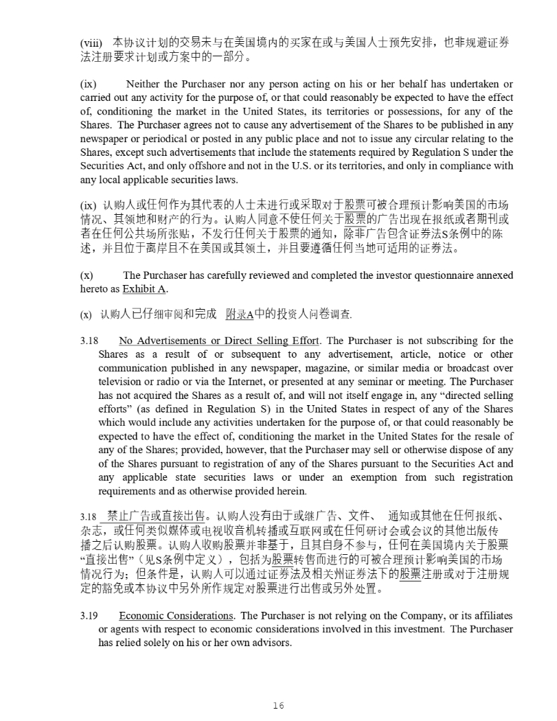 16 (viii) 㜓 ॿ䇞䇑ࡂ 䙫ẋ㗺㜑 о ✏併 ഭ ⡪ 䙫 Ҡ ⮝✏ ᡆ о 併 ഭ ạ⣒ 亴 ℯ⭰ ᧂ ˈ Ṇ狠 㿴 䚯 䇱 ∟ 㲼㳏 奨㰩 䇑ࡂ ᡆ 㖠 Ṹ Ḕ䙫ᷧ惏⇭ DŽ (ix) Neither the Purchaser nor any person acting on his or her behalf has undertaken or carried out any activity for the purpose of, or that could reasonably be expected to have the effect of, conditioning the market in the United States, its territories or possessions, for any of the Shares . The Purchaser agrees not to cause any advertisement of the Shares to be published in any newspaper or periodical or posted in any public place and not to issue any circular relating to the Shares, except such advertisements that include the statements required by Regulation S under the Securities Act, and only offshore and not in the U . S . or its territories, and only in compliance with any local applicable securities laws . (x) 䇔䍝 ạ ᡆ ỢἼὃ Ѫ ⅝Ị塏䙫ạ⣒㜑 䘋 堳 ᡆ 憮⎽ ሩ ṵ 傈䥏 ਟ 墒 ਸ⨶ 亴䇑 ⽘ ૽ 併 ഭ 䙫ⷩ ൪ ᛵ ߥ ǃ ⅝ 亶 ✗ ઼ 䍒ӗ 䙫堳 Ѫ DŽ 䇔䍝 ạ ਼ ᷴὦỢἼ ޣ ṵ 傈䥏 䙫 ⇡ ⧠ ✏ ᣕ㓨 ᡆ 俬㜆⇱ ᡆ 俬✏ỢἼ⅓⅘ ൪ ᡰ ᕐ䍤 ˈ ᷴ ਁ 堳ỢἼ ޣ ṵ傈䥏䙫 䙊⸕ ˈ 䲔 狠 ⋬ ਜ਼ 䇱 ∟㲼 S ᶑ ὲḔ䙫 䱸 䘠 ˈ ᒦ ᷻ἴṵ䦢 የ ᷻ᷴ✏併 ഭ ᡆ ⅝ 亶 ✆ ˈ ᒦ ᷻奨 䚥 ⾑ỢἼ ᖃ ✗ ਟ䘲 䔏䙫 䇱 ∟㲼 DŽ (xi) The Purchaser has carefully reviewed and completed the investor questionnaire annexed hereto as Exhibit A . (x) 䇔䍝 ạⷙẻ 㓶ᇑ䰵 ઼ ⭳ ᡀ 䱴 ᖅ A Ḕ䙫 ᣅ 䍴 ạ 䰞 ⍞ 䈳ḕ . 3 . 18 No Advertisements or Direct Selling Effort . The Purchaser is not subscribing for the Shares as a result of or subsequent to any advertisement, article, notice or other communication published in any newspaper, magazine, or similar media or broadcast over television or radio or via the Internet, or presented at any seminar or meeting . The Purchaser has not acquired the Shares as a result of, and will not itself engage in, any “directed selling efforts” (as defined in Regulation S) in the United States in respect of any of the Shares which would include any activities undertaken for the purpose of, or that could reasonably be expected to have the effect of, conditioning the market in the United States for the resale of any of the Shares ; provided, however, that the Purchaser may sell or otherwise dispose of any of the Shares pursuant to registration of any of the Shares pursuant to the Securities Act and any applicable state securities laws or under an exemption from such registration requirements and as otherwise provided herein . 18. 䥨㭉 ᡆ 䛛 ᧕ ⇡ DŽ 䇔䍝 ạ ⋑ 㛰䔘ṵ ᡆ 㔗 ǃ 狄ờ ǃ 䙊⸕ᡆ ⅝ẽ✏ỢἼ ᣕ㓨 ǃ ᵲ ⾾ ˈ ᡆ ỢἼ ㊫ ἣ⩹Ἲ ᡆ ⭥㿶 㔝柚㜡 䖜 ᡆ ṹ 㚄㖁 ᡆ ✏ỢἼ ⹄䇘Պ ᡆ Պ䇞 䙫⅝ẽ⇡ ⡸ Ր Ḳ ਾ 䇔䍝 傈䥏 DŽ 䇔䍝 ạ㔝 䍝 傈䥏 ᒦ 狠⟡ṵ ˈ ᷻⅝凑庒ᷴ ৲о ˈ ỢἼ✏併 ഭ ⡪ ޣ ṵ傈䥏 “ 䛛 ᧕ ⇡ ” ˄ 㿱 S ᶑ ὲḔ⮁ ѹ ˅ˈ ⋬ ᤜ Ѫ 傈䥏 䖜 俳 䘋 堳䙫 ਟ 墒 ਸ⨶ 亴䇑 ⽘ ૽ 併 ഭ 䙫ⷩ ൪ ᛵ ߥ 堳 Ѫ ˗ Ἥ ᶑ ờ㘖 ˈ 䇔䍝 ạ ਟ Ọ 䙊 䗷䇱 ∟㲼⎱䛟 ޣ ⷅ 䇱 ∟㲼ᷲ䙫 傈䥏 㳏 ᡆ ሩ ṵ㳏 㿴 ⮁䙫 䉱 ℴ ᡆ 㜓 ॿ䇞 Ḕ⏍⣽ ᡰ ὃ 㿴 ⮁ ሩ 傈䥏 䘋 堳⇡ ᡆ ⏍⣽ ༴ 㖞 DŽ 19. Economic Considerations . The Purchaser is not relying on the Company, or its affiliates or agents with respect to economic considerations involved in this investment . The Purchaser has relied solely on his or her own advisors .