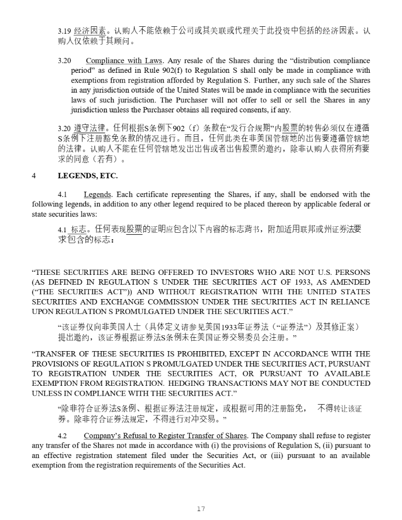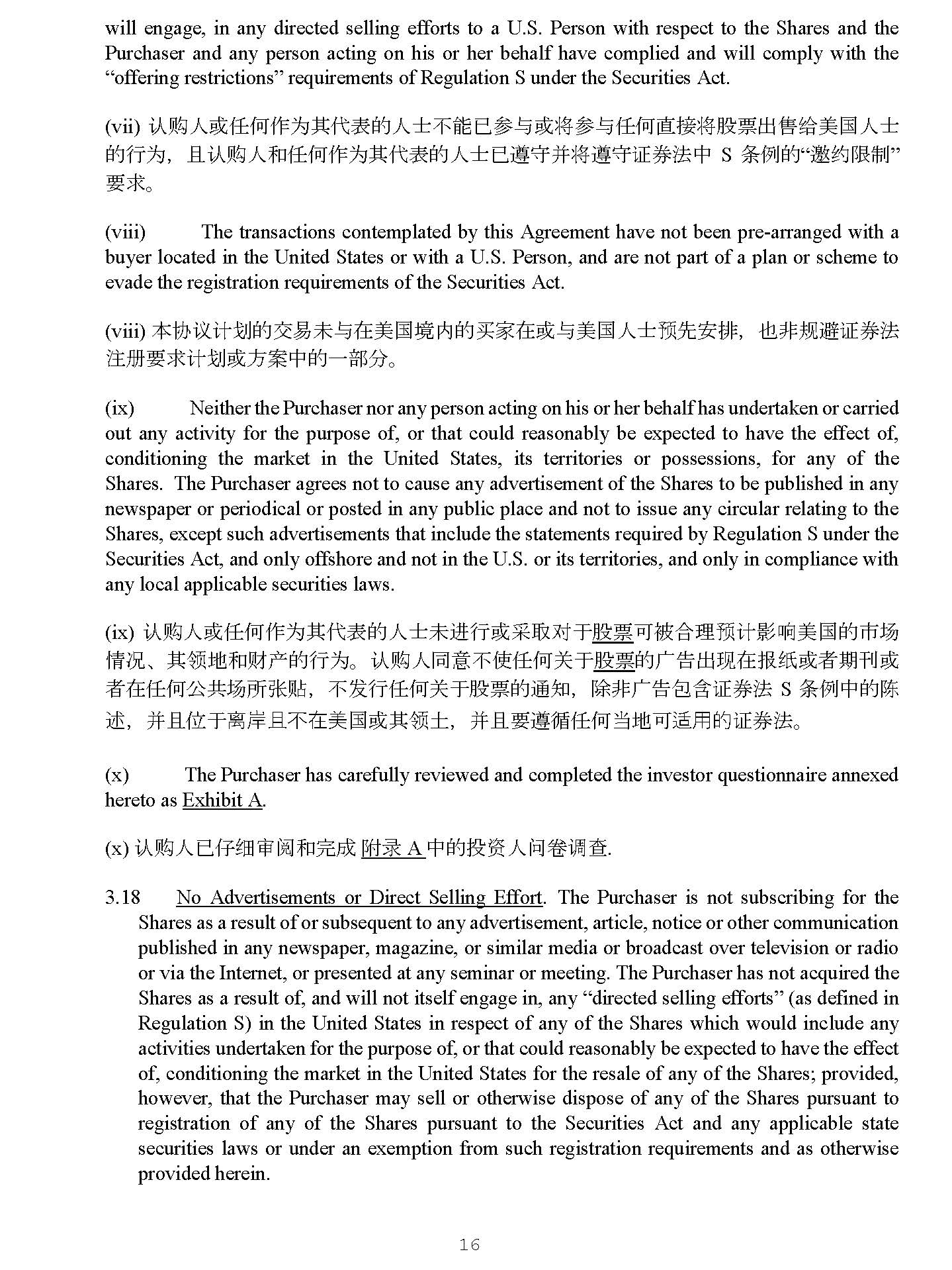 16 4928 - 2523 - 4026, v. 8 Shares, except such advertisements that include the statements required by Regulation S under the Securities Act, and only offshore and not in the U . S . or its territories, and only in compliance with any local applicable securities laws . (ix) 䇔䍝ӪᡆԫօѪަԓ㺘ⲴӪ༛ᵚ䘋㹼ᡆ䟷ਆሩҾ 㛑⾘ ਟ㻛ਸ⨶亴䇑ᖡ૽㖾ഭⲴᐲ൪ ᛵߥ ǃ ަ亶ൠ઼䍒ӗⲴ㹼Ѫ DŽ 䇔䍝Ӫ਼н֯ԫօޣҾ 㛑⾘ Ⲵᒯࠪ⧠൘ᣕ㓨ᡆ㘵ᵏ࠺ᡆ 㘵൘ԫօޜޡ൪ᡰᕐ䍤 ˈ нਁ㹼ԫօޣҾ㛑⾘Ⲵ䙊⸕ ˈ 䲔䶎ᒯवਜ਼䇱ࡨ⌅ S ᶑֻѝⲴ䱸 䘠 ˈ ᒦфսҾየфн൘㖾ഭᡆަ亶൏ ˈ ᒦф㾱䚥ᗚԫօᖃൠਟ䘲⭘Ⲵ䇱ࡨ⌅ DŽ (x) The Purchaser has carefully reviewed and completed the investor questionnaire annexed hereto as Exhibit A . (x) 䇔䍝ӪᐢԄ㓶ᇑ䰵઼ᆼᡀ 䱴ᖅ A ѝⲴᣅ䍴Ӫ䰞ধ䈳ḕ . 3 . 18 No Advertisements or Direct Selling Effort . The Purchaser is not subscribing for the Shares as a result of or subsequent to any advertisement, article, notice or other communication published in any newspaper, magazine, or similar media or broadcast over television or radio or via the Internet, or presented at any seminar or meeting . The Purchaser has not acquired the Shares as a result of, and will not itself engage in, any “directed selling efforts” (as defined in Regulation S) in the United States in respect of any of the Shares which would include any activities undertaken for the purpose of, or that could reasonably be expected to have the effect of, conditioning the market in the United States for the resale of any of the Shares ; provided, however, that the Purchaser may sell or otherwise dispose of any of the Shares pursuant to registration of any of the Shares pursuant to the Securities Act and any applicable state securities laws or under an exemption from such registration requirements and as otherwise provided herein . 18. ⾱→ᒯᡆⴤ᧕ࠪ DŽ 䇔䍝Ӫ⋑ᴹ⭡Ҿᡆ㔗ᒯ ǃ ᮷Ԧ ǃ 䙊⸕ᡆަԆ൘ԫօᣕ㓨 ǃ ᵲ ᘇ ˈ ᡆԫօ㊫լჂփᡆ⭥㿶᭦丣ᵪ䖜ᡆӂ㚄㖁ᡆ൘ԫօ⹄䇘ՊᡆՊ䇞ⲴަԆࠪ⡸Րѻ ਾ䇔䍝㛑⾘ DŽ 䇔䍝Ӫ᭦䍝㛑⾘ᒦ䶎สҾ ˈ фަ㠚䓛н৲о ˈ ԫօ൘㖾ഭຳޣҾ㛑⾘ “ ⴤ ᧕ࠪ ” ˄ 㿱 S ᶑֻѝᇊѹ ˅ ˈ वᤜѪ 㛑⾘ 䖜㘼䘋㹼Ⲵਟ㻛ਸ⨶亴䇑ᖡ૽㖾ഭⲴᐲ൪ᛵߥ 㹼Ѫ ˗ նᶑԦᱟ ˈ 䇔䍝Ӫਟԕ䙊䗷䇱ࡨ⌅৺ޣᐎ䇱ࡨ⌅лⲴ 㛑⾘ ⌘ᡆሩҾ⌘㿴ᇊⲴ 䉱ݽᡆᵜॿ䇞ѝਖཆᡰ㿴ᇊሩ㛑⾘䘋㹼ࠪᡆਖཆ༴㖞 DŽ 19. Economic Considerations . The Purchaser is not relying on the Company, or its affiliates or agents with respect to economic considerations involved in this investment . The Purchaser has relied solely on his or her own advisors . 19. 㓿⍾ഐ㍐ DŽ 䇔䍝Ӫн㜭䎆Ҿޜਨᡆަޣ㚄ᡆԓ⨶ޣҾ↔ᣅ䍴ѝवᤜⲴ㓿⍾ഐ㍐ DŽ 䇔 䍝Ӫӵ䎆Ҿަ亮䰞 DŽ 20. Compliance with Laws . Any resale of the Shares during the “distribution compliance period” as defined in Rule 902 (f) to Regulation S shall only be made in compliance with exemptions from registration afforded by Regulation S . Further, any such sale of the Shares in any jurisdiction outside of the United States will be made in compliance with the securities laws of such jurisdiction . The Purchaser will not offer to sell or sell the Shares in any
