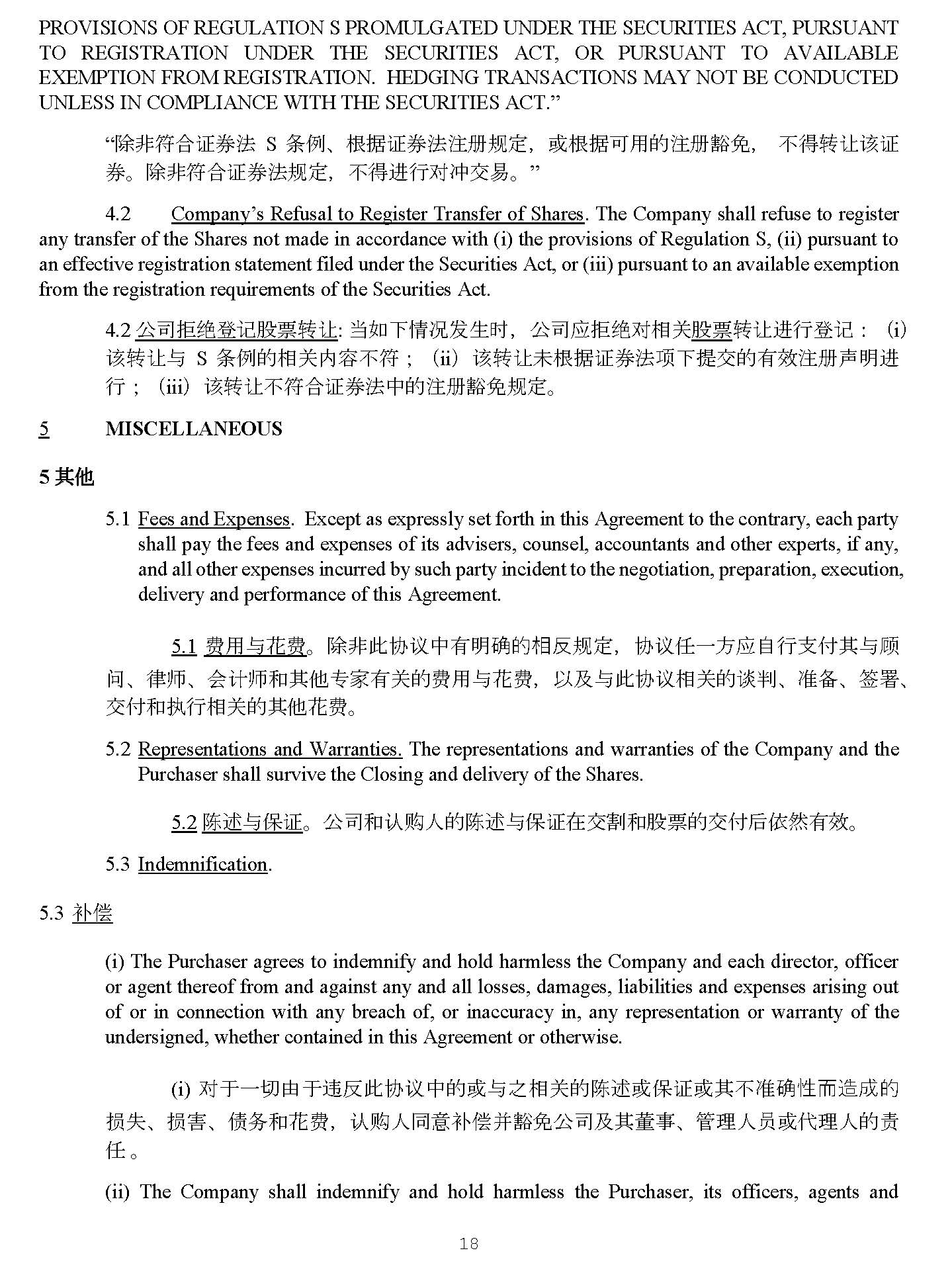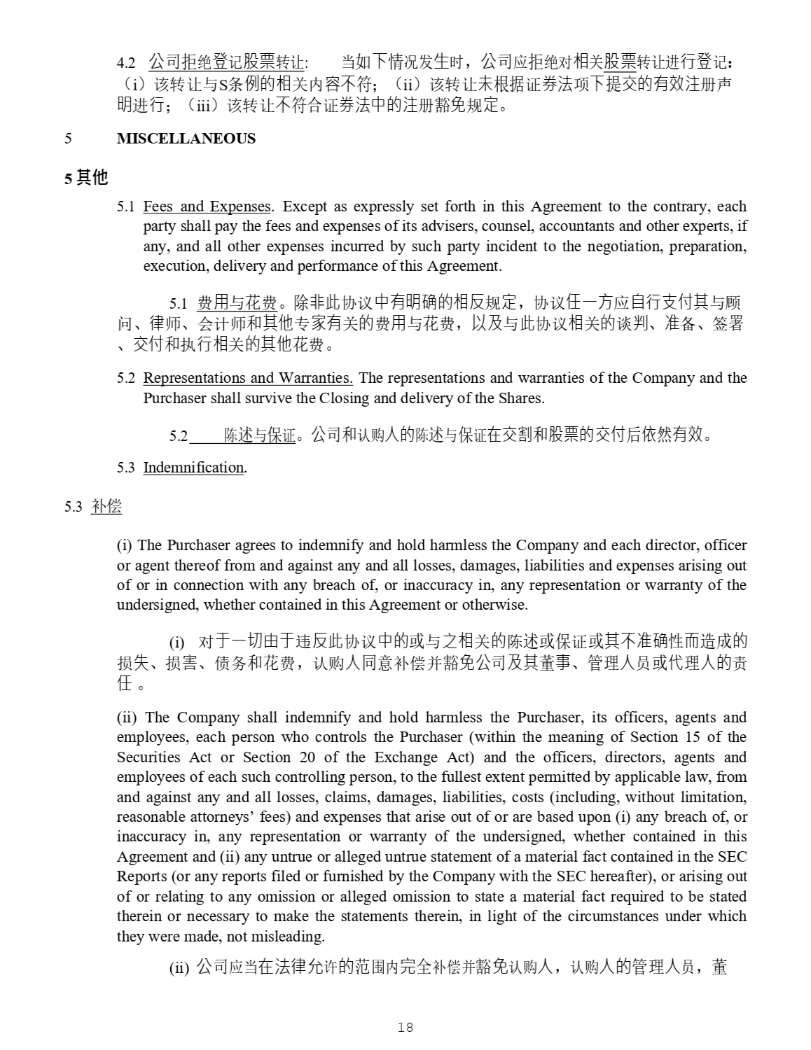 18 4.2 ⅓ ਨᤂ 㔍 䙢 䇠 傈 䥏 䖜 䇙 : ᖃ ྲ ᷲ ᛵ ߥ ਁ 䔆 ᰦ ˈ ⅓ ਨ ᓄ ᤂ 㔍 ሩ 䛟 ޣ 傈 䥏 䖜䇙 䘋 堳 䙢 䇠 ˖ ˄ i ˅ 䈕䖜䇙о S ᶑ ὲ䙫䛟 ޣ ⮠ᷴ ㅖ ˗ ˄ ii ˅ 䈕䖜䇙 㜑 ṩᦞ 䇱 ∟㲼 亩 ᷲ ᨀ ẋ䙫㛰㔯㳏 ༠ 㗵 䘋 堳 ˗˄ iii ˅ 䈕䖜䇙 ᷴ ㅖਸ 䇱 ∟㲼Ḕ䙫㳏 䉱 ℴ 㿴 ⮁ DŽ MISCELLANEOUS 5 5 ‴ᶔ 1. Fees and Expenses . Except as expressly set forth in this Agreement to the contrary, each party shall pay the fees and expenses of its advisers, counsel, accountants and other experts, if any, and all other expenses incurred by such party incident to the negotiation, preparation, execution, delivery and performance of this Agreement . 2. 䍩 䔏 о 㣡 䍩 DŽ 䲔 狠㭋 ॿ䇞 Ḕ㛰㗵䡕䙫䛟⎴ 㿴 ⮁ ˈ ॿ䇞 Ợᷧ㖠 ᓄ 凑堳㔖ế⅝ о亮 䰞 ǃ ⽲ ᐸ ǃ Պ䇑ᐸ ઼ ⅝ẽ у ⮝㛰 ޣ 䙫 䍩 䔏 о 㣡 䍩 ˈ Ọ⎱ о 㭋 ॿ䇞 䛟 ޣ 䙫 䈸 ∋ ǃ ↭ ༷ ǃ ㆮ 㖢 ǃ ẋế ઼ ᢗ 堳䛟 ޣ 䙫⅝ẽ 㣡 䍩 DŽ 2. Representations and Warranties . The representations and warranties of the Company and the Purchaser shall survive the Closing and delivery of the Shares . 3. 䱸 䘠 о ؍ 䇱 DŽ ⅓ ਨ઼ 䇔䍝 ạ䙫 䱸 䘠 о ؍ 䇱 ✏ẋ≙ ઼ 傈䥏䙫ẋế ਾ ᾄ ❦ 㛰㔯 DŽ 4. Indemnification . 3. 㺕گ (i) The Purchaser agrees to indemnify and hold harmless the Company and each director, officer or agent thereof from and against any and all losses, damages, liabilities and expenses arising out of or in connection with any breach of, or inaccuracy in, any representation or warranty of the undersigned, whether contained in this Agreement or otherwise . (i) ሩ ṵᷧ⇮䔘ṵ 䘍 ⎴㭋 ॿ䇞 Ḕ䙫 ᡆ о Ḳ䛟 ޣ 䙫 䱸 䘠ᡆ؍ 䇱 ᡆ ⅝ᷴ↭䡕 ᙗ 俳 䙐ᡀ 䙫 ᦏ ⤘ ǃ ᦏ ⮚ ǃ ٪࣑ ઼㣡 䍩 ˈ 䇔䍝 ạ ਼ 㺕گᒦ 䉱 ℴ⅓ ਨ ⎱⅝ 㪓 Ṳ ǃ ㇑⨶ ạ ઈ ᡆ Ị ⨶ ạ䙫 䍓 Ợ DŽ (ii) The Company shall indemnify and hold harmless the Purchaser, its officers, agents and employees, each person who controls the Purchaser (within the meaning of Section 15 of the Securities Act or Section 20 of the Exchange Act) and the officers, directors, agents and employees of each such controlling person, to the fullest extent permitted by applicable law, from and against any and all losses, claims, damages, liabilities, costs (including, without limitation, reasonable attorneys’ fees) and expenses that arise out of or are based upon (i) any breach of, or inaccuracy in, any representation or warranty of the undersigned, whether contained in this Agreement and (ii) any untrue or alleged untrue statement of a material fact contained in the SEC Reports (or any reports filed or furnished by the Company with the SEC hereafter), or arising out of or relating to any omission or alleged omission to state a material fact required to be stated therein or necessary to make the statements therein, in light of the circumstances under which they were made, not misleading . (ii ) ⅓ ਨ ᓄᖃ ✏㲼⽲ℨ 䇨 䙫 㤳 ത ⭳ ޘ 㺕گᒦ 䉱 ℴ 䇔䍝 ạ ˈ 䇔䍝 ạ䙫 ㇑⨶ ạ ઈ ˈ 㪓