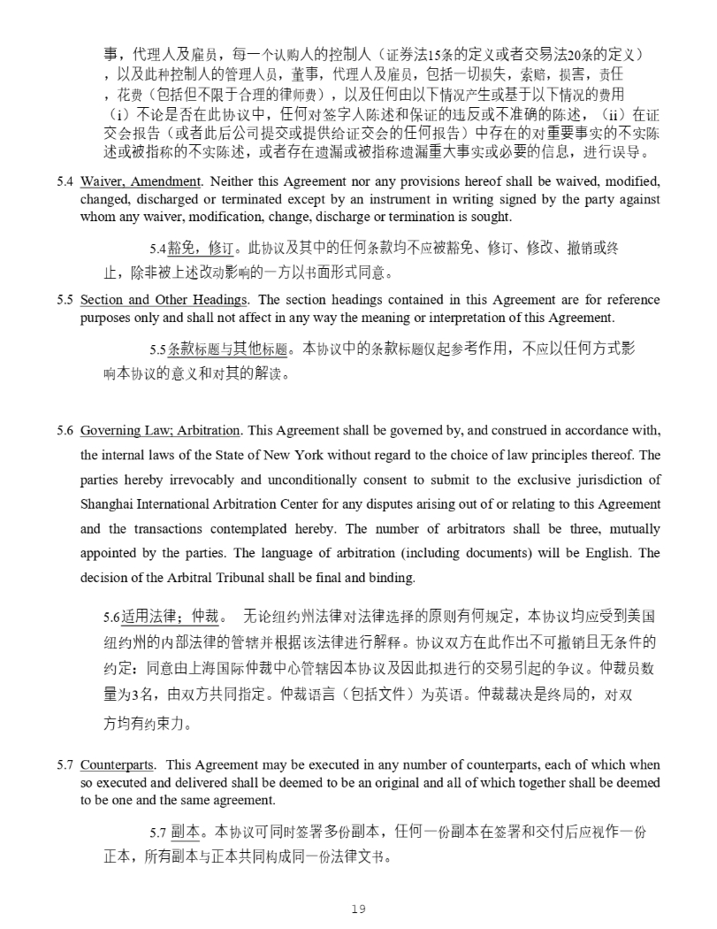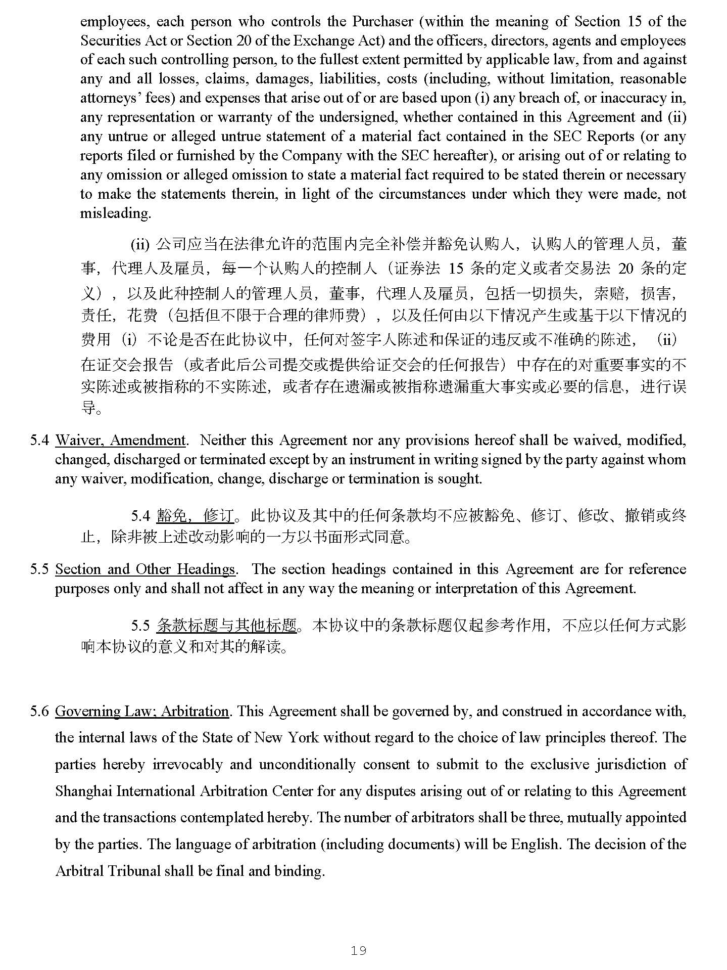 19 4928 - 2523 - 4026, v. 8 ሬ DŽ 5 . 4 Waiver, Amendment . Neither this Agreement nor any provisions hereof shall be waived, modified, changed, discharged or terminated except by an instrument in writing signed by the party against whom any waiver, modification, change, discharge or termination is sought . 5.4 䉱ݽ ˈ ؞䇒 DŽ ↔ॿ䇞৺ަѝⲴԫօᶑⅮ൷нᓄ㻛䉱ݽ ǃ ؞䇒 ǃ ؞᭩ ǃ 䬰ᡆ㓸 → ˈ 䲔䶎㻛к䘠᭩ࣘᖡ૽ⲴаᯩԕҖ䶒ᖒᔿ਼ DŽ 5 . 5 Section and Other Headings . The section headings contained in this Agreement are for reference purposes only and shall not affect in any way the meaning or interpretation of this Agreement . 5.5 ᶑⅮḷ仈оަԆḷ仈 DŽ ᵜॿ䇞ѝⲴᶑⅮḷ仈ӵ䎧৲㘳⭘ ˈ нᓄԕԫօᯩᔿᖡ ૽ᵜॿ䇞Ⲵѹ઼ሩަⲴ䀓䈫 DŽ 5 . 6 Governing Law ; Arbitration . This Agreement shall be governed by, and construed in accordance with, the internal laws of the State of New York without regard to the choice of law principles thereof . The parties hereby irrevocably and unconditionally consent to submit to the exclusive jurisdiction of Shanghai International Arbitration Center for any disputes arising out of or relating to this Agreement and the transactions contemplated hereby . The number of arbitrators shall be three, mutually appointed by the parties . The language of arbitration (including documents) will be English . The decision of the Arbitral Tribunal shall be final and binding . 5 . 6 䘲⭘⌅ᖻ ˗ Ԣ㻱 DŽ ᰐ䇪㓭㓖ᐎ⌅ᖻሩ⌅ᖻ䘹ᤙⲴࡉᴹօ㿴ᇊ ˈ ᵜॿ䇞൷ᓄਇࡠ㖾ഭ 㓭㓖ᐎⲴ䜘⌅ᖻⲴ㇑䗆ᒦṩᦞ䈕⌅ᖻ䘋㹼䀓䟺 DŽ ॿ䇞ৼᯩ൘↔ࠪнਟ䬰фᰐᶑԦⲴ 㓖ᇊ ˖ ਼⭡к⎧ഭ䱵Ԣ㻱ѝᗳ㇑䗆ഐᵜॿ䇞৺ഐ↔ᤏ䘋㹼ⲴӔ᱃ᕅ䎧Ⲵҹ䇞 DŽ Ԣ㻱ઈᮠ 䟿Ѫ 3 ˈ ⭡ৼᯩޡ਼ᤷᇊ DŽ Ԣ㻱䈝䀰 ˄ वᤜ᮷Ԧ ˅ Ѫ㤡䈝 DŽ Ԣ㻱㻱ߣᱟ㓸ተⲴ ˈ ሩৼᯩ ൷ᴹ㓖ᶏ࣋ DŽ 5 . 7 Counterparts . This Agreement may be executed in any number of counterparts, each of which when so executed and delivered shall be deemed to be an original and all of which together shall be deemed to be one and the same agreement . 5.7 ࢟ᵜ DŽ ᵜॿ䇞ਟ਼ᰦㆮ㖢ཊԭ࢟ᵜ ˈ ԫօаԭ࢟ᵜ൘ㆮ㖢઼ӔԈਾᓄ㿶аԭ ↓ᵜ ˈ ᡰᴹ࢟ᵜо↓ᵜޡ਼ᶴᡀ਼аԭ⌅ᖻ᮷Җ DŽ 5 . 8 Notices . All notices and other communications provided for herein shall be in writing and shall be deemed to have been duly given if delivered personally or sent by registered or certified mail, return receipt requested, postage prepaid or if delivered by electronic transmission, on the business day of such delivery if sent by 6 : 00 p . m . in the time zone of the recipient, or if sent after that time, on the next succeeding business day :