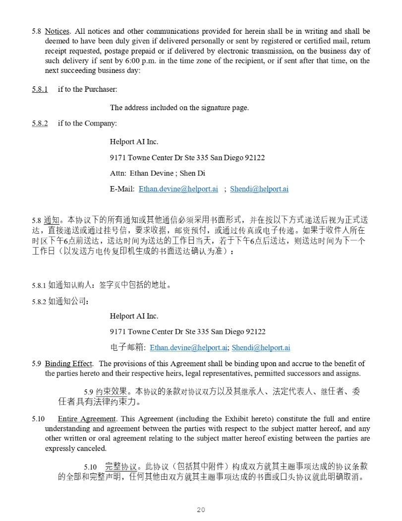 20 4928 - 2523 - 4026, v. 8 1. if to the Purchaser: The address included on the signature page. 2. if to the Company: Helport AI Inc. 9171 Towne Center Dr Ste 335 San Diego 92122 Attn: Ethan Devine ; Shen Di E - Mail: Ethan.devine@helport.ai ; Shendi@helport.ai 8. 䙊⸕ DŽ ᵜॿ䇞лⲴᡰᴹ䙊⸕ᡆަԆ䙊ؑᗵ享䟷⭘Җ䶒ᖒᔿ ˈ ᒦ൘᤹ԕлᯩᔿ䙂䘱ਾ㿶Ѫ↓ᔿ䘱 䗮 ˈ ⴤ᧕䙂䘱ᡆ䙊䗷ᤲਧؑ ˈ 㾱≲᭦ᦞ ˈ 䛞䍴亴Ԉ ˈ ᡆ䙊䗷Րⵏᡆ⭥ᆀՐ䙂 DŽ ྲ᷌Ҿ᭦ԦӪᡰ൘ ᰦ ४лॸ 6 ⛩ࡽ䘱䗮 ˈ 䘱䗮ᰦ䰤Ѫ䘱䗮Ⲵᐕᰕᖃཙ ˈ 㤕Ҿлॸ 6 ⛩ਾ䘱䗮 ˈ ࡉ䘱䗮ᰦ䰤Ѫла њᐕ ᰕ ˄ ԕਁ䘱ᯩ⭥Ր༽ঠᵪ⭏ᡀⲴҖ䶒䘱䗮⺞䇔Ѫ߶ ˅˖ 1. ྲ䙊⸕䇔䍝Ӫ ˖ ㆮᆇ亥ѝवᤜⲴൠ൰ DŽ 2. ྲ䙊⸕ޜਨ ˖ Helport AI Inc. 9171 Towne Center Dr Ste 335 San Diego 92122 ⭥ᆀ䛞㇡ : Ethan.devine@helport.ai ; Shendi@helport.ai 5 . 9 Binding Effect . The provisions of this Agreement shall be binding upon and accrue to the benefit of the parties hereto and their respective heirs, legal representatives, permitted successors and assigns . 9. 㓖ᶏ᭸᷌ DŽ ᵜॿ䇞ⲴᶑⅮሩॿ䇞ৼᯩԕ৺ަ㔗Ӫ ǃ ⌅ᇊԓ㺘Ӫ ǃ 㔗ԫ㘵 ǃ င ԫ㘵ާᴹ⌅ᖻ㓖ᶏ࣋ DŽ 10. Entire Agreement . This Agreement (including the Exhibit hereto) constitute the full and entire understanding and agreement between the parties with respect to the subject matter hereof, and any other written or oral agreement relating to the subject matter hereof existing between the parties are expressly canceled . 10. ᆼᮤॿ䇞 DŽ ↔ॿ䇞 ˄ वᤜަѝ䱴Ԧ ˅ ᶴᡀৼᯩቡަѫ仈һ亩䗮ᡀⲴॿ䇞ᶑⅮⲴ ޘ䜘઼ᆼᮤ༠᰾ ˈ ԫօަԆ⭡ৼᯩቡަѫ仈һ亩䗮ᡀⲴҖ䶒ᡆਓཤॿ䇞ቡ↔᰾⺞ਆ⎸ DŽ 11. Severability . If any term, provision, covenant or restriction of this Agreement is held by a court of competent jurisdiction to be invalid, illegal, void or unenforceable, the remainder of the terms, provisions, covenants and restrictions set forth herein shall remain in full force and effect and shall in no way be affected, impaired or invalidated, and the parties hereto shall use their commercially reasonable efforts to find and employ an alternative means to achieve the same or substantially the same