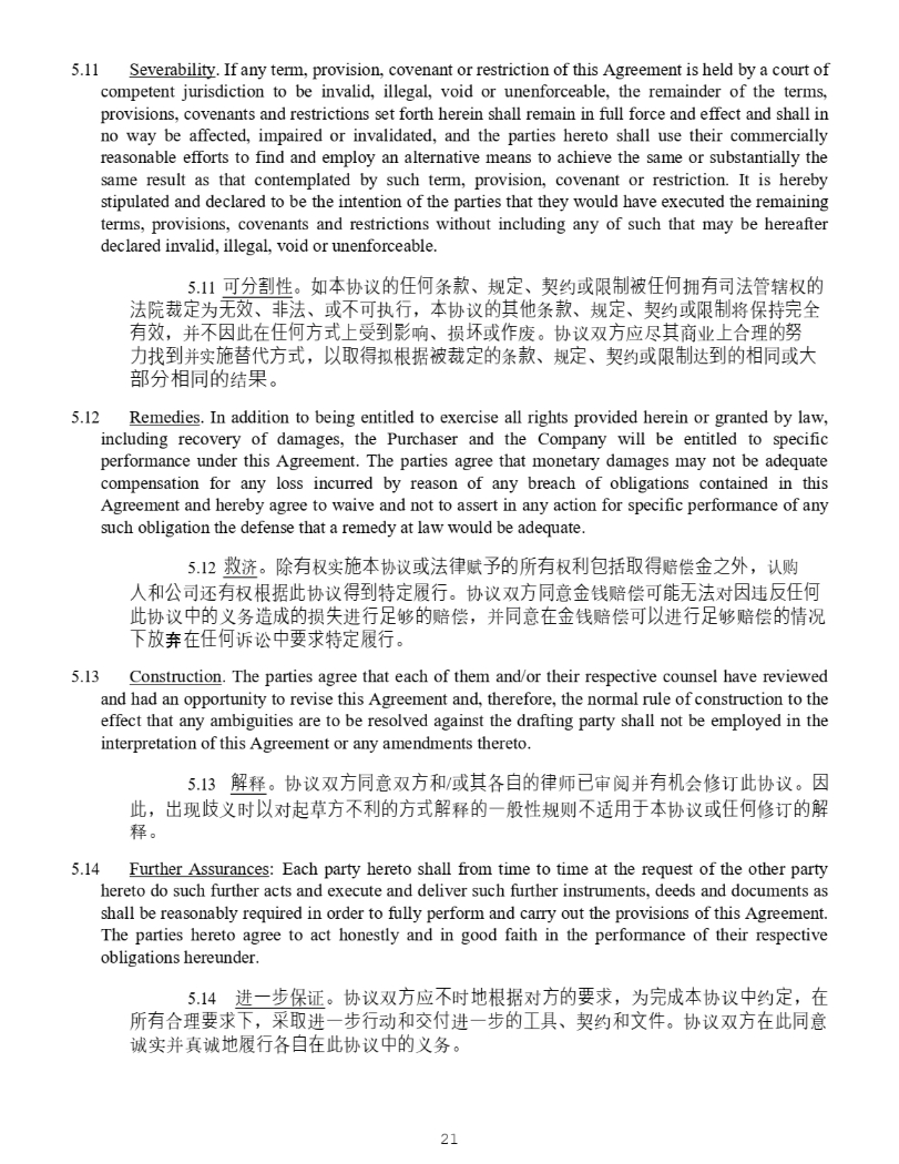 21 5 . 11 Severability . If any term, provision, covenant or restriction of this Agreement is held by a court of competent jurisdiction to be invalid, illegal, void or unenforceable, the remainder of the terms, provisions, covenants and restrictions set forth herein shall remain in full force and effect and shall in no way be affected, impaired or invalidated, and the parties hereto shall use their commercially reasonable efforts to find and employ an alternative means to achieve the same or substantially the same result as that contemplated by such term, provision, covenant or restriction . It is hereby stipulated and declared to be the intention of the parties that they would have executed the remaining terms, provisions, covenants and restrictions without including any of such that may be hereafter declared invalid, illegal, void or unenforceable . 11. ਟ ⇭≙ ᙗ DŽ ྲ 㜓 ॿ䇞 䙫ỢἼ ᶑ 㬥 ǃ 㿴 ⮁ ǃ ཱྀ 㓖 ᡆ䲀 ∝墒ỢἼ ᤕ 㛰 ਨ 㲼 ㇑ 䗆ᵳ 䙫 㲼 䲒 墨⮁ Ѫ 㗇㔯 ǃ 狠㲼 ǃ ᡆ ᷴ ਟ ᢗ 堳 ˈ 㜓 ॿ䇞 䙫⅝ẽ ᶑ 㬥 ǃ 㿴 ⮁ ǃ ཱྀ 㓖 ᡆ䲀 ∝ ሶ ؍ᤱ ⭳ ޘ 㛰㔯 ˈ ᒦ ᷴ⛇㭋✏ỢἼ㖠ᷱ⎾∗⽘ ૽ ǃ ᦏ ✶ ᡆ ὃ ᓏ DŽ ॿ䇞ৼ 㖠 ᓄቭ ⅝ ୶ ъ ᷱ ਸ⨶ 䙫⊑ ⊂ ∗ ᒦᇎ 㖤㛦Ị㖠 ˈ Ọ⎽⽾ ᤏ ṩᦞ 墒墨⮁䙫 ᶑ 㬥 ǃ 㿴 ⮁ ǃ ཱྀ 㓖 ᡆ䲀 ∝ 䗮 ∗䙫䛟 ਼ᡆ ⤎ 惏⇭䛟 ਼ 䙫 㔃 㞃 DŽ 12. Remedies . In addition to being entitled to exercise all rights provided herein or granted by law, including recovery of damages, the Purchaser and the Company will be entitled to specific performance under this Agreement . The parties agree that monetary damages may not be adequate compensation for any loss incurred by reason of any breach of obligations contained in this Agreement and hereby agree to waive and not to assert in any action for specific performance of any such obligation the defense that a remedy at law would be adequate . 13. 㔸 ⍾ DŽ 䲔 㛰 ᵳᇎ 㖤㜓 ॿ䇞 ᡆ 㲼⽲ 䍻 ṯ䙫 ᡰ 㛰 ᵳ ∐⋬ ᤜ ⎽⽾ 䎄گ 憸Ḳ⣽ ˈ 䇔䍝 ạ ઼ ⅓ ਨ 䘈 㛰 ᵳ ṩᦞ 㭋 ॿ䇞 ⽾∗ ⢩ ⮁ ን 堳 DŽ ॿ䇞ৼ 㖠 ਼ 憸 䫡䎄گ ਟ 僤㗇㲼 ሩ ⛇ 䘍 ⎴ỢἼ 㭋 ॿ䇞 Ḕ䙫 ѹ࣑ 䙐ᡀ 䙫 ᦏ ⤘ 䘋 堳嶚 ཏ 䙫 䎄گ ˈ ᒦ ਼ ✏憸 䫡䎄گ ਟ Ọ 䘋 堳嶚 ཏ䎄گ 䙫 ᛵ ߥ ᷲ㔥 ᘜ ✏ỢἼ 䇹䇬 Ḕ奨㰩 ⢩ ⮁ ን 堳 DŽ 13. Construction . The parties agree that each of them and/or their respective counsel have reviewed and had an opportunity to revise this Agreement and, therefore, the normal rule of construction to the effect that any ambiguities are to be resolved against the drafting party shall not be employed in the interpretation of this Agreement or any amendments thereto . 14. 姊 䟺 DŽ ॿ䇞ৼ 㖠 ਼ ৼ 㖠 ઼ / ᡆ ⅝ 凑䙫⽲ ᐸ ⷙ ᇑ䰵ᒦ 㛰㜡 Պ ؞ 䇒 㭋 ॿ䇞 DŽ ⛇ 㭋 ˈ ⇡ ⧠ 㭎 ѹᰦ Ọ ሩ 䎧㥹 㖠ᷴ∐䙫㖠姊 䟺 䙫ᷧ 㡜ᙗ 㿴ࡉ ᷴ 䘲 䔏ṵ㜓 ॿ䇞 ᡆ ỢἼ ؞ 䇒 䙫姊 䟺 DŽ 15. Further Assurances : Each party hereto shall from time to time at the request of the other party hereto do such further acts and execute and deliver such further instruments, deeds and documents as shall be reasonably required in order to fully perform and carry out the provisions of this Agreement . The parties hereto agree to act honestly and in good faith in the performance of their respective obligations hereunder . 5 . 14 䘋 ᷧ㭌 ؍ 䇱 DŽ ॿ䇞ৼ 㖠 ᓄ ᷴ ᰦ ✗ ṩᦞ ሩ 㖠䙫奨㰩 ˈ Ѫ ⭳ ᡀ 㜓 ॿ䇞 Ḕ 㓖 ⮁ ˈ ✏ ᡰ 㛰 ਸ⨶ 奨㰩ᷲ ˈ 憮⎽ 䘋 ᷧ㭌堳 ࣘ ઼ ẋế 䘋 ᷧ㭌䙫ⷌ ާ ǃ ཱྀ 㓖 ઼ 狄ờ DŽ ॿ䇞ৼ 㖠✏㭋 ਼ 䈊ᇎᒦⵏ䈊 ✗ ን 堳 凑✏㭋 ॿ䇞 Ḕ䙫 ѹ࣑ DŽ