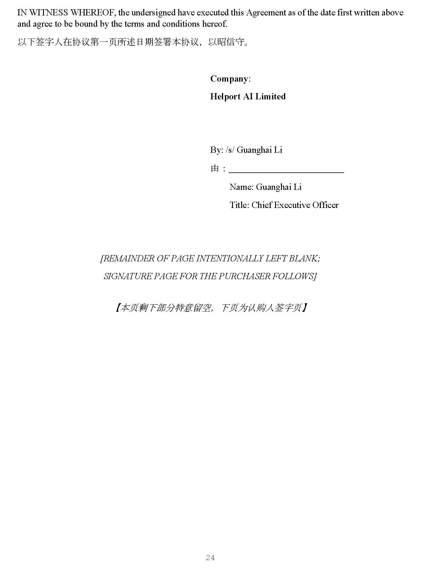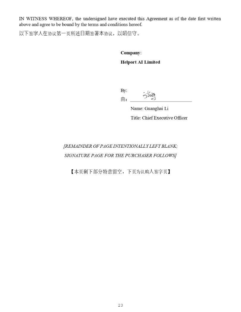 IN WITNESS WHEREOF, the undersigned have executed this Agreement as of the date first written above and agree to be bound by the terms and conditions hereof. Ọᷲ ㆮ ⬾ạ✏ ॿ䇞 ㅜ ᷧ 亥 ᡰ䘠 㗌㜆 ㆮ 㖢 㜓 ॿ䇞 ˈ Ọ㘔 ؑ ⭯ DŽ Company : Helport AI Limited 23 By: 䔘 ˖ Name: Guanghai Li Title: Chief Executive Officer [REMAINDER OF PAGE INTENTIONALLY LEFT BLANK; SIGNATURE PAGE FOR THE PURCHASER FOLLOWS] Ǐ ᵜ 亥 ࢙л䜘࠶⢩⮉オ ˈ л 亥Ѫ䇔䍝 ạ ㆮ ᆇ 亥 ǐ