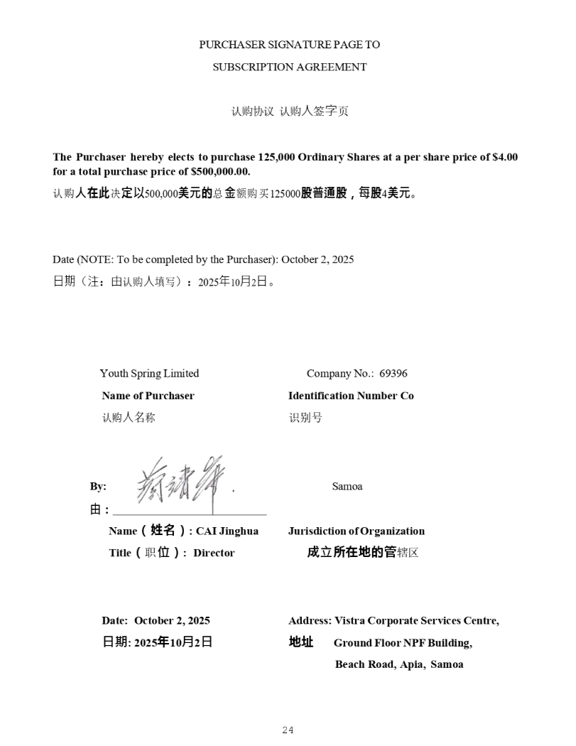 PURCHASER SIGNATURE PAGE TO SUBSCRIPTION AGREEMENT 䇔䍝ॿ䇞 䇔䍝 ạ ㆮ ⬾ 亥 The Purchaser hereby elects to purchase 125,000 Ordinary Shares at a per share price of $4.00 for a total purchase price of $500,000.00. 䇔䍝 ᵸ 㘪㸞 ߣ 㟍 ᶣ 500,000 䖤 䉵 ᙫ 悏 仍䍝Ҡ 125000 䘎 㔬 䬠䘎 メ 㪍 䘎 4 䖤 ೲ 24 Date (NOTE: To be completed by the Purchaser): October 2, 2025 㗌㜆 ˄ 㳏 ˖ 䔘 䇔䍝 ạ ປ߉ ˅˖ 2025 ⹛ 10 㛯 2 㗌 DŽ Youth Spring Limited Name of Purchaser 䇔䍝 ạ 〠 Company No.: 69396 Identification Number Co 䇶࡛ਧ By: 䏯 ワ Name ポ 㜨㔠 マ : CAI Jinghua Title ポ 㙼 ḋ マ : Director Samoa Jurisdiction of Organization 㩽 燌 㪖㘪㘮䉵䑋 䗆४ Date: October 2, 2025 㒣㗝 : 2025 㣞 10 㗆 2 㒣 Address: Vistra Corporate Services Centre, 㘮 㘱 Ground Floor NPF Building, Beach Road, Apia, Samoa
