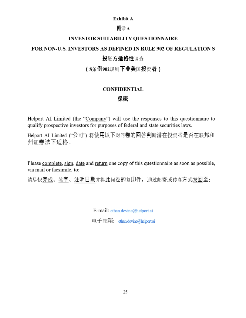 25 Exhibit A 䳋 ᖅ A INVESTOR SUITABILITY QUESTIONNAIRE FOR NON - U.S. INVESTORS AS DEFINED IN RULE 902 OF REGULATION S 㪺 䍴 㑷 䬐㴋㦣 䈳ḕ ポ S ᶑ ṉ 902 㿴ࡉ ㉸ 燝 䖤 ഭ 㪺 䍴 䗕 マ CONFIDENTIAL ㍃㟤 Helport AI Limited (the “ Company ”) will use the responses to this questionnaire to qualify prospective investors for purposes of federal and state securities laws. Helport AI Limited (“ ⅓ ਨ ”) ሶ ὦ䔏Ọᷲ ሩ䰞 ⍞䙫⛅ ㆄ ∋ ᯝ ▌ ✏ ᣅ 䍴 俬㘖 ✏ 㚄 䛖઼ ⷅ 䇱 ∟㲼ᷲ 䘲Ṭ DŽ Please complete , sign , date and return one copy of this questionnaire as soon as possible, via mail or facsimile, to: 䈧ቭ ᘛ ⭳ ᡀ ǃ ㆮ ⬾ ǃ 㳏㗵㗌㜆 ᒦሶ 㭋 䰞 ⍞䙫 ༽ ⍗ờ ˈ 䙊 䗷䛞 ᇴᡆ Րⵏ 㖠 ਁ ⛅ 凚 ˖ E - mail: ethan.devine@helport.ai ⭥ ⬷ 䛞 ㇡ : ethan.devine@helport.ai