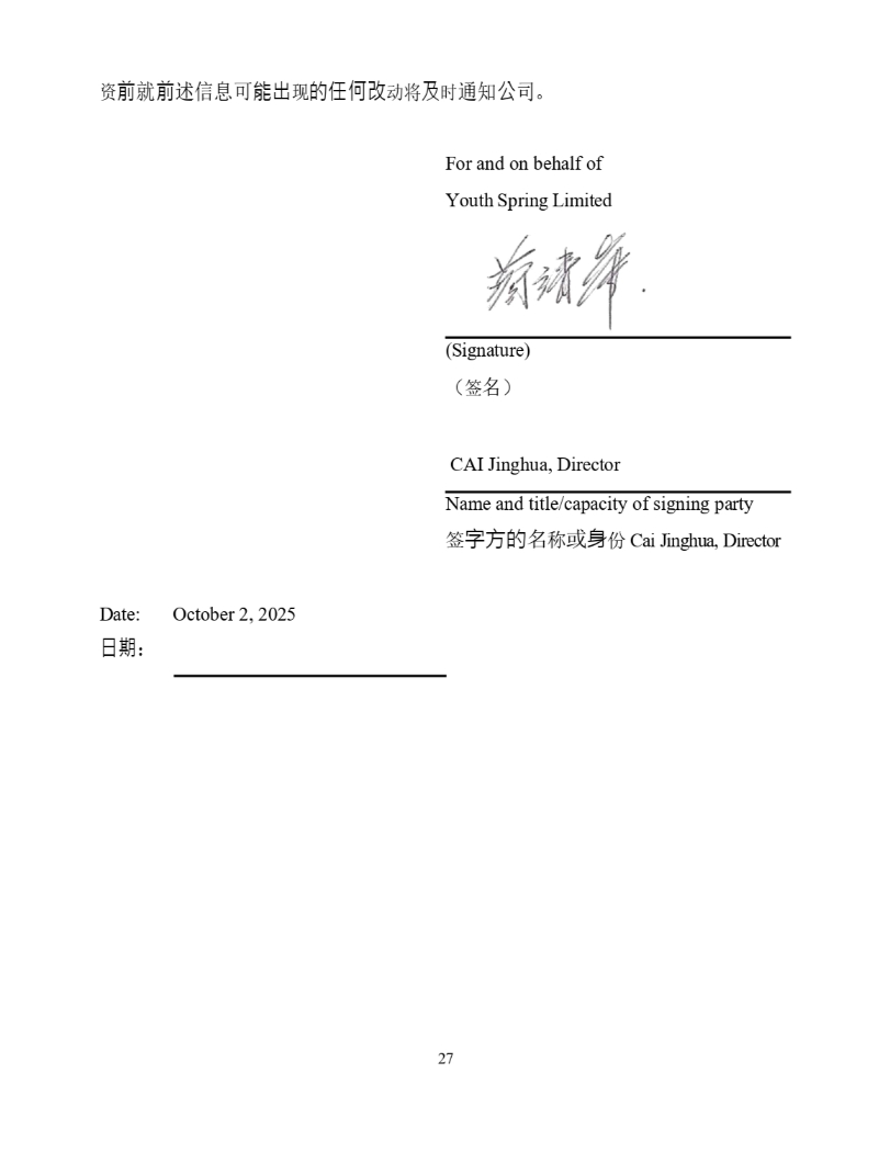 䍴 ∴ ቡ ∴ 䘠ؑਟ 僤⇡ ⧠ 䙫ỢἼ㔠 ࣘሶ ⎱ ᰦ 䙊⸕ ⅓ ਨ DŽ For and on behalf of Youth Spring Limited (Signature) ˄ ㆮ ˅ CAI Jinghua, Director Name and title/capacity of signing party ㆮ ⬾㖠䙫 〠 ᡆ 庒 ԭ Cai Jinghua , Director Date: October 2, 2025 㗌㜆 ˖ 27