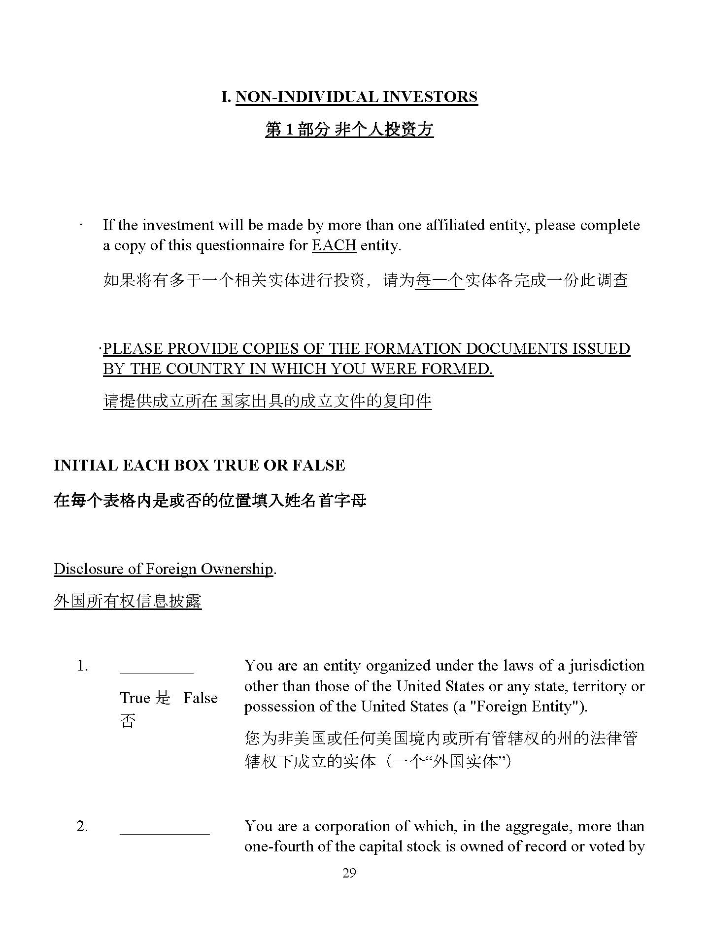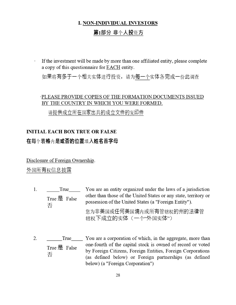 28 I. NON - INDIVIDUAL INVESTORS 䐝 1 徦 燝 њ ᵸ 㪺 䍴 㑷 · If the investment will be made by more than one affiliated entity, please complete a copy of this questionnaire for EACH entity. ྲ 㞃 ሶ 㛰⤁ṵᷧ њ 䛟 ޣᇎ Ἲ 䘋 堳 ᣅ 䍴 ˈ 䈧Ѫ 㮶ᷧ њ ᇎ Ἲ ⭳ ᡀ ᷧ ԭ 㭋 䈳ḕ · PLEASE PROVIDE COPIES OF THE FORMATION DOCUMENTS ISSUED BY THE COUNTRY IN WHICH YOU WERE FORMED. 䈧 ᨀ ᾂ ᡀ 狏 ᡰ ✏ ഭ ⮝⇡ ާ 䙫 ᡀ 狏狄ờ䙫 ༽ ⍗ờ INITIAL EACH BOX TRUE OR FALSE 㘪 㪍 њ 圦 㴋 㓭 㪂㔩䉵 ḋ 䖓 ປ 熹 㜨㔠 桔 㞨 㪋 Disclosure of Foreign Ownership . ⣽ ഭ ᡰ 㛰 ᵳ ؑᣛ 朙 1. True True 㘖 False You are an entity organized under the laws of a jurisdiction other than those of the United States or any state, territory or possession of the United States (a "Foreign Entity") . ᛘѪ 狠併 ഭ ᡆ ỢἼ併 ഭ ⡪ ᡆᡰ 㛰 ㇑ 䗆ᵳ 䙫ⷅ䙫㲼⽲ ㇑ 䗆ᵳ ᷲ ᡀ 狏䙫 ᇎ Ἲ ˄ ᷧ њ “ ⣽ ഭᇎ Ἲ ” ˅ True 㘖 False 2. True You are a corporation of which, in the aggregate, more than one - fourth of the capital stock is owned of record or voted by Foreign Citizens, Foreign Entities, Foreign Corporations (as defined below) or Foreign partnerships (as defined below) (a "Foreign Corporation")