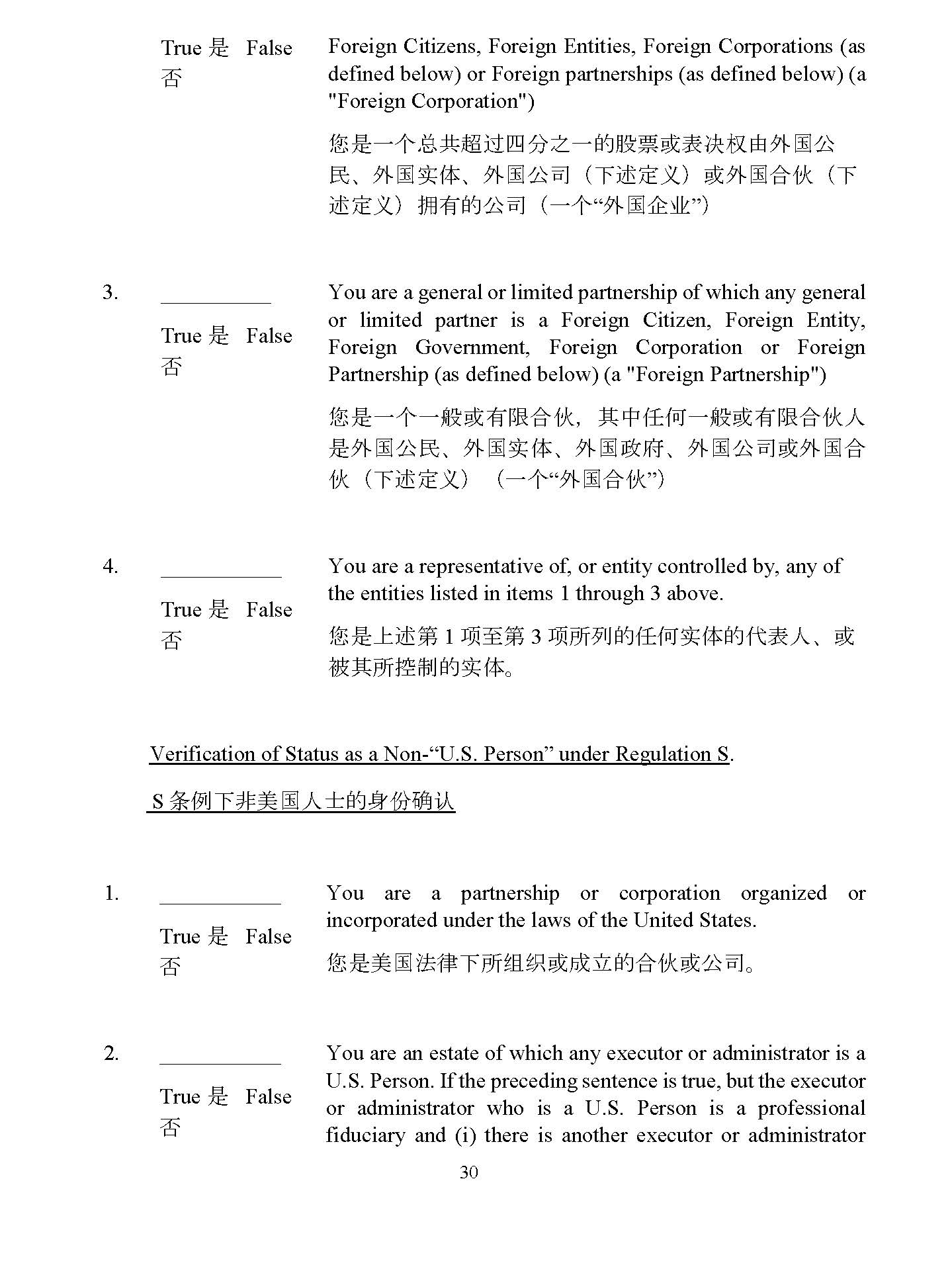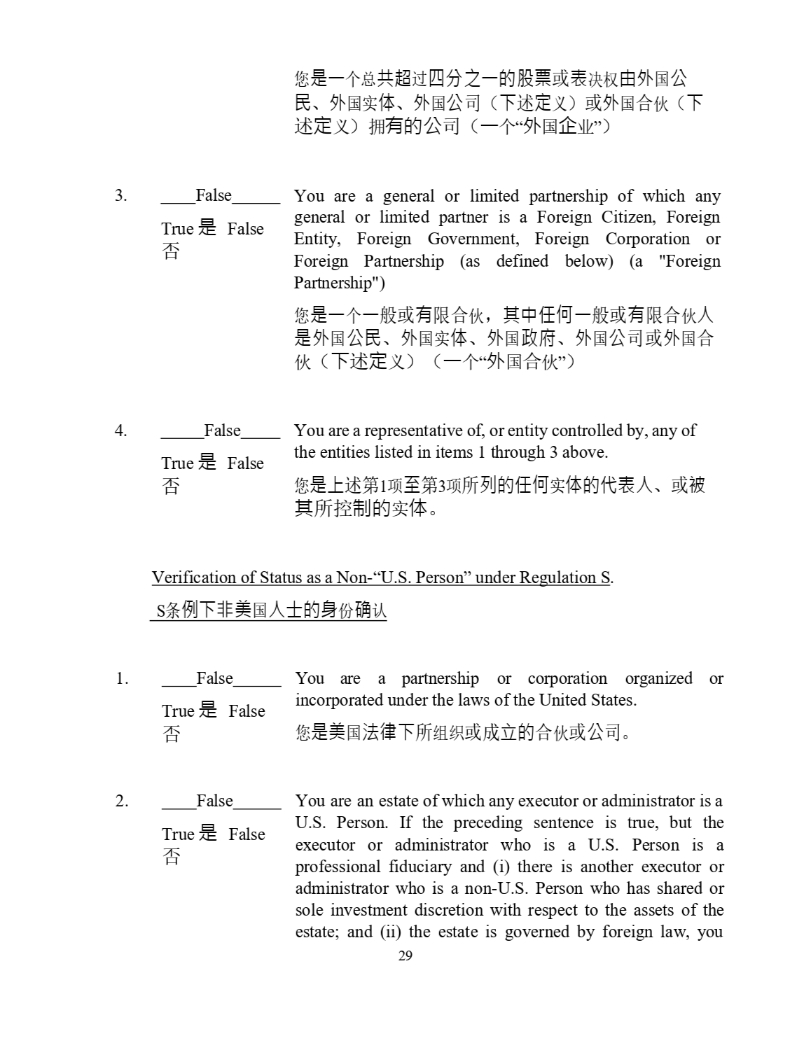 4928 - 2523 - 4026, v. 8 30 defined below) or Foreign partnerships (as defined below) (a "Foreign Corporation") ᛘᱟањᙫޡ䎵䗷ഋ࠶ѻаⲴ㛑⾘ᡆ㺘ߣᵳ⭡ཆഭޜ ≁ ǃ ཆഭᇎփ ǃ ཆഭޜਨ ˄ л䘠ᇊѹ ˅ ᡆཆഭਸՉ ˄ л 䘠ᇊѹ ˅ ᤕᴹⲴޜਨ ˄ ањ “ ཆഭԱъ ” ˅ 3. True ᱟ False You are a general or limited partnership of which any general or limited partner is a Foreign Citizen, Foreign Entity, Foreign Government, Foreign Corporation or Foreign Partnership (as defined below) (a "Foreign Partnership") ᛘᱟања㡜ᡆᴹ䲀ਸՉ ˈ ަѝԫօа㡜ᡆᴹ䲀ਸՉӪ ᱟཆഭޜ≁ ǃ ཆഭᇎփ ǃ ཆഭ᭯ᓌ ǃ ཆഭޜਨᡆཆഭਸ Չ ˄ л䘠ᇊѹ ˅ ˄ ањ “ ཆഭਸՉ ” ˅ 4. True ᱟ False You are a representative of, or entity controlled by, any of the entities listed in items 1 through 3 above. ᛘᱟк䘠ㅜ 1 亩㠣ㅜ 3 亩ᡰࡇⲴԫօᇎփⲴԓ㺘Ӫ ǃ ᡆ 㻛ަᡰ᧗ࡦⲴᇎփ DŽ Verification of Status as a Non - “U.S. Person” under Regulation S . S ᶑֻл䶎㖾ഭӪ༛Ⲵ䓛ԭ⺞䇔 1. True ᱟ False You are a partnership or corporation organized or incorporated under the laws of the United States. ᛘᱟ㖾ഭ⌅ᖻлᡰ㓴㓷ᡆᡀ・ⲴਸՉᡆޜਨ DŽ 2. True ᱟ False You are an estate of which any executor or administrator is a U . S . Person . If the preceding sentence is true, but the executor or administrator who is a U . S . Person is a professional fiduciary and (i) there is another executor or administrator who is a non - U . S . Person who has shared or sole investment