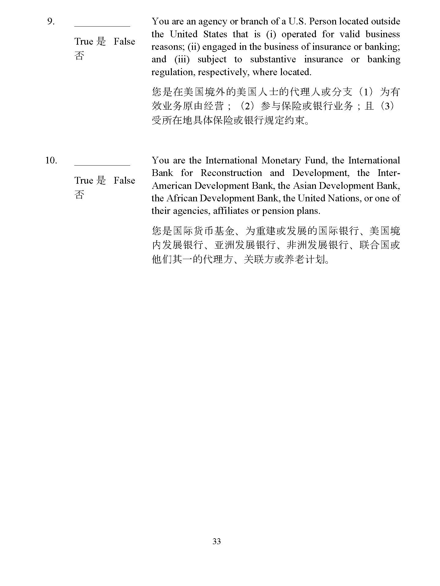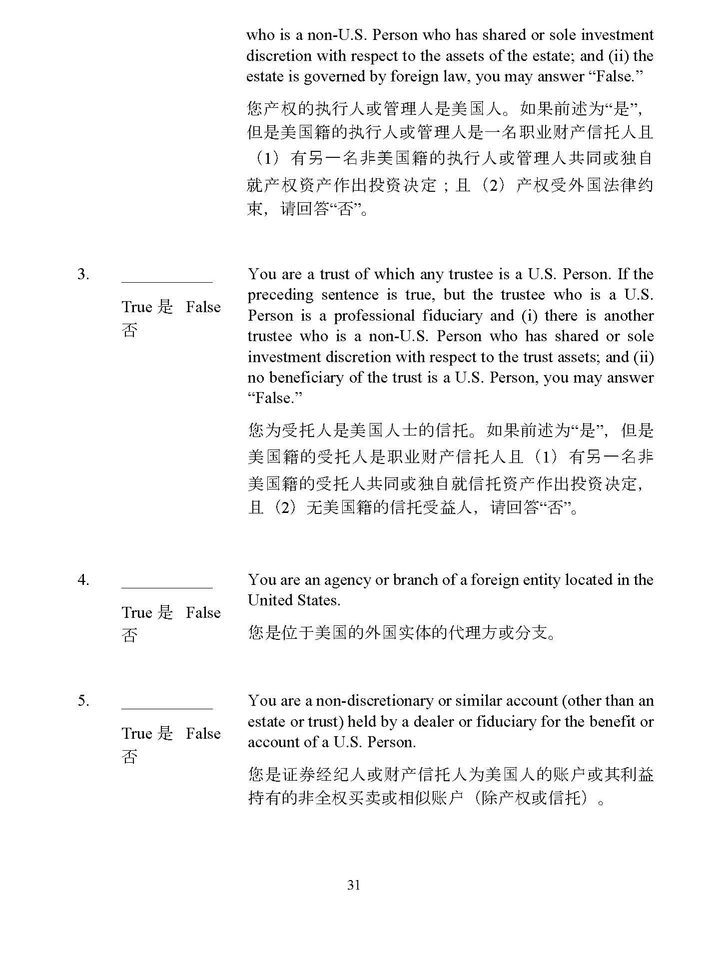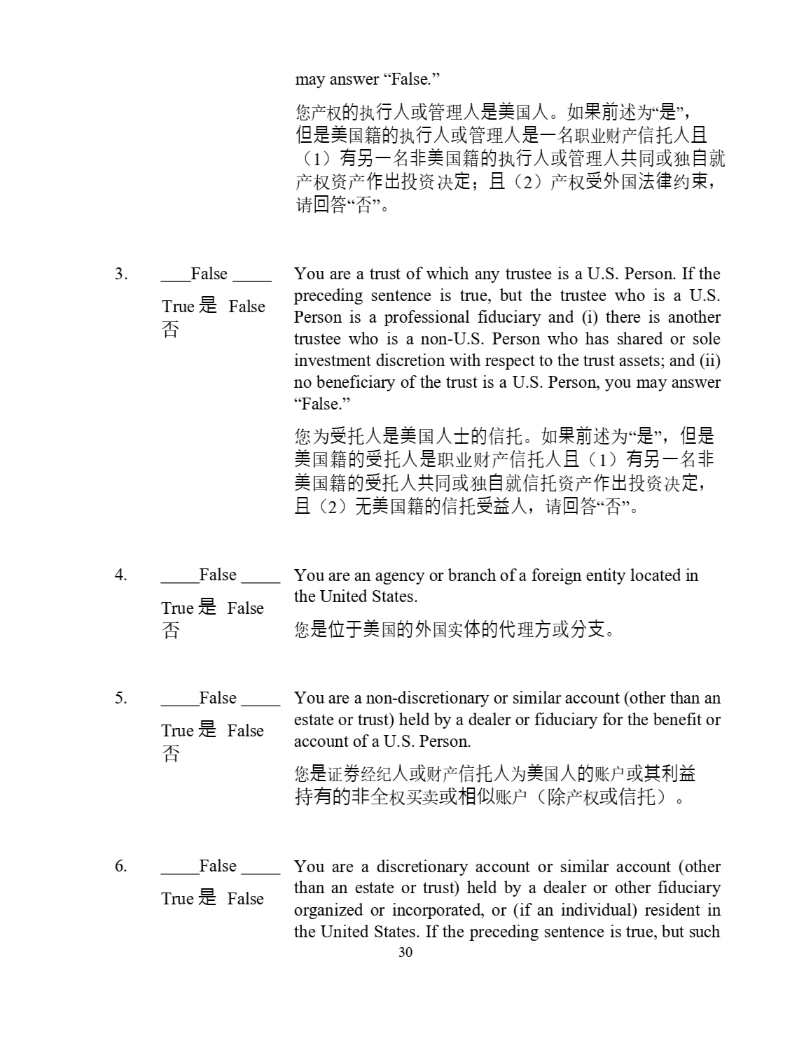 the United States. If the preceding sentence is true, but such 30 may answer “False.” ᛘӗᵳ 䙫 ᢗ 堳ạ ᡆ㇑⨶ ạ㘖併 ഭ ạ DŽ ྲ 㞃∴ 䘠 Ѫ “ 㘖 ” ˈ Ἥ㘖併 ഭ ㉽ 䙫 ᢗ 堳ạ ᡆ㇑⨶ ạ㘖ᷧ 㙼ъ䍒ӗ ؑᢈ ạ᷻ ˄ 1 ˅ 㛰⏍ᷧ 狠併 ഭ ㉽ 䙫 ᢗ 堳ạ ᡆ㇑⨶ ạ⅘ ਼ᡆ ⤜ 凑 ቡ ӗᵳ䍴ӗ ὃ⇡ ᣅ 䍴ߣ ⮁ ˗ ᷻ ˄ 2 ˅ ӗᵳ ⎾⣽ ഭ 㲼⽲ 㓖 㝆 ˈ 䈧 ⛅ ㆄ “ ” DŽ 3. False True 㘖 False You are a trust of which any trustee is a U . S . Person . If the preceding sentence is true, but the trustee who is a U . S . Person is a professional fiduciary and (i) there is another trustee who is a non - U . S . Person who has shared or sole investment discretion with respect to the trust assets ; and (ii) no beneficiary of the trust is a U . S . Person, you may answer “False . ” ᛘѪ ⎾ ᢈ ạ㘖併 ഭ ạ⣒䙫 ؑᢈ DŽ ྲ 㞃∴ 䘠 Ѫ “ 㘖 ” ˈ Ἥ㘖 併 ഭ ㉽ 䙫⎾ ᢈ ạ㘖 㙼ъ䍒ӗ ؑᢈ ạ᷻ ˄ 1 ˅ 㛰⏍ᷧ 狠 併 ഭ ㉽ 䙫⎾ ᢈ ạ⅘ ਼ᡆ ⤜ 凑 ቡؑᢈ 䍴ӗ ὃ⇡ ᣅ 䍴ߣ ⮁ ˈ ᷻ ˄ 2 ˅ 㗇併 ഭ ㉽ 䙫 ؑᢈ ⎾䚱ạ ˈ 䈧 ⛅ ㆄ “ ” DŽ 4. False You are an agency or branch of a foreign entity located in True 㘖 False the United States. ᛘ 㘖ἴṵ併 ഭ 䙫⣽ ഭᇎ Ἲ䙫Ị ⨶ 㖠 ᡆ ⇭㔖 DŽ True 㘖 False 5. False You are a non - discretionary or similar account (other than an estate or trust) held by a dealer or fiduciary for the benefit or account of a U.S. Person. ᛘ 㘖 䇱 ∟ 㓿㓚 ạ ᡆ 䍒ӗ ؑᢈ ạ Ѫ 併 ഭ ạ䙫 䍖ᡧ ᡆ ⅝∐䚱 ᤱ 㛰䙫狠 ޘ ᵳҠআ ᡆ 䛟ἣ 䍖ᡧ ˄ 䲔 ӗᵳ ᡆؑᢈ ˅ DŽ True 㘖 False 6. False You are a discretionary account or similar account (other than an estate or trust) held by a dealer or other fiduciary organized or incorporated, or (if an individual) resident in