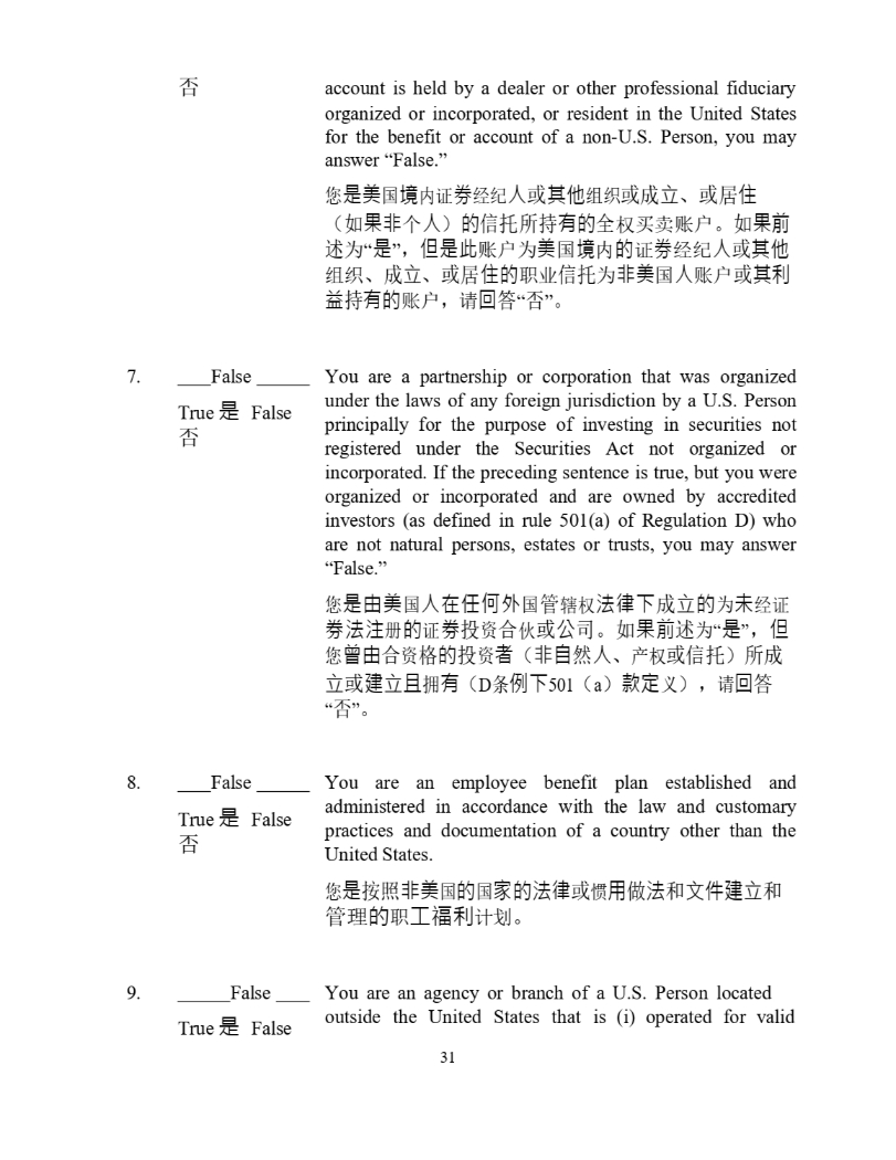 outside the United States that is (i) operated for valid True 㘖 False 31 account is held by a dealer or other professional fiduciary organized or incorporated, or resident in the United States for the benefit or account of a non - U . S . Person, you may answer “False . ” ᛘ 㘖併 ഭ ⡪ 䇱 ∟ 㓿㓚 ạ ᡆ ⅝ẽ 㓴㓷 ᡆᡀ 狏 ǃ ᡆት ἶ ˄ ྲ 㞃狠 њ ạ ˅ 䙫 ؑᢈᡰᤱ 㛰䙫 ޘ ᵳҠআ䍖ᡧ DŽ ྲ 㞃∴ 䘠 Ѫ “ 㘖 ” ˈ Ἥ㘖㭋 䍖ᡧѪ 併 ഭ ⡪ 䙫 䇱 ∟ 㓿㓚 ạ ᡆ ⅝ẽ 㓴㓷 ǃ ᡀ 狏 ǃ ᡆት ἶ䙫 㙼ъ ؑᢈ Ѫ 狠併 ഭ ạ 䍖ᡧ ᡆ ⅝∐ 䚱 ᤱ 㛰䙫 䍖ᡧ ˈ 䈧 ⛅ ㆄ “ ” DŽ True 㘖 False 7. False You are a partnership or corporation that was organized under the laws of any foreign jurisdiction by a U.S. Person principally for the purpose of investing in securities not registered under the Securities Act not organized or incorporated . If the preceding sentence is true, but you were organized or incorporated and are owned by accredited investors (as defined in rule 501 (a) of Regulation D) who are not natural persons, estates or trusts, you may answer “False . ” ᛘ 㘖䔘併 ഭ ạ✏ỢἼ⣽ ഭ ㇑ 䗆ᵳ 㲼⽲ᷲ ᡀ 狏䙫 Ѫ 㜑 㓿䇱 ∟㲼㳏 䙫 䇱 ∟ ᣅ 䍴 ਸ Չ ᡆ ⅓ ਨ DŽ ྲ 㞃∴ 䘠 Ѫ “ 㘖 ” ˈ Ἥ ᛘ 㛥䔘 ਸ 䍴 Ṭ 䙫 ᣅ 䍴 俬 ˄ 狠凑 ❦ ạ ǃ ӗᵳ ᡆؑᢈ ˅ ᡰᡀ 狏 ᡆ ⻡狏᷻ ᤕ 㛰 ˄ D ᶑ ὲᷲ 501 ˄ a ˅ 㬥⮁ ѹ ˅ˈ 䈧 ⛅ ㆄ “ ” DŽ True 㘖 False 8. False You are an employee benefit plan established and administered in accordance with the law and customary practices and documentation of a country other than the United States. ᛘ 㘖 ᤹➗ 狠併 ഭ 䙫 ഭ ⮝䙫㲼⽲ ᡆ ᜟ 䔏 ڊ 㲼 ઼ 狄ờ⻡狏 ઼ ㇑⨶ 䙫 㙼 ⷌ䥶∐ 䇑ࡂ DŽ 9. False You are an agency or branch of a U.S. Person located