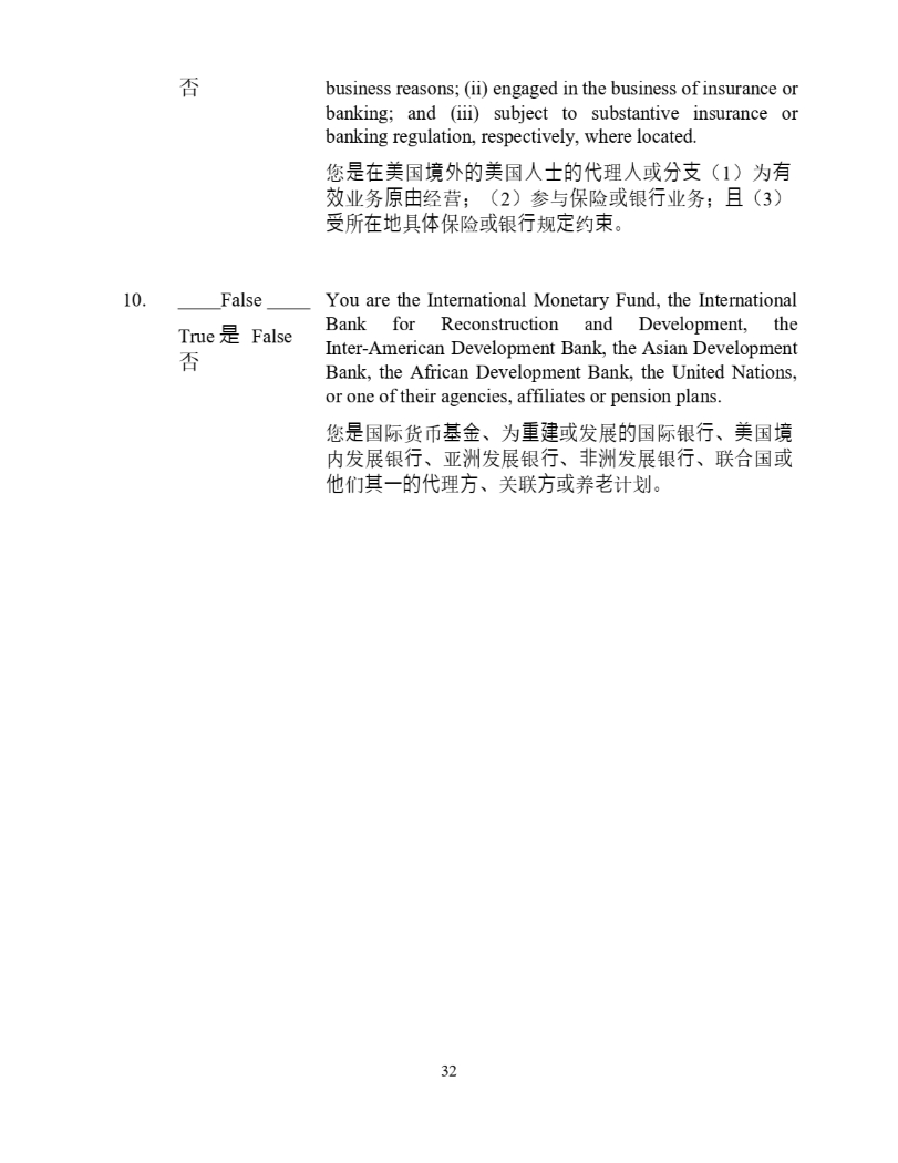 32 business reasons ; (ii) engaged in the business of insurance or banking ; and (iii) subject to substantive insurance or banking regulation, respectively, where located . ᛘ 㘖✏併 ഭ ⡪⣽䙫併 ഭ ạ⣒䙫Ị ⨶ ạ ᡆ ⇭㔖 ˄ 1 ˅ Ѫ 㛰 㔯 ъ࣑ ⎆䔘 㓿㩕 ˗ ˄ 2 ˅ ৲о ؍ 䲙 ᡆ 䬦 堳 ъ࣑ ˗ ᷻ ˄ 3 ˅ ⎾ ᡰ ✏✗ ާ Ἲ ؍ 䲙 ᡆ 䬦 堳 㿴 ⮁ 㓖 㝆 DŽ 10. False You are the International Monetary Fund, the International True 㘖 False Bank for Reconstruction and Development, the Inter - American Development Bank, the Asian Development Bank, the African Development Bank, the United Nations, or one of their agencies, affiliates or pension plans . ᛘ 㘖 ഭ䱵䍗ᐱ ⟡憸 ǃ Ѫ 憴⻡ ᡆ ਁ ኅ 䙫 ഭ䱵䬦 堳 ǃ 併 ഭ ⡪ ਁ ኅ 䬦 堳 ǃ ӊ ⍢ ਁ ኅ 䬦 堳 ǃ 狠 ⍢ ਁ ኅ 䬦 堳 ǃ 㚄 ਸ ഭ ᡆ ẽ Ԝ ⅝ᷧ䙫Ị ⨶ 㖠 ǃ ޣ㚄 㖠 ᡆ ޫ 狑 䇑ࡂ DŽ