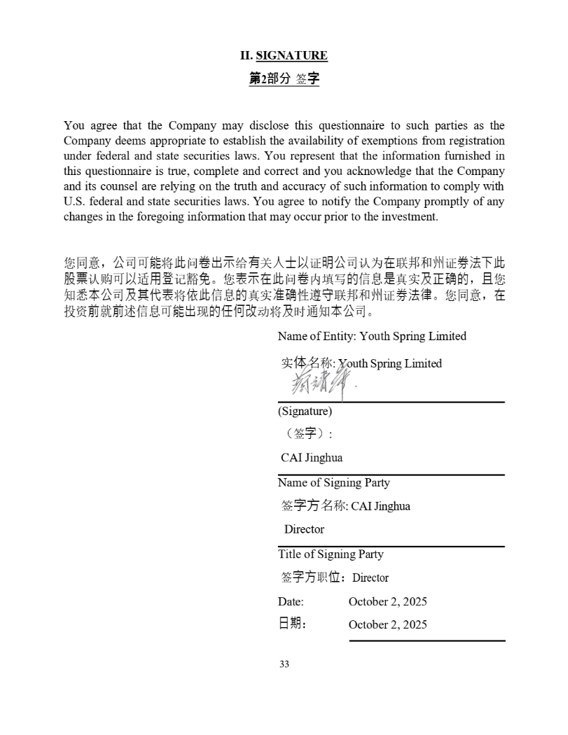 II. SIGNATURE 䐝 2 徦 ㆮ 㞨 You agree that the Company may disclose this questionnaire to such parties as the Company deems appropriate to establish the availability of exemptions from registration under federal and state securities laws . You represent that the information furnished in this questionnaire is true, complete and correct and you acknowledge that the Company and its counsel are relying on the truth and accuracy of such information to comply with U . S . federal and state securities laws . You agree to notify the Company promptly of any changes in the foregoing information that may occur prior to the investment . ᛘ ਼ ˈ ⅓ ਨਟ 僤 ሶ 㭋 䰞 ⍞⇡䤡 㔉 㛰 ޣ ạ⣒Ọ 䇱 㗵⅓ ਨ 䇔Ѫ ✏ 㚄 䛖઼ ⷅ 䇱 ∟㲼ᷲ㭋 傈䥏 䇔䍝 ਟ Ọ 䘲 䔏䙢 䇠 䉱 ℴ DŽ ᛘ 塏䤡✏㭋 䰞 ⍞ ປ߉ 䙫 ؑ 㘖 ⵏᇎ ⎱㭊䡕䙫 ˈ ᷻ ᛘ ⸕ᚹ 㜓⅓ ਨ ⎱⅝Ị塏 ሶ ᾄ㭋 ؑ 䙫 ⵏᇎ ↭䡕 ᙗ䚥 ⭯ 㚄 䛖઼ ⷅ 䇱 ∟㲼⽲ DŽ ᛘ ਼ ˈ ✏ ᣅ 䍴 ∴ ቡ ∴ 䘠ؑਟ 僤⇡ ⧠ 䙫ỢἼ㔠 ࣘሶ ⎱ ᰦ 䙊⸕ 㜓⅓ ਨ DŽ Name of Entity: Youth Spring Limited ᇎ Ἲ 〠 : Youth Spring Limited (Signature) ˄ ㆮ ⬾ ˅ : CAI Jinghua Name of Signing Party ㆮ ⬾㖠 〠 : CAI Jinghua Director Title of Signing Party ㆮ ⬾㖠 㙼 ἴ ˖ Director Date: 㗌㜆 ˖ October 2, 2025 October 2, 2025 33