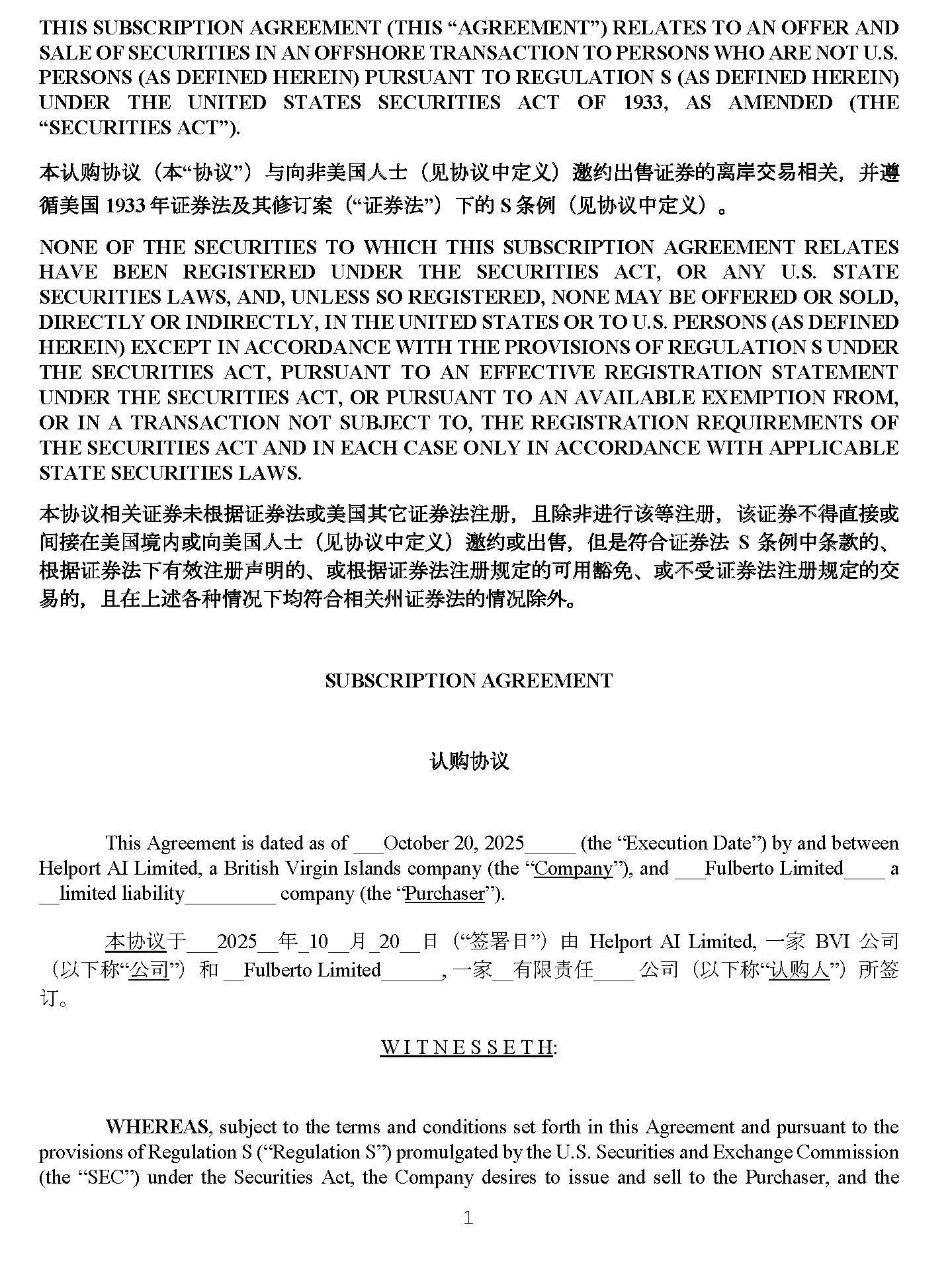 THIS SUBSCRIPTION AGREEMENT (THIS “AGREEMENT”) RELATES TO AN OFFER AND SALE OF SECURITIES IN AN OFFSHORE TRANSACTION TO PERSONS WHO ARE NOT U . S . PERSONS (AS DEFINED HEREIN) PURSUANT TO REGULATION S (AS DEFINED HEREIN) UNDER THE UNITED STATES SECURITIES ACT OF 1933 , AS AMENDED (THE “SECURITIES ACT”) . 㲡 䇔䍝ॿ䇞 ポ 㲡 “ ॿ䇞 ” マ о 㔤䵌䖤 ഭ ㋀㛎 ポ 㿱ॿ䇞 ㊄㟍 ѹ マ 䭘 㓖 㐶㖅 䇱 㑒䉵䎌㡏㊴㰒䊤 ޣ メ ᒦ 䭐 㥭䖤 ഭ 1933 㣞 䇱 㑒㺱㓺㐂㍈ 䇒 㴓 ポ “ 䇱 㑒㺱 ” マ ㉸䉵 S ᶑ ㌞ ポ 㿱ॿ䇞 ㊄㟍 ѹ マ ೲ NONE OF THE SECURITIES TO WHICH THIS SUBSCRIPTION AGREEMENT RELATES HAVE BEEN REGISTERED UNDER THE SECURITIES ACT, OR ANY U . S . STATE SECURITIES LAWS, AND, UNLESS SO REGISTERED, NONE MAY BE OFFERED OR SOLD, DIRECTLY OR INDIRECTLY, IN THE UNITED STATES OR TO U . S . PERSONS (AS DEFINED HEREIN) EXCEPT IN ACCORDANCE WITH THE PROVISIONS OF REGULATION S UNDER THE SECURITIES ACT, PURSUANT TO AN EFFECTIVE REGISTRATION STATEMENT UNDER THE SECURITIES ACT, OR PURSUANT TO AN AVAILABLE EXEMPTION FROM, OR IN A TRANSACTION NOT SUBJECT TO, THE REGISTRATION REQUIREMENTS OF THE SECURITIES ACT AND IN EACH CASE ONLY IN ACCORDANCE WITH APPLICABLE STATE SECURITIES LAWS . 㲡 ॿ䇞 䊤 ޣ䇱 㑒㲟㴉㬋 䇱 㑒㺱㪂䖤 ഭ 㐂 ᆳ䇱 㑒㺱㺽 メ ㉻䳙䵌 䘋 䢠 䈕 䐦㺽 メ 䈕䇱 㑒㉹㥢䊣㬦㪂 䰤 㬦㘪䖤 ഭ 㚦 㪂㔤䖤 ഭ ㋀㛎 ポ 㿱ॿ䇞 ㊄㟍 ѹ マ 䭘 㓖 㪂㐶㖅 メ ㋳㰠䐚㔛 䇱 㑒㺱 S ᶑ ㌞㊄ ᶑ 㸌䉵 ೱ 㴉㬋 䇱 㑒㺱㉸㲐㮷㺽 ༠ 㰎䉵 ೱ 㪂㴉㬋 䇱 㑒㺱㺽 㿴 㟍䉵㔏䇟䧢㏯ ೱ 㪂㉹㓿 䇱 㑒㺱㺽 㿴 㟍䉵㊴ 㰒䉵 メ ㉻㘪㉷䬆㔚 㧨 ߥ ㉸㘳䐚㔛䊤 ޣ 㢟 䇱 㑒㺱䉵㧨 ߥ 䳙㛛 ೲ SUBSCRIPTION AGREEMENT 䇔䍝ॿ䇞 This Agreement is dated as of October 20 , 2025 (the “Execution Date”) by and between Helport AI Limited, a British Virgin Islands company (the “ Company ”), and Fulberto Limited a limited liability company (the “ Purchaser ”) . ᵜॿ䇞 Ҿ 2025 ᒤ _10 ᴸ _20 ᰕ ˄ “ ㆮ㖢ᰕ ” ˅ ⭡ Helport AI Limited, аᇦ BVI ޜ ਨ ˄ ԕ л 〠 “ ޜ ਨ ” ˅ ઼ Fulberto Limited , а ᇦ ᴹ 䲀 䍓ԫ ޜ ਨ ˄ ԕл 〠 “ 䇔 䍝 Ӫ ” ˅ ᡰ ㆮ 䇒 DŽ W I T N E S S E T H : WHEREAS , subject to the terms and conditions set forth in this Agreement and pursuant to the provisions of Regulation S (“Regulation S”) promulgated by the U . S . Securities and Exchange Commission (the “SEC”) under the Securities Act, the Company desires to issue and sell to the Purchaser, and the 1