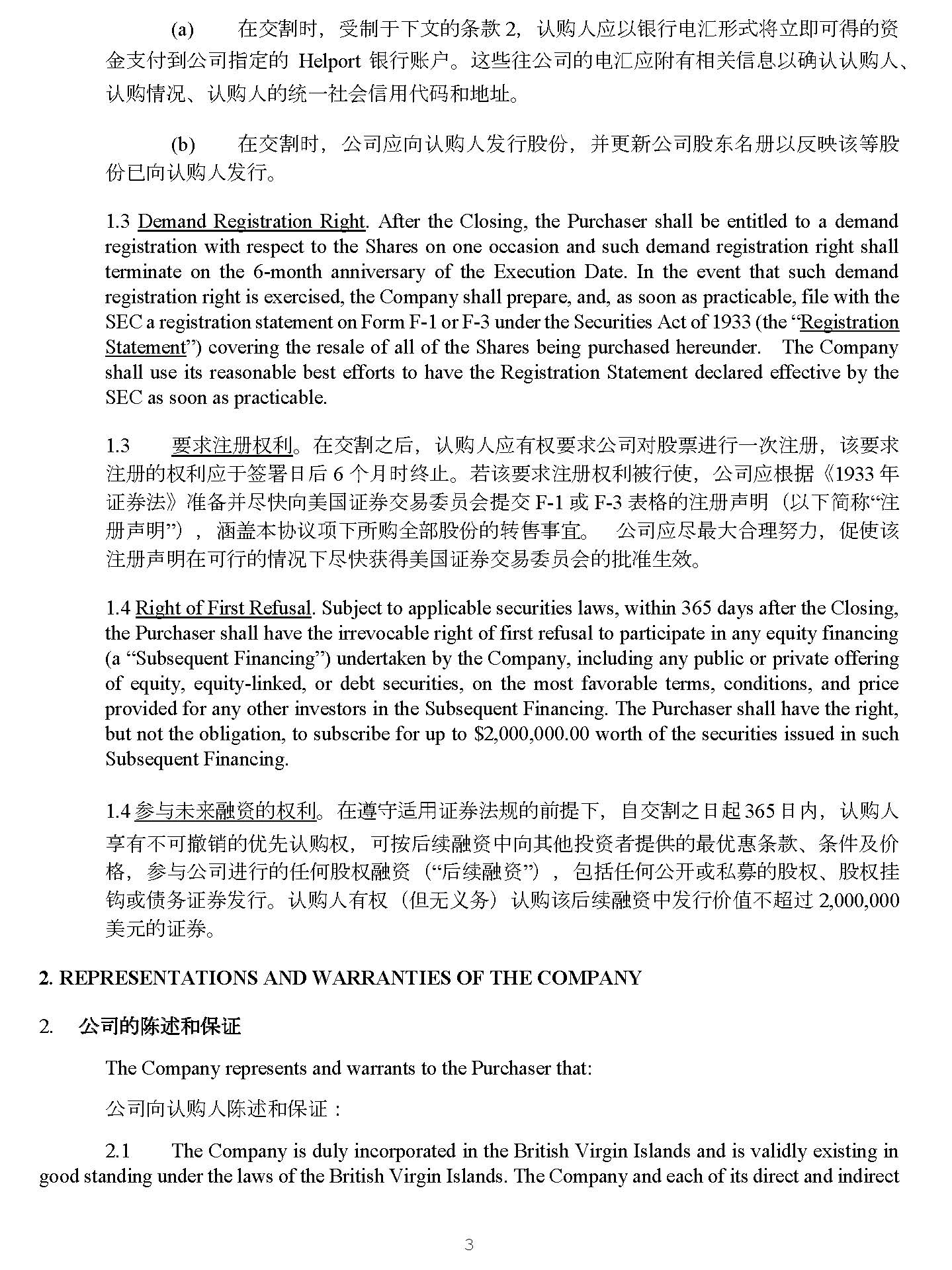 3 4928 - 2523 - 4026, v. 8 (b) ൘Ӕࢢᰦ ˈ ޜਨᓄੁ䇔䍝Ӫਁ㹼㛑ԭ ˈ ᒦᴤᯠޜਨ㛑ьԕ৽᱐䈕ㅹ㛑 ԭᐢੁ䇔䍝Ӫਁ㹼 DŽ 1 . 3 Demand Registration Right . After the Closing, the Purchaser shall be entitled to a demand registration with respect to the Shares on one occasion and such demand registration right shall terminate on the 6 - month anniversary of the Execution Date . In the event that such demand registration right is exercised, the Company shall prepare, and, as soon as practicable, file with the SEC a registration statement on Form F - 1 or F - 3 under the Securities Act of 1933 (the “ Registration Statement ”) covering the resale of all of the Shares being purchased hereunder . The Company shall use its reasonable best efforts to have the Registration Statement declared effective by the SEC as soon as practicable . 3. 㾱≲⌘ᵳ࡙ DŽ ൘Ӕࢢѻਾ ˈ 䇔䍝Ӫᓄᴹᵳ㾱≲ޜਨሩ㛑⾘䘋㹼а⅑⌘ ˈ 䈕㾱≲ ⌘Ⲵᵳ࡙ᓄҾㆮ㖢ᰕਾ 6 њᴸᰦ㓸→ DŽ 㤕䈕㾱≲⌘ᵳ࡙㻛㹼֯ ˈ ޜਨᓄṩᦞ lj 1 933 ᒤ 䇱ࡨ⌅ NJ ߶༷ᒦቭᘛੁ㖾ഭ䇱ࡨӔ᱃ငઈՊᨀӔ F - 1 ᡆ F - 3 㺘ṬⲴ⌘༠᰾ ˄ ԕлㆰ〠 “ ⌘ ༠᰾ ” ˅ ˈ ⏥ⴆᵜॿ䇞亩лᡰ䍝ޘ䜘㛑ԭⲴ䖜һᇌ DŽ ޜਨᓄቭᴰབྷਸ⨶ࣚ࣋ ˈ ׳֯䈕 ⌘༠᰾൘ਟ㹼Ⲵᛵߥлቭᘛ㧧ᗇ㖾ഭ䇱ࡨӔ᱃ငઈՊⲴᢩ߶⭏᭸ DŽ 4. Right of First Refusal . Subject to applicable securities laws, within 365 days after the Closing, the Purchaser shall have the irrevocable right of first refusal to participate in any equity financing (a “Subsequent Financing”) undertaken by the Company, including any public or private offering of equity, equity - linked, or debt securities, on the most favorable terms, conditions, and price provided for any other investors in the Subsequent Financing . The Purchaser shall have the right, but not the obligation, to subscribe for up to $ 2 , 000 , 000 . 00 worth of the securities issued in such Subsequent Financing . 1 . 4 ৲оᵚᶕ㶽䍴Ⲵᵳ࡙ DŽ ൘䚥ᆸ䘲⭘䇱ࡨ⌅㿴Ⲵࡽᨀл ˈ 㠚Ӕࢢѻᰕ䎧 3 65 ᰕ ˈ 䇔䍝Ӫ ӛᴹнਟ䬰ⲴՈݸ䇔䍝ᵳ ˈ ਟ᤹ਾ㔝㶽䍴ѝੁަԆᣅ䍴㘵ᨀⲴᴰՈᜐᶑⅮ ǃ ᶑԦ৺ԧ Ṭ ˈ ৲оޜਨ䘋㹼Ⲵԫօ㛑ᵳ㶽䍴 ˄ “ ਾ㔝㶽䍴 ” ˅ ˈ वᤜԫօޜᔰᡆ⿱एⲴ㛑ᵳ ǃ 㛑ᵳᤲ 䫙ᡆ٪࣑䇱ࡨਁ㹼 DŽ 䇔䍝Ӫᴹᵳ ˄ նᰐѹ࣑ ˅ 䇔䍝䈕ਾ㔝㶽䍴ѝਁ㹼ԧ٬н䎵䗷 2 , 000 , 000 㖾ݳⲴ䇱ࡨ DŽ 2. REPRESENTATIONS AND WARRANTIES OF THE COMPANY 2. ㏽㔗䉵 䱸 䬆㕒㍃ 䇱 The Company represents and warrants to the Purchaser that: ޜਨੁ䇔䍝Ӫ䱸䘠઼؍䇱 ˖ 1. The Company is duly incorporated in the British Virgin Islands and is validly existing in good standing under the laws of the British Virgin Islands . The Company and each of its direct and indirect subsidiaries that have been consolidated with the Company in its audited financial statements for the year ended June 30 , 2024 or any such entity subsequently acquired (each, a “Subsidiary”, and collectively, the “Subsidiaries”) are not in violation of any of the provisions of their respective articles of incorporation, by - laws or other organizational or charter documents, each as amended where applicable (the “ Internal Documents ”) . Each of the Company and Subsidiaries is qualified to transact business as a foreign