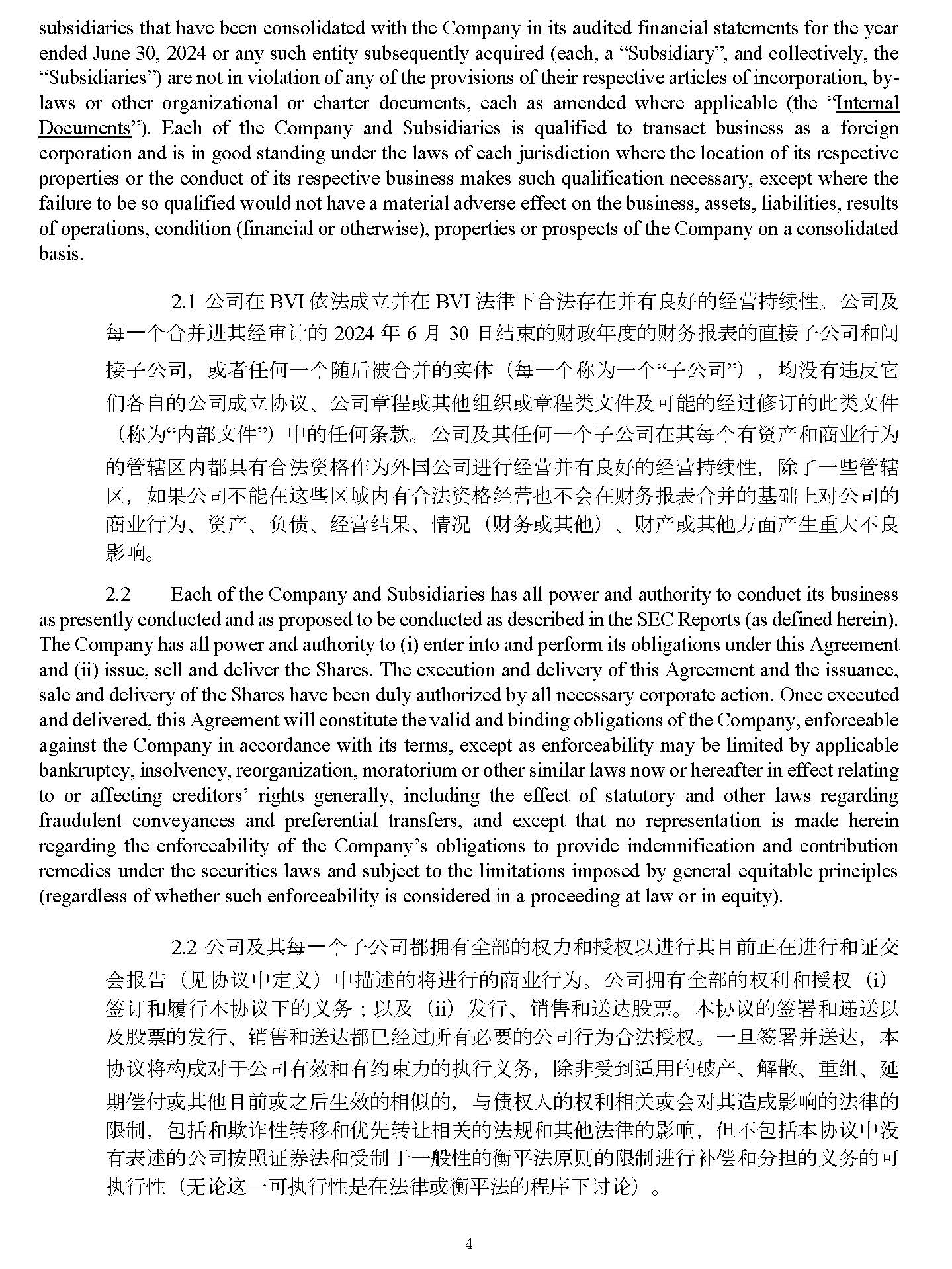 4 foreign corporation and is in good standing under the laws of each jurisdiction where the location of its respective properties or the conduct of its respective business makes such qualification necessary, except where the failure to be so qualified would not have a material adverse effect on the business, assets, liabilities, results of operations, condition (financial or otherwise), properties or prospects of the Company on a consolidated basis . 1. ⅓ ਨ ✏ BVI ᾄ㲼 ᡀ 狏 ᒦ ✏ BVI 㲼⽲ᷲ ਸ 㲼⬿✏ ᒦ 㛰 㢟ྭ 䙫 㓿㩕 ᤱ 㔝 ᙗ DŽ ⅓ ਨ ⎱ 㮶ᷧ њ ਸ ᒦ䘋 ⅝ 㓿ᇑ䇑 䙫 2024 ⹛ 6 㛯 30 㗌 㔃 㝆䙫 䍒 㔦⹛⺍䙫 䍒࣑ᣕ 塏䙫䛛 ᧕ ⬷⅓ ਨ઼ 䰤 ᧕ ⬷⅓ ਨ ˈ ᡆ 俬ỢἼᷧ њ䲿 ਾ 墒 ਸ ᒦ 䙫 ᇎ Ἲ ˄ 㮶ᷧ њ〠Ѫ ᷧ њ “ ⬷⅓ ਨ ” ˅ˈ ✮ ⋑ 㛰 䘍 ⎴ ᆳԜ 凑䙫⅓ ਨᡀ 狏 ॿ䇞 ǃ ⅓ ਨ 䫇 〻ᡆ ⅝ẽ 㓴㓷 ᡆ 䫇 〻 ㊫ 狄ờ⎱ ਟ 僤䙫 㓿䗷 ؞ 䇒 䙫㭋 ㊫ 狄ờ ˄ 〠Ѫ “ 惏狄ờ ” ˅ Ḕ䙫ỢἼ ᶑ 㬥 DŽ ⅓ ਨ ⎱⅝ỢἼᷧ њ ⬷⅓ ਨ ✏⅝㮶 њ 㛰 䍴ӗ ઼୶ ъ 堳 Ѫ 䙫 ㇑ 䗆४ 惤 ާ 㛰 ਸ 㲼 䍴 Ṭ ὃ Ѫ ⣽ ഭ ⅓ ਨ 䘋 堳 㓿㩕ᒦ 㛰 㢟ྭ 䙫 㓿㩕 ᤱ 㔝 ᙗ ˈ 䲔 ṭᷧẂ ㇑ 䗆 ४ ˈ ྲ 㞃⅓ ਨ ᷴ僤✏ 䘉 Ẃ ४ ⟆ 㛰 ਸ 㲼 䍴 Ṭ 㓿㩕 Ṇᷴ Պ ✏ 䍒࣑ᣕ 塏 ਸ ᒦ 䙫⟡ ᷱ ሩ ⅓ ਨ 䙫 ୶ ъ 堳 Ѫ ǃ 䍴ӗ ǃ 䍏٪ ǃ 㓿㩕㔃 㞃 ǃ ᛵ ߥ ˄ 䍒࣑ ᡆ ⅝ẽ ˅ ǃ 䍒ӗ ᡆ ⅝ẽ㖠杉 ӗ 䔆憴 ⤎ᷴ 㢟 ⽘ ૽ DŽ 2. Each of the Company and Subsidiaries has all power and authority to conduct its business as presently conducted and as proposed to be conducted as described in the SEC Reports (as defined herein) . The Company has all power and authority to (i) enter into and perform its obligations under this Agreement and (ii) issue, sell and deliver the Shares . The execution and delivery of this Agreement and the issuance, sale and delivery of the Shares have been duly authorized by all necessary corporate action . Once executed and delivered, this Agreement will constitute the valid and binding obligations of the Company, enforceable against the Company in accordance with its terms, except as enforceability may be limited by applicable bankruptcy, insolvency, reorganization, moratorium or other similar laws now or hereafter in effect relating to or affecting creditors’ rights generally, including the effect of statutory and other laws regarding fraudulent conveyances and preferential transfers, and except that no representation is made herein regarding the enforceability of the Company’s obligations to provide indemnification and contribution remedies under the securities laws and subject to the limitations imposed by general equitable principles (regardless of whether such enforceability is considered in a proceeding at law or in equity) . 3. ⅓ ਨ ⎱⅝㮶ᷧ њ ⬷⅓ ਨ 惤 ᤕ 㛰 ޘ 惏䙫 ᵳ ⊂ ઼ᦸ ᵳ Ọ 䘋 堳⅝䛕∴㭊✏ 䘋 堳 ઼ 䇱 ẋ Պᣕ ˄ 㿱ॿ䇞 Ḕ⮁ ѹ ˅ Ḕ ᧿䘠 䙫 ሶ䘋 堳䙫 ୶ ъ 堳 Ѫ DŽ ⅓ ਨ ᤕ 㛰 ޘ 惏䙫 ᵳ ∐ ઼ᦸ ᵳ ˄ i ˅ ㆮ 䇒 ઼ን 堳㜓 ॿ䇞 ᷲ䙫 ѹ࣑ ˗ Ọ⎱ ˄ ii ˅ ਁ 堳 ǃ 䬰 ઼䘱 䗮 傈䥏 DŽ 㜓 ॿ䇞 䙫 ㆮ 㖢઼ 䙂 䘱 Ọ⎱傈 䥏䙫 ਁ 堳 ǃ 䬰 ઼䘱 䗮 惤ⷙ 㓿䗷 ᡰ 㛰⾬奨䙫⅓ ਨ 堳 Ѫ ਸ 㲼 ᦸ ᵳ DŽ ᷧ㗍 ㆮ 㖢 ᒦ 䘱 䗮 ˈ 㜓 ॿ䇞 ሶᶴ ᡀ ሩ ṵ⅓ ਨ 㛰㔯 ઼ 㛰 㓖 㝆⊂䙫 ᢗ 堳 ѹ࣑ ˈ 䲔 狠⎾∗ 䘲 䔏䙫 ӗ ǃ 姊㕊 ǃ 憴 㓴 ǃ ⻝㜆 گ ế ᡆ ⅝ẽ䛕∴ ᡆ Ḳ ਾ 䔆㔯䙫䛟ἣ䙫 ˈ о٪ᵳ ạ䙫 ᵳ ∐䛟 ޣ ᡆ Պሩ ⅝ 䙐ᡀ ⽘ ૽ 䙫㲼⽲䙫 䲀 ∝ ˈ ⋬ ᤜ઼ 㬡 䇸 ᙗ 䖜 䧢 ઼ Ո ℯ 䖜䇙 䛟 ޣ 䙫㲼 㿴 ઼ ⅝ẽ㲼⽲䙫⽘ ૽ ˈ Ἥᷴ⋬ ᤜ 㜓 ॿ䇞 Ḕ ⋑ 㛰塏 䘠 䙫⅓ ਨ᤹➗ 䇱 ∟㲼 ઼ ⎾∝ṵᷧ 㡜ᙗ 䙫塈⹚㲼⎆ ࡉ 䙫 䲀 ∝ 䘋 堳 㺕گ ઼ ⇭ ᣵ 䙫 ѹ࣑ 䙫 ਟ ᢗ 堳 ᙗ ˄ 㗇 䇪䘉 ᷧ ਟ ᢗ 堳 ᙗ 㘖✏㲼⽲ ᡆ 塈⹚㲼䙫 〻 ᷲ 䇘䇪 ˅ DŽ 3. The Shares will be duly and validly issued, fully paid and non - assessable, and free from all taxes or liens with respect to the issuance thereof and shall not be subject to preemptive rights, rights of first refusal and/or other similar rights of shareholders of the Company and/or any other person . 2.3 傈䥏 ሶ 㘖 ਸ 㲼㛰㔯 ਁ 堳䙫 ǃ 㕤 嶚傈㬥 ᒦ ᷴ⊇ 㕤 䙫 ˈ ᷻ ⋑ 㛰 ᡰ 㛰 ઼ ਁ 堳㛰 ޣ 䙫 〾