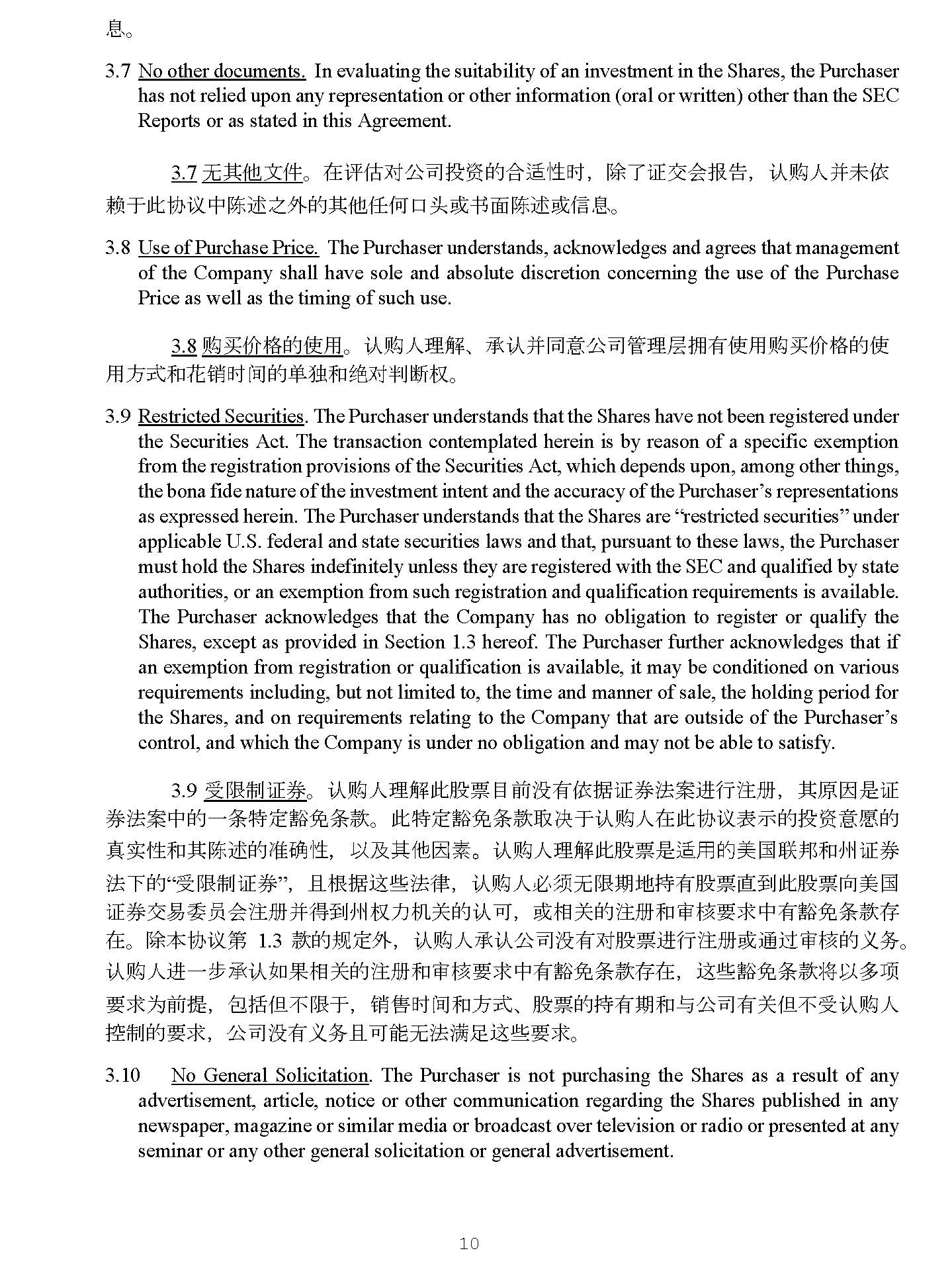 9 4928 - 2523 - 4026, v. 8 venture having the risks and objectives of the Company, including a risk of total loss of such investment . The Purchaser must bear the substantial economic risks of the investment in the Shares indefinitely because none of the Shares may be sold, hypothecated or otherwise disposed of unless subsequently registered under the Securities Act and applicable state securities laws or an exemption from such registration(s) are available . The Purchaser represents that it is able to bear the economic risk of an investment in the Shares and is able to afford a complete loss of such investment . 5. 仾䲙ᣵ㜭࣋ DŽ 䇔䍝Ӫ⨶䀓ᒦ਼ሩ↔㛑⾘Ⲵ䍝Ҡᱟާᴹ儈仾䲙Ⲵᣅ䍴 ˈ 䇔䍝 Ӫᴹ㜭࣋᭟Ԉᒦᣵ൘ާᴹᵜޜਨ仾䲙઼ⴞḷⲴᣅᵪᙗԱъѝⲴᣅ䍴 ˈ वᤜ䈕ᣅ䍴ᆼޘᦏ ཡⲴ仾䲙 DŽ 䇔䍝Ӫᗵ享ᰐ䲀ᵏൠᣵ൘ᵜ㛑⾘ѝᣅ䍴ⲴᖃⲴ㓿⍾仾䲙 ˈ ഐѪ䲔䶎ѻਾᵜ 㛑⾘᤹➗䇱ࡨ⌅Ṹᡆᐎ䇱ࡨ⌅䘋㹼⌘ᡆ䘲⭘Ҿ䘉Ӌ⌘ޣⲴ䉱ݽᶑⅮᆈ൘ ˈ 㛑⾘ᰐ⌅ 㻛䬰 ǃ ᣥᣬᡆԕަԆᖒᔿ༴㖞 DŽ 䇔䍝Ӫ㺘⽪ᴹ㜭࣋ᣵҾ↔㛑⾘ѝⲴᣅ䍴ᒦᴹ㜭࣋䍏ᣵ ↔ᣅ䍴Ⲵᆼޘᦏཡ DŽ 6. Disclosure of Information . The Purchaser has been given access to full and complete information regarding the Company and has utilized such access to the Purchaser’s satisfaction for the purpose of obtaining such information regarding the Company as the Purchaser has reasonably requested . In particular, the Purchaser : (i) has received and thoroughly read and evaluated all the disclosures contained in this Agreement ; and (ii) has been given a reasonable opportunity to review such documents as the Purchaser has requested and to ask questions of, and to receive answers from, representatives of the Company concerning the terms and conditions of the Shares and the business and affairs of the Company and to obtain any additional information concerning the Company’s business to the extent reasonably available so as to understand more fully the nature of this investment and to verify the accuracy of the information supplied . The Purchaser is satisfied that it has received adequate information with respect to all matters which he/she/it considers material to its decision to make this investment . 6. ؑᣛ䵢 DŽ 䇔䍝Ӫᐢ㧧ਆޣҾޜਨޘ䜘઼ᆼᮤⲴؑ䚃 ˈ фᐢԕ䇔䍝Ӫਟਸ ⨶㾱≲㧧ਆޣҾޜਨⲴ䘉ӋؑѪⴞⲴ㘼֯⭘Ҷ䈕䚃 DŽ ⢩࡛Ⲵ ˈ 䇔䍝Ӫ ˖ ˄ i ˅ ᐢ᭦ࡠ ᒦᆼᮤ䰵䈫઼䇴ՠҶᵜॿ䇞ѝⲴᡰᴹᣛ䵢 ˗ ᒦ ˄ ii ˅ ᗇࡠਸ⨶ⲴᵪՊԕᇑ䰵䇔䍝Ӫ㾱≲Ⲵ ᮷Ԧᒦ䈒䰞ޣҾ㛑⾘ᶑⅮ઼ᶑԦԕ৺ޜਨⲴ㓿㩕઼һ࣑ޣⲴ䰞仈 ˈ 䇔䍝ӪᐢӾޜਨԓ㺘 ༴ᗇࡠҶ䘉Ӌ䰞仈Ⲵ䀓ㆄ ˈ ҏᗇࡠਸ⨶ⲴᵪՊ㧧ਆਸ⨶ᆈ൘ⲴޣҾޜਨ㓿㩕Ⲵ仍ཆؑ DŽ 䇔䍝ӪᗇࡠⲴ䘉Ӌ仍ཆؑ䏣ԕ֯ަሩ↔ᣅ䍴Ⲵᙗ䍘઼ᗇࡠⲴؑⲴ߶⺞ᙗ䘋㹼䘋а↕Ⲵ ⨶䀓 DŽ 䇔䍝Ӫ㺘⽪ަᐢ㓿㧧ᗇҶަ䇔Ѫо↔ᣅ䍴ߣᇊᴹ䟽བྷ㚄㌫ⲴᡰᴹһᇌᴹޣⲴ䏣ཏؑ DŽ 7. No other documents . In evaluating the suitability of an investment in the Shares, the Purchaser has not relied upon any representation or other information (oral or written) other than the SEC Reports or as stated in this Agreement . 7. ᰐަԆ᮷Ԧ DŽ ൘䇴ՠሩޜਨᣅ䍴Ⲵਸ䘲ᙗᰦ ˈ 䲔Ҷ䇱ӔՊᣕ ˈ 䇔䍝Ӫᒦᵚ 䎆Ҿ↔ॿ䇞ѝ䱸䘠ѻཆⲴަԆԫօਓཤᡆҖ䶒䱸䘠ᡆؑ DŽ 8. Use of Purchase Price . The Purchaser understands, acknowledges and agrees that management of the Company shall have sole and absolute discretion concerning the use of the Purchase Price as well as the timing of such use .