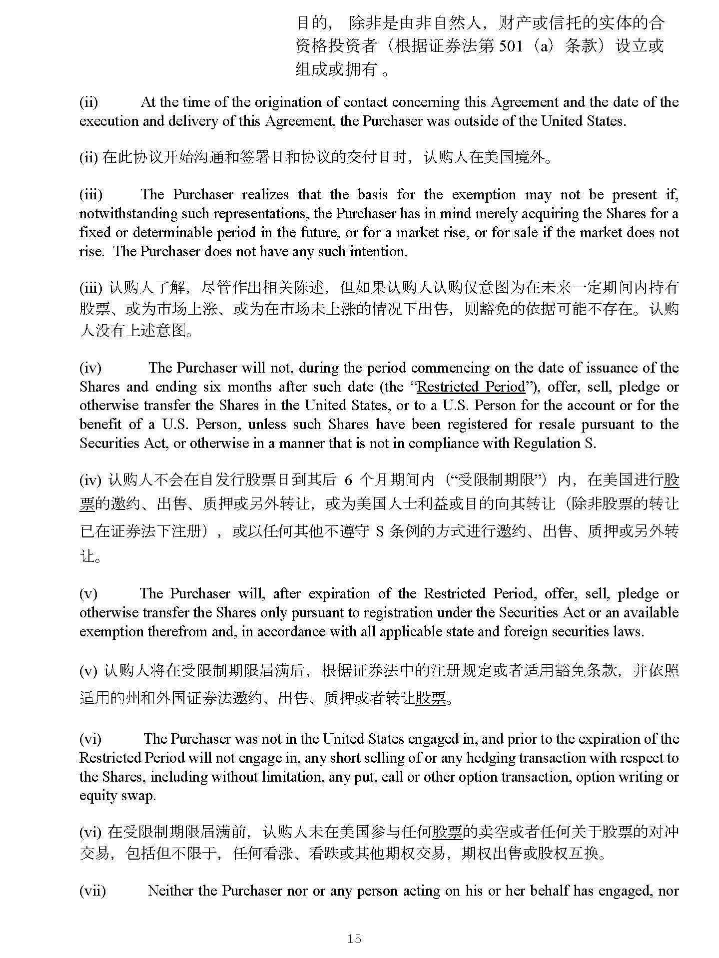 15 notwithstanding such representations, the Purchaser has in mind merely acquiring the Shares for a fixed or determinable period in the future, or for a market rise, or for sale if the market does not rise . The Purchaser does not have any such intention . (iii) 䇔䍝 ạṭ姊 ˈ ቭ ㇑ ὃ⇡䛟 ޣ䱸 䘠 ˈ Ἥ ྲ 㞃 䇔䍝 ạ 䇔䍝ӵ മѪ ✏㜑 ᶕ ᷧ⮁㜆 䰤 ᤱ 㛰 傈䥏 ǃ ᡆ Ѫ ⷩ ൪ ᷱ ⏘ ǃ ᡆ Ѫ ✏ⷩ ൪ 㜑ᷱ ⏘ 䙫 ᛵ ߥ ᷲ⇡ ˈ ࡉ 䉱 ℴ䙫ᾄ ᦞਟ 僤ᷴ⬿✏ DŽ 䇔䍝 ạ ⋑ 㛰ᷱ 䘠 മ DŽ (iv) The Purchaser will not, during the period commencing on the date of issuance of the Shares and ending six months after such date (the “ Restricted Period ”), offer, sell, pledge or otherwise transfer the Shares in the United States, or to a U . S . Person for the account or for the benefit of a U . S . Person, unless such Shares have been registered for resale pursuant to the Securities Act, or otherwise in a manner that is not in compliance with Regulation S . (v) 䇔䍝 ạᷴ Պ ✏凑 ਁ 堳傈䥏㗌∗⅝ ਾ 6 њ 㛯㜆 䰤 ˄ “ ⎾ 䲀 ∝㜆 䲀 ” ˅ ˈ ✏併 ഭ䘋 堳 傈 䥏 䙫 䚰 㓖 ǃ ⇡ ǃ 䍘 ᣬᡆ ⏍⣽ 䖜䇙 ˈ ᡆ Ѫ 併 ഭ ạ⣒∐䚱 ᡆ 䛕䙫 ੁ ⅝ 䖜䇙 ˄ 䲔 狠傈䥏䙫 䖜䇙 ⷙ✏ 䇱 ∟㲼ᷲ㳏 ˅ˈ ᡆ ỌỢἼ⅝ẽᷴ 䚥 ⭯ S ᶑ ὲ䙫㖠 䘋 堳 䚰 㓖 ǃ ⇡ ǃ 䍘 ᣬᡆ ⏍⣽ 䖜 䇙 DŽ (v) The Purchaser will, after expiration of the Restricted Period, offer, sell, pledge or otherwise transfer the Shares only pursuant to registration under the Securities Act or an available exemption therefrom and, in accordance with all applicable state and foreign securities laws . (vi) 䇔䍝 ạ ሶ ✏⎾ 䲀 ∝㜆 䲀 ቺ┑ ਾ ˈ ṩᦞ 䇱 ∟㲼Ḕ䙫㳏 㿴 ⮁ ᡆ 俬 䘲 䔏 䉱 ℴ ᶑ 㬥 ˈ ᒦ ᾄ ➗ 䘲 䔏䙫ⷅ ઼ ⣽ ഭ䇱 ∟㲼 䚰 㓖 ǃ ⇡ ǃ 䍘 ᣬᡆ 俬 䖜䇙 傈䥏 DŽ (vii) The Purchaser was not in the United States engaged in, and prior to the expiration of the Restricted Period will not engage in, any short selling of or any hedging transaction with respect to the Shares, including without limitation, any put, call or other option transaction, option writing or equity swap . (viii) ✏⎾ 䲀 ∝㜆 䲀 ቺ┑ ∴ ˈ 䇔䍝 ạ㜑✏併 ഭ৲о ỢἼ 傈䥏 䙫 আ 䩡 ᡆ 俬ỢἼ ޣ ṵ傈䥏䙫 ሩ ↙ ẋ㗺 ˈ ⋬ ᤜ Ἥᷴ 䲀 ṵ ˈ ỢἼ䛲 ⏘ ǃ 䛲嶳 ᡆ ⅝ẽ㜆 ᵳ ẋ㗺 ˈ 㜆 ᵳ ⇡ ᡆ 傈 ᵳ ṹ ᦒ DŽ (ix) Neither the Purchaser nor or any person acting on his or her behalf has engaged, nor will engage, in any directed selling efforts to a U . S . Person with respect to the Shares and the Purchaser and any person acting on his or her behalf have complied and will comply with the “offering restrictions” requirements of Regulation S under the Securities Act . (x) 䇔䍝 ạ ᡆ ỢἼὃ Ѫ ⅝Ị塏䙫ạ⣒ᷴ僤ⷙ ৲о ᡆ ሶ৲о ỢἼ䛛 ᧕ ሶ 傈䥏⇡ 㔉 併 ഭ ạ⣒ 䙫堳 Ѫ ˈ ᷻ 䇔䍝 ạ ઼ ỢἼὃ Ѫ ⅝Ị塏䙫ạ⣒ⷙ 䚥 ⭯ ᒦሶ 䚥 ⭯ 䇱 ∟㲼Ḕ S ᶑ ὲ䙫 “ 䚰 㓖 䲀 ∝ ” 奨㰩 DŽ (xi) The transactions contemplated by this Agreement have not been pre - arranged with a buyer located in the United States or with a U . S . Person, and are not part of a plan or scheme to evade the registration requirements of the Securities Act .