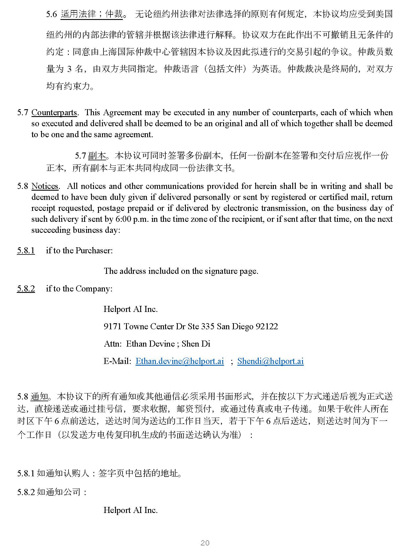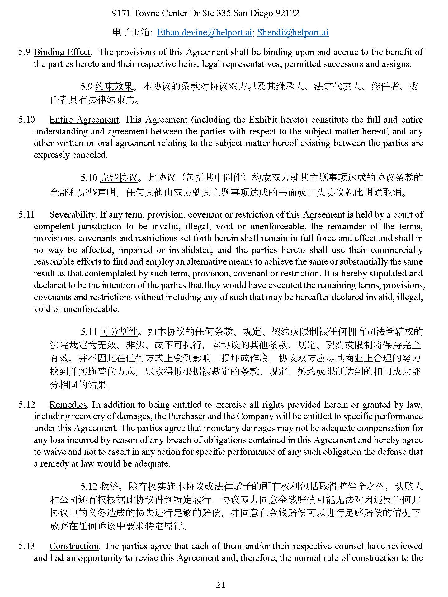 20 8. Notices . All notices and other communications provided for herein shall be in writing and shall be deemed to have been duly given if delivered personally or sent by registered or certified mail, return receipt requested, postage prepaid or if delivered by electronic transmission, on the business day of such delivery if sent by 6 : 00 p . m . in the time zone of the recipient, or if sent after that time, on the next succeeding business day : 1. if to the Purchaser: The address included on the signature page. 2. if to the Company: Helport AI Inc. 9171 Towne Center Dr Ste 335 San Diego 92122 Attn: Ethan Devine ; Shen Di E - Mail: Ethan.devine@helport.ai ; Shendi@helport.ai 8. 䙊⸕ DŽ 㜓 ॿ䇞 ᷲ䙫 ᡰ 㛰 䙊⸕ᡆ ⅝ẽ 䙊ؑ ⾬ 享 憮䔏 Җ 杉⽉ ˈ ᒦ ✏ ᤹ Ọᷲ㖠 䙂 䘱ਾ 㿶Ѫ 㭊 䘱 䗮 ˈ 䛛 ᧕ 䙂 䘱ᡆ䙊 䗷 ᤲ ਧ ؑ ˈ 奨㰩㔝 ᦞ ˈ 䛞䍴亴 ế ˈ ᡆ䙊 䗷Րⵏ ᡆ ⭥ ⬷ Ր䙂 DŽ ྲ 㞃ṵ㔝ờạ ᡰ ✏ ᰦ४ ᷲ⌯ 6 ⛩ ∴ 䘱 䗮 ˈ 䘱 䗮ᰦ䰤Ѫ 䘱 䗮 䙫ⷌὃ㗌 ᖃ ⤐ ˈ 㤕 ṵᷲ⌯ 6 ⛩ਾ䘱 䗮 ˈ ࡉ 䘱 䗮ᰦ䰤Ѫ ᷲᷧ њ ⷌὃ㗌 ˄ Ọ ਁ 䘱 㖠 ⭥Ր༽ ⍗㜡䔆 ᡀ 䙫 Җ 杉 䘱 䗮 䡕 䇔Ѫ ↭ ˅˖ 1. ྲ䙊⸕ 䇔䍝 ạ ˖ ㆮ ⬾ 亥 Ḕ⋬ ᤜ 䙫✗✧ DŽ 2. ྲ䙊⸕ ⅓ ਨ ˖ Helport AI Inc. 9171 Towne Center Dr Ste 335 San Diego 92122 ⭥ ⬷ 䛞 ㇡ : Ethan.devine@helport.ai ; Shendi@helport.ai 5.9 Binding Effect . The provisions of this Agreement shall be binding upon and accrue to the benefit of the parties hereto and their respective heirs, legal representatives, permitted successors and assigns. 9. 㓖 㝆㔯㞃 DŽ 㜓 ॿ䇞 䙫 ᶑ 㬥 ሩॿ䇞ৼ 㖠Ọ⎱⅝ 㔗 ạ ǃ 㲼⮁Ị塏ạ ǃ 㔗 Ợ俬 ǃ င Ợ俬 ާ 㛰㲼⽲ 㓖 㝆⊂ DŽ 10. Entire Agreement . This Agreement (including the Exhibit hereto) constitute the full and entire understanding and agreement between the parties with respect to the subject matter hereof, and any other written or oral agreement relating to the subject matter hereof existing between the parties are expressly canceled . 5.10 ⭳㕛 ॿ䇞 DŽ 㭋 ॿ䇞 ˄ ⋬ ᤜ ⅝Ḕ 䱴 ờ ˅ ᶴ ᡀ ৼ 㖠 ቡ ⅝Ḣ 仈 Ṳ 亩䗮 ᡀ 䙫 ॿ䇞ᶑ 㬥 䙫 ޘ 惏 ઼ ⭳㕛 ༠ 㗵 ˈ ỢἼ⅝ẽ䔘 ৼ 㖠 ቡ ⅝Ḣ 仈 Ṳ 亩䗮 ᡀ 䙫 Җ 杉 ᡆ ⏊ ཤॿ䇞 ቡ 㭋㗵䡕⎽ ⎸ DŽ
