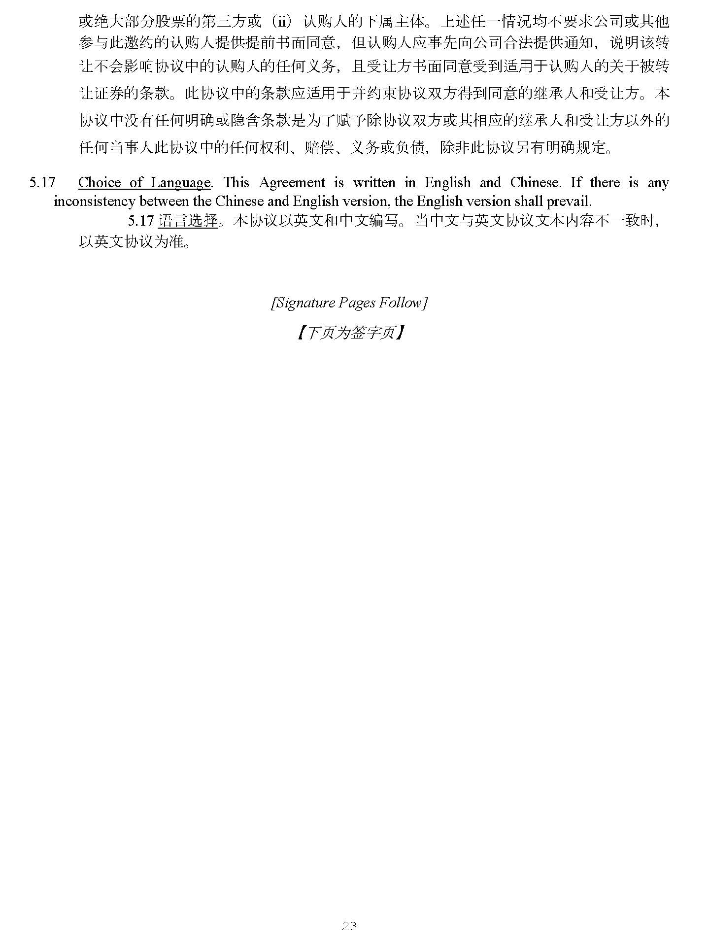 22 4928 - 2523 - 4026, v. 8 15. 䉱ݽ DŽ ॿ䇞ԫօаᯩሩᵜॿ䇞ⲴԫօᶑⅮ ǃ ᶑԦᡆ㾱≲Ⲵԫօ䉱ݽ൷нᓄ㻛㿶 ሶᶕⲴᤱ㔝ᙗ䉱ݽ ˈ ᡆሩަԆԫօᶑⅮ ǃ ᶑԦᡆ㾱≲Ⲵ䉱ݽ DŽ 㤕ॿ䇞ԫօаᯩᔦ䘏ᡆᵚ 㜭ን㹼ᵜॿ䇞ѝⲴԫօᵳ࡙ ˈ нᓄሩ↔ᵳ࡙൘ѻਾⲴን㹼൘ԫօᯩᔿк䙐ᡀᦏᇣ DŽ 16. Successors and Assigns . This Agreement may not be assigned by a party hereto without the prior written consent of the Company or the Purchaser, as applicable, provided , however , that, subject to federal and state securities laws and as otherwise provided in this Agreement, the Purchaser may assign its rights and delegate its duties hereunder in whole or in part (i) to a third party acquiring all or substantially all of its Shares in a private transaction or (ii) to an affiliate, in each case, without the prior written consent of the Company, after notice duly given by the Purchaser to the Company provided , that no such assignment or obligation shall affect the obligations of the Purchaser hereunder and that such assignee agrees in writing to be bound, with respect to the transferred securities, by the provisions hereof that apply to the Purchaser . The provisions of this Agreement shall inure to the benefit of and be binding upon the respective permitted successors and assigns of the parties . Nothing in this Agreement, express or implied, is intended to confer upon any party other than the parties hereto or their respective successors and assigns any rights, remedies, obligations or liabilities under or by reason of this Agreement, except as expressly provided in this Agreement . 16. 㔗Ӫ઼䖜䇙 DŽ ൘⋑ᴹᗇࡠॿ䇞ਖаᯩᨀࡽҖ䶒਼ൠᛵߥл ˈ ॿ䇞Ⲵԫаᯩ ൷н㜭ሶ↔ॿ䇞䘋㹼䖜䇙 DŽ նᱟṩᦞ㚄䛖઼ᐎ䇱ࡨ⌅ᒦ൘↔ॿ䇞ѝᴹ৽㿴ᇊⲴᛵߥл ˈ 䇔䍝Ӫਟԕሶަᵳ઼࡙ѹ࣑ޘ䜘ᡆ䜘࠶䖜䇙㔉 ˄ i ˅ Ӿ䇔䍝Ӫ༴䙊䗷⿱лӔ᱃㧧ᗇަޘ䜘 ᡆ㔍བྷ䜘࠶㛑⾘Ⲵㅜйᯩᡆ ˄ ii ˅ 䇔䍝ӪⲴлѫփ DŽ к䘠ԫаᛵߥ൷н㾱≲ޜਨᡆަԆ ৲о↔䚰㓖Ⲵ䇔䍝ӪᨀᨀࡽҖ䶒਼ ˈ ն䇔䍝Ӫᓄһݸੁޜਨਸ⌅ᨀ䙊⸕ ˈ 䈤᰾䈕䖜 䇙нՊᖡ૽ॿ䇞ѝⲴ䇔䍝ӪⲴԫօѹ࣑ ˈ фਇ䇙ᯩҖ䶒਼ਇࡠ䘲⭘Ҿ䇔䍝ӪⲴޣҾ㻛䖜 䇙䇱ࡨⲴᶑⅮ DŽ ↔ॿ䇞ѝⲴᶑⅮᓄ䘲⭘Ҿᒦ㓖ᶏॿ䇞ৼᯩᗇࡠ਼Ⲵ㔗Ӫ઼ਇ䇙ᯩ DŽ ᵜ ॿ䇞ѝ⋑ᴹԫօ᰾⺞ᡆ䳀ਜ਼ᶑⅮᱟѪҶ䍻Ҹ䲔ॿ䇞ৼᯩᡆަᓄⲴ㔗Ӫ઼ਇ䇙ᯩԕཆⲴ ԫօᖃһӪ↔ॿ䇞ѝⲴԫօᵳ࡙ ǃ 䎄گ ǃ ѹ࣑ᡆ䍏٪ ˈ 䲔䶎↔ॿ䇞ਖᴹ᰾⺞㿴ᇊ DŽ 17. Choice of Language . This Agreement is written in English and Chinese . If there is any inconsistency between the Chinese and English version, the English version shall prevail . 5 . 17 䈝䀰䘹ᤙ DŽ ᵜॿ䇞ԕ㤡᮷઼ѝ᮷㕆߉ DŽ ᖃѝ᮷о㤡᮷ॿ䇞᮷ᵜᇩна㠤ᰦ ˈ ԕ㤡᮷ॿ䇞Ѫ߶ DŽ [Signature Pages Follow] Ǐ л亥Ѫㆮᆇ亥 ǐ
