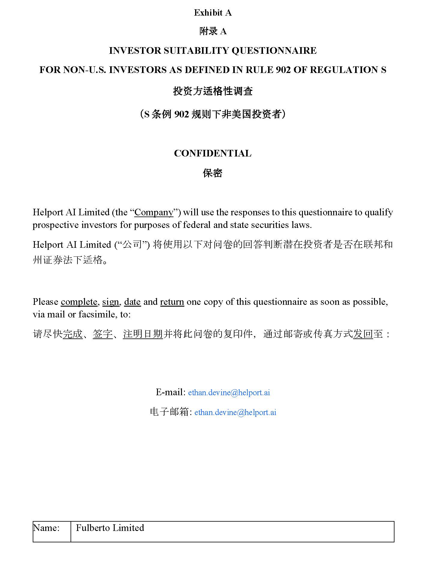 Exhibit A 䳋 ᖅ A INVESTOR SUITABILITY QUESTIONNAIRE FOR NON - U.S. INVESTORS AS DEFINED IN RULE 902 OF REGULATION S 㪺 䍴 㯧䬐㴋㦣 䈳ḕ ポ S ᶑ ㌞ 902 㿴ࡉ ㉸䵌䖤 ഭ 㪺 䍴 䗕 マ CONFIDENTIAL ㍃㟤 Helport AI Limited (the “ Company ”) will use the responses to this questionnaire to qualify prospective investors for purposes of federal and state securities laws. Helport AI Limited (“ ޜਨ ”) ሶ֯⭘ԕлሩ䰞ধⲴഎㆄࡔᯝ▌൘ᣅ䍴㘵ᱟ൘㚄䛖઼ ᐎ䇱ࡨ⌅л䘲Ṭ DŽ Please complete , sign , date and return one copy of this questionnaire as soon as possible, via mail or facsimile, to: 䈧ቭᘛ ᆼᡀ ǃ ㆮᆇ ǃ ⌘᰾ᰕᵏ ᒦሶ↔䰞ধⲴ༽ঠԦ ˈ 䙊䗷䛞ᇴᡆՐⵏᯩᔿ ਁഎ 㠣 ˖ E - mail: ethan.devine@helport.ai ⭥ᆀ䛞㇡ : ethan.devine@helport.ai Fulberto Limited Name: