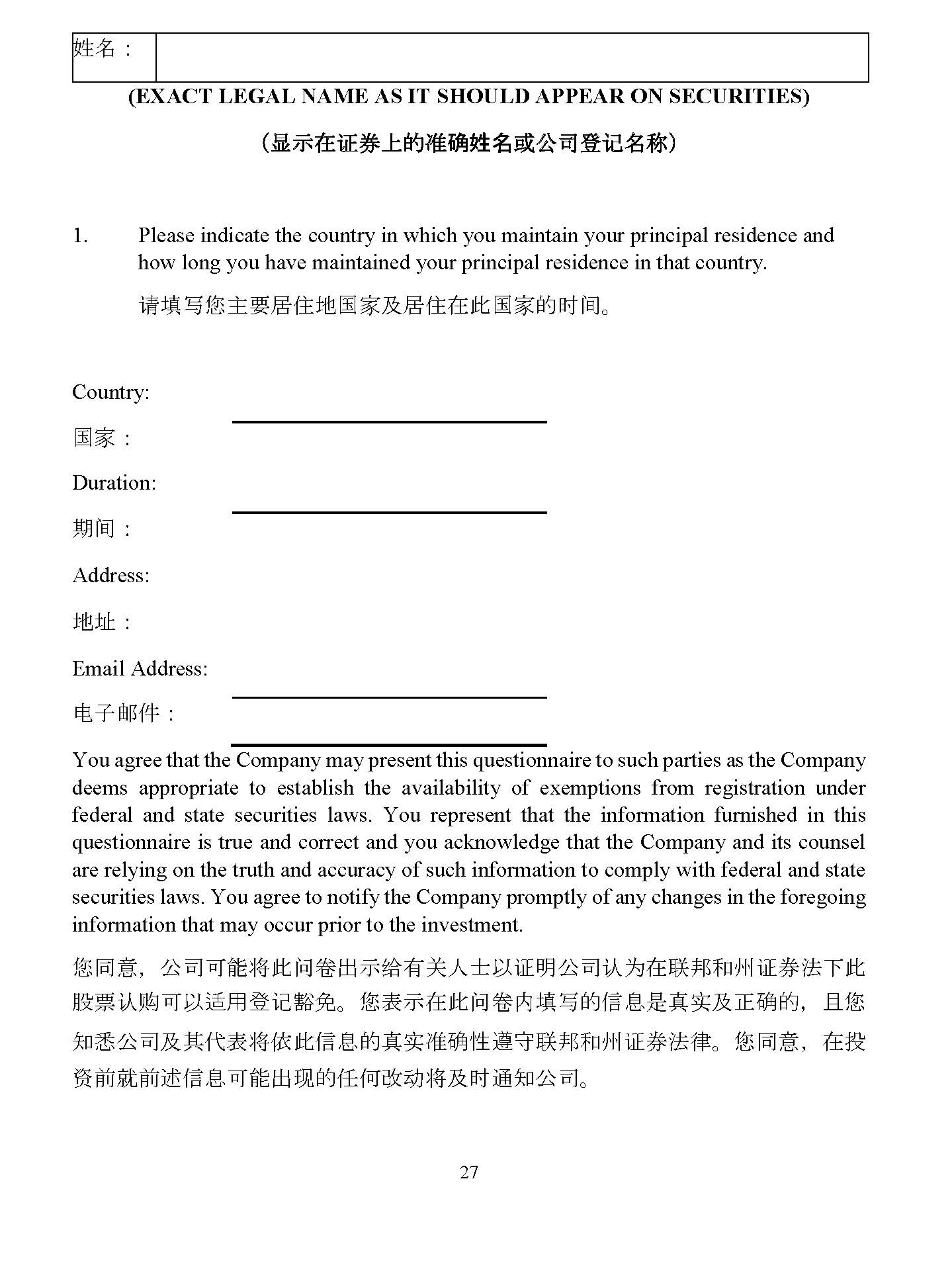 27 ဃ ˖ (EXACT LEGAL NAME AS IT SHOULD APPEAR ON SECURITIES) ポ ᱮ 䍗㘪 䇱 㑒㉷䉵㐟䌙㜨㔠 ᡆޜਨⲫ䇠〠 マ 1. Please indicate the country in which you maintain your principal residence and how long you have maintained your principal residence in that country. 䈧ປ߉ᛘѫ㾱ትտൠഭᇦ৺ትտ൘↔ഭᇦⲴᰦ䰤 DŽ Country: ഭᇦ ˖ Duration: ᵏ䰤 ˖ Address: ൠ൰ ˖ Email Address: ⭥ᆀ䛞Ԧ ˖ You agree that the Company may present this questionnaire to such parties as the Company deems appropriate to establish the availability of exemptions from registration under federal and state securities laws . You represent that the information furnished in this questionnaire is true and correct and you acknowledge that the Company and its counsel are relying on the truth and accuracy of such information to comply with federal and state securities laws . You agree to notify the Company promptly of any changes in the foregoing information that may occur prior to the investment . ᛘ਼ ˈ ޜਨਟ㜭ሶ↔䰞ধࠪ⽪㔉ᴹޣӪ༛ԕ䇱᰾ޜਨ䇔Ѫ൘㚄䛖઼ᐎ䇱ࡨ⌅л↔ 㛑⾘䇔䍝ਟԕ䘲⭘ⲫ䇠䉱ݽ DŽ ᛘ㺘⽪൘↔䰞ধປ߉Ⲵؑᱟⵏᇎ৺↓⺞Ⲵ ˈ фᛘ ⸕ᚹޜਨ৺ަԓ㺘ሶ↔ؑⲴⵏᇎ߶⺞ᙗ䚥ᆸ㚄䛖઼ᐎ䇱ࡨ⌅ᖻ DŽ ᛘ਼ ˈ ൘ᣅ 䍴ࡽቡࡽ䘠ؑਟ㜭ࠪ⧠Ⲵԫօ᭩ࣘሶ৺ᰦ䙊⸕ޜਨ DŽ 4928 - 2523 - 4026, v. 8