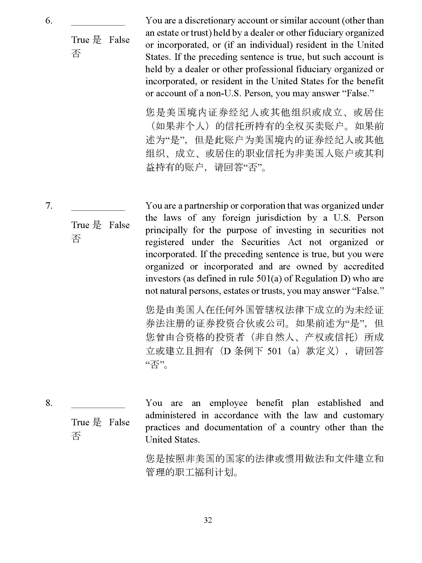4928 - 2523 - 4026, v. 8 32 States . If the preceding sentence is true, but such account is held by a dealer or other professional fiduciary organized or incorporated, or resident in the United States for the benefit or account of a non - U . S . Person, you may answer “False . ” ᛘᱟ㖾ഭຳ䇱ࡨ㓿㓚ӪᡆަԆ㓴㓷ᡆᡀ・ ǃ ᡆትտ ˄ ྲ᷌䶎њӪ ˅ ⲴؑᢈᡰᤱᴹⲴޘᵳҠআ䍖ᡧ DŽ ྲ᷌ࡽ 䘠Ѫ “ ᱟ ” ˈ նᱟ↔䍖ᡧѪ㖾ഭຳⲴ䇱ࡨ㓿㓚ӪᡆަԆ 㓴㓷 ǃ ᡀ・ ǃ ᡆትտⲴ㙼ъؑᢈѪ䶎㖾ഭӪ䍖ᡧᡆަ࡙ ⳺ᤱᴹⲴ䍖ᡧ ˈ 䈧എㆄ “ ” DŽ 7. True ᱟ False You are a partnership or corporation that was organized under the laws of any foreign jurisdiction by a U . S . Person principally for the purpose of investing in securities not registered under the Securities Act not organized or incorporated . If the preceding sentence is true, but you were organized or incorporated and are owned by accredited investors (as defined in rule 501 (a) of Regulation D) who are not natural persons, estates or trusts, you may answer “False . ” ᛘᱟ⭡㖾ഭӪ൘ԫօཆഭ㇑䗆ᵳ⌅ᖻлᡀ・ⲴѪᵚ㓿䇱 ࡨ⌅⌘Ⲵ䇱ࡨᣅ䍴ਸՉᡆޜਨ DŽ ྲ᷌ࡽ䘠Ѫ “ ᱟ ” ˈ ն ᛘᴮ⭡ਸ䍴ṬⲴᣅ䍴㘵 ˄ 䶎㠚❦Ӫ ǃ ӗᵳᡆؑᢈ ˅ ᡰᡀ ・ᡆᔪ・фᤕᴹ ˄ D ᶑֻл 501 ˄ a ˅ Ⅾᇊѹ ˅ ˈ 䈧എㆄ “ ” DŽ 8. True ᱟ False You are an employee benefit plan established and administered in accordance with the law and customary practices and documentation of a country other than the United States . ᛘᱟ᤹➗䶎㖾ഭⲴഭᇦⲴ⌅ᖻᡆᜟ⭘ڊ⌅઼᮷Ԧᔪ・઼ ㇑⨶Ⲵ㙼ᐕ⾿࡙䇑ࡂ DŽ 9. True ᱟ False You are an agency or branch of a U . S . Person located outside the United States that is (i) operated for valid business reasons ; (ii) engaged in the business of insurance or banking ;