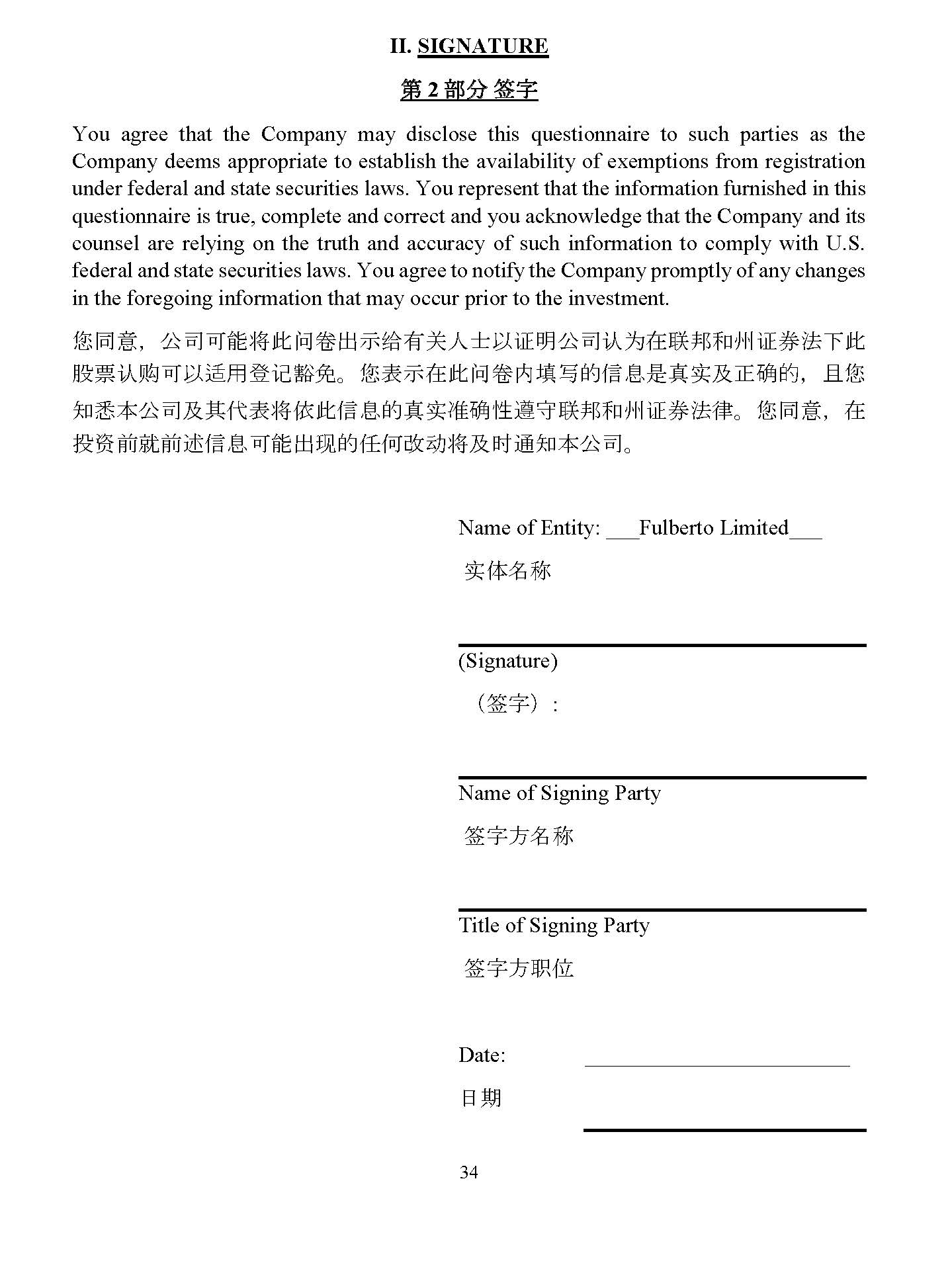 34 II. SIGNATURE 䐝 2 䭾㐻 ㆮ 㞨 You agree that the Company may disclose this questionnaire to such parties as the Company deems appropriate to establish the availability of exemptions from registration under federal and state securities laws . You represent that the information furnished in this questionnaire is true, complete and correct and you acknowledge that the Company and its counsel are relying on the truth and accuracy of such information to comply with U . S . federal and state securities laws . You agree to notify the Company promptly of any changes in the foregoing information that may occur prior to the investment . ᛘ਼ ˈ ޜਨਟ㜭ሶ↔䰞ধࠪ⽪㔉ᴹޣӪ༛ԕ䇱᰾ޜਨ䇔Ѫ൘㚄䛖઼ᐎ䇱ࡨ⌅л↔ 㛑⾘䇔䍝ਟԕ䘲⭘ⲫ䇠䉱ݽ DŽ ᛘ㺘⽪൘↔䰞ধປ߉Ⲵؑᱟⵏᇎ৺↓⺞Ⲵ ˈ фᛘ ⸕ᚹᵜޜਨ৺ަԓ㺘ሶ↔ؑⲴⵏᇎ߶⺞ᙗ䚥ᆸ㚄䛖઼ᐎ䇱ࡨ⌅ᖻ DŽ ᛘ਼ ˈ ൘ ᣅ䍴ࡽቡࡽ䘠ؑਟ㜭ࠪ⧠Ⲵԫօ᭩ࣘሶ৺ᰦ䙊⸕ᵜޜਨ DŽ Name of Entity: Fulberto Limited ᇎփ〠 (Signature) ˄ ㆮᆇ ˅ : Name of Signing Party ㆮᆇᯩ〠 Title of Signing Party ㆮᆇᯩ㙼ս Date: ᰕᵏ 4928 - 2523 - 4026, v. 8